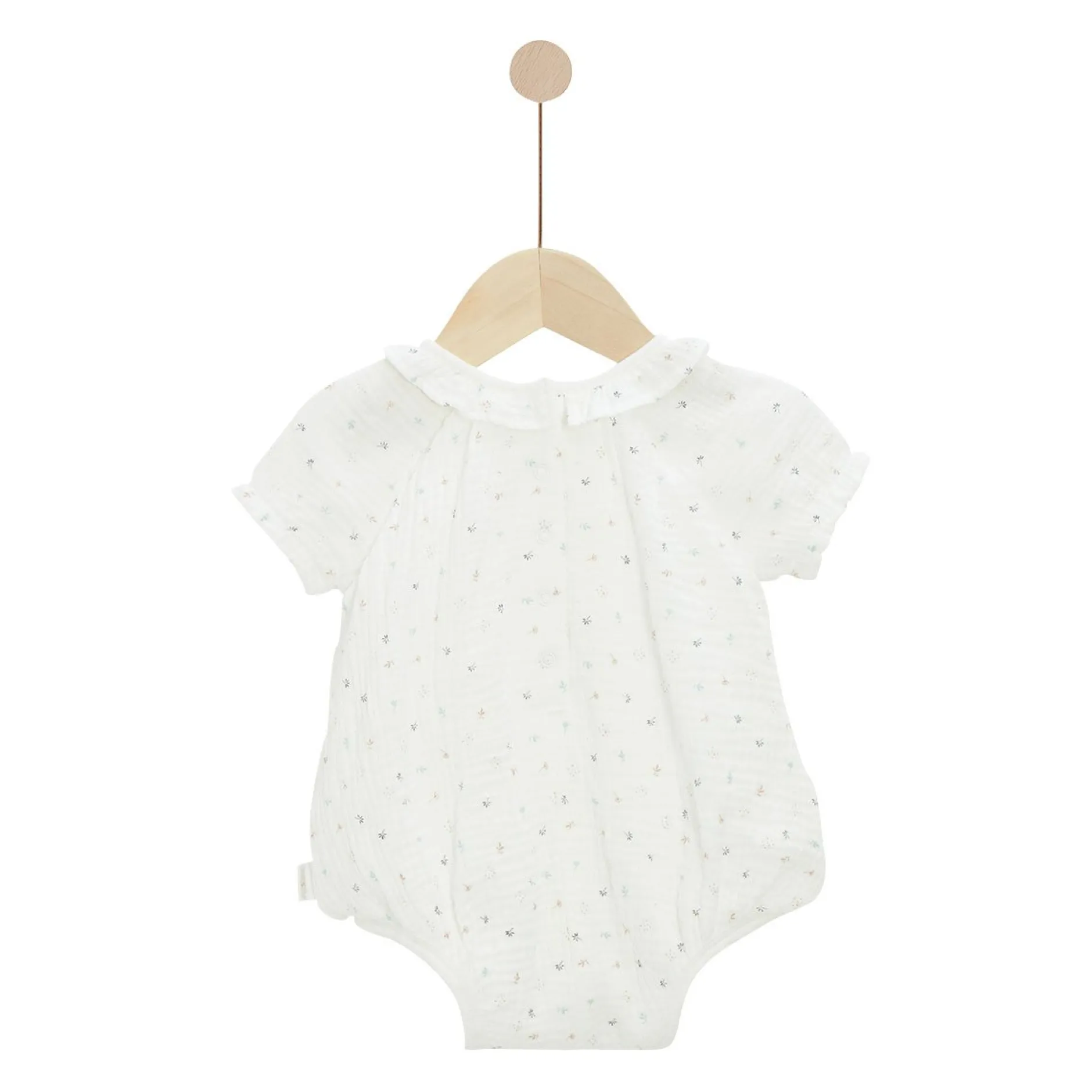 Combicourte P’tit Bisou en mousseline de gaze écru avec ses petites fleurs automnales pour vitaminer cette belle pièce ! Le produit idéal pour le plein été quand il fera bien chaud et tellement pratique avec son ouverture milieu dos et entrejambes par des pressions pour faciliter le change de bébé. Cette pièce au look un peu rétro et vintage a un côté très romantique avec son col façon « pétale de fleur » et ses manches froncées et volantées. Petite fille ressemblera à un adorable petite princesse dans cette tenue !