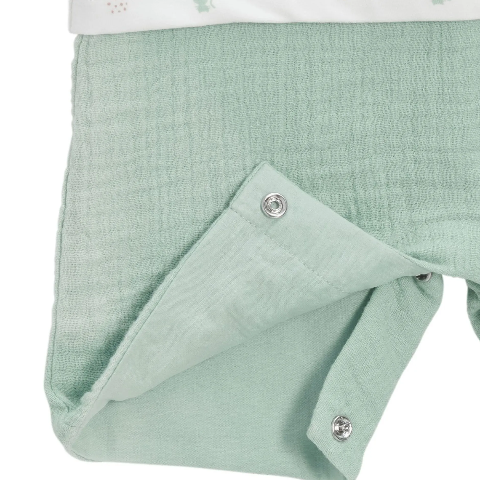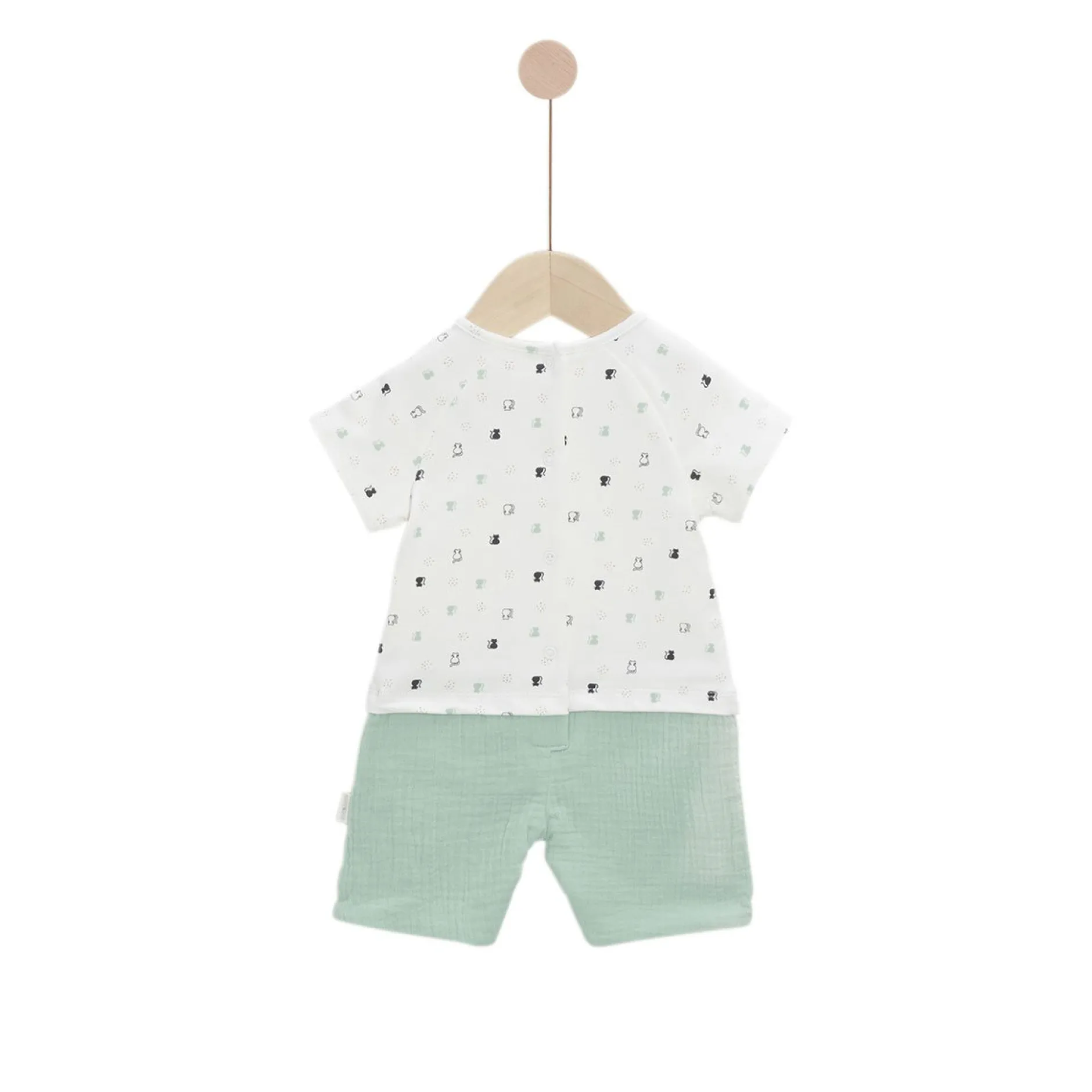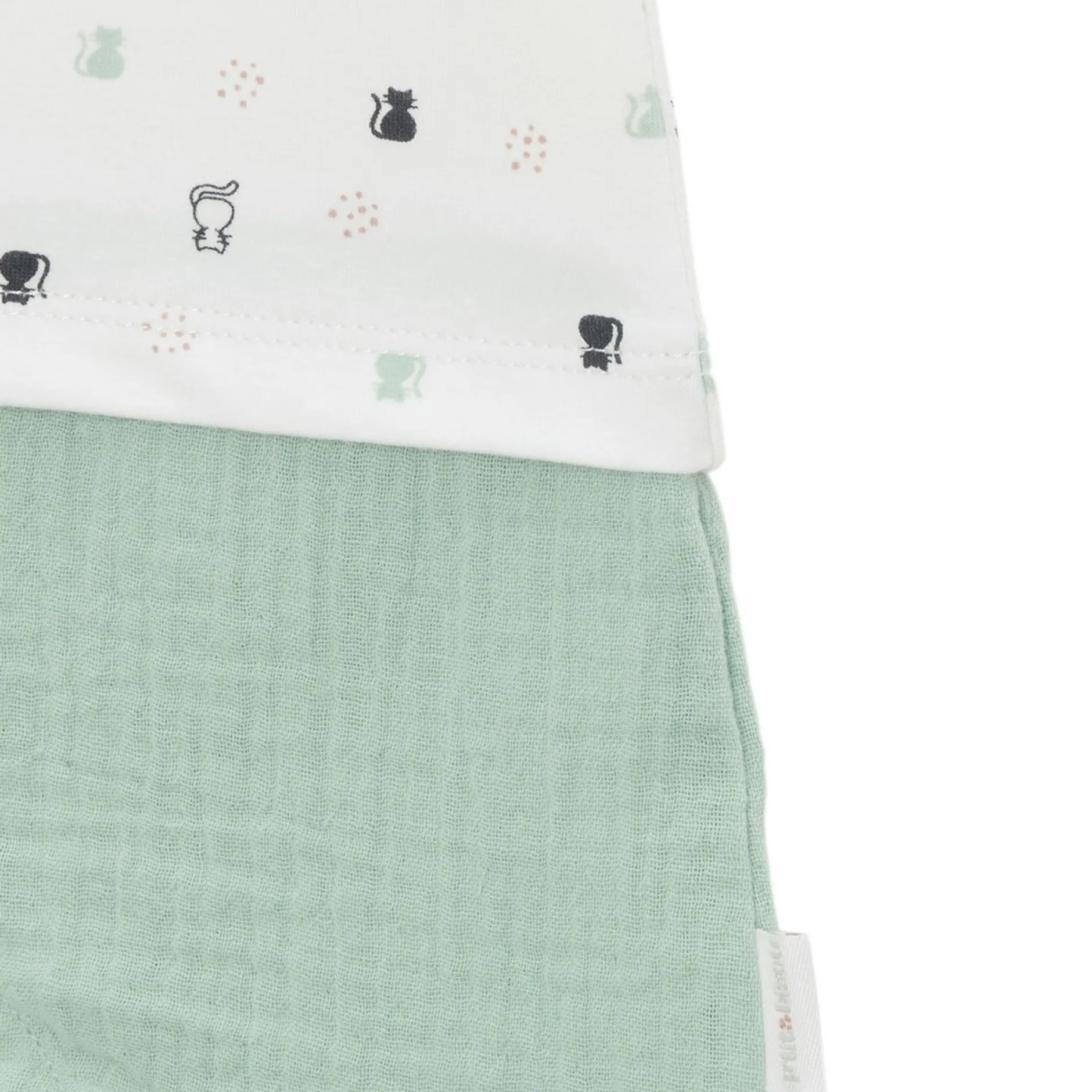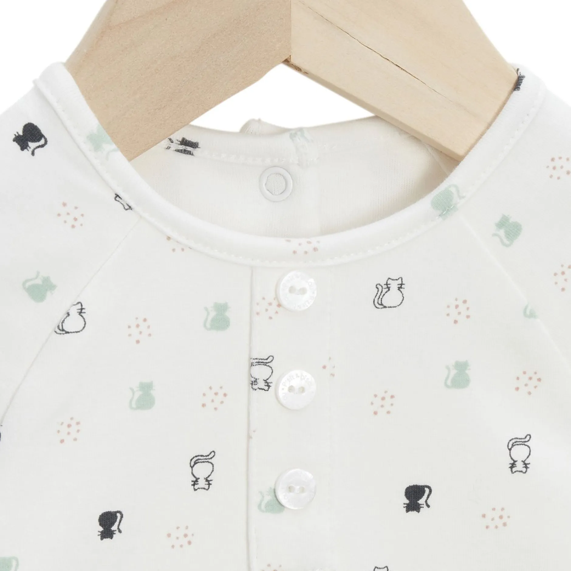 Combicourte P’tit Bisou en bi couleur avec du jersey fond écru avec imprimé « petits chats » sur le haut et jersey vert sauge sur le bas. Cette combicourte manches courtes a un effet « trompe l’œil » comme un tee shirt sur un short. La pièce idéale pour le plein été et tellement pratique avec son ouverture au dos et entrejambes pour faciliter le change de bébé. Cette pièce a un côté très mode avec sa patte polo fermée par des boutons gravées à la marque. Bébé ressemblera à un adorable petit baigneur dans cette tenue !