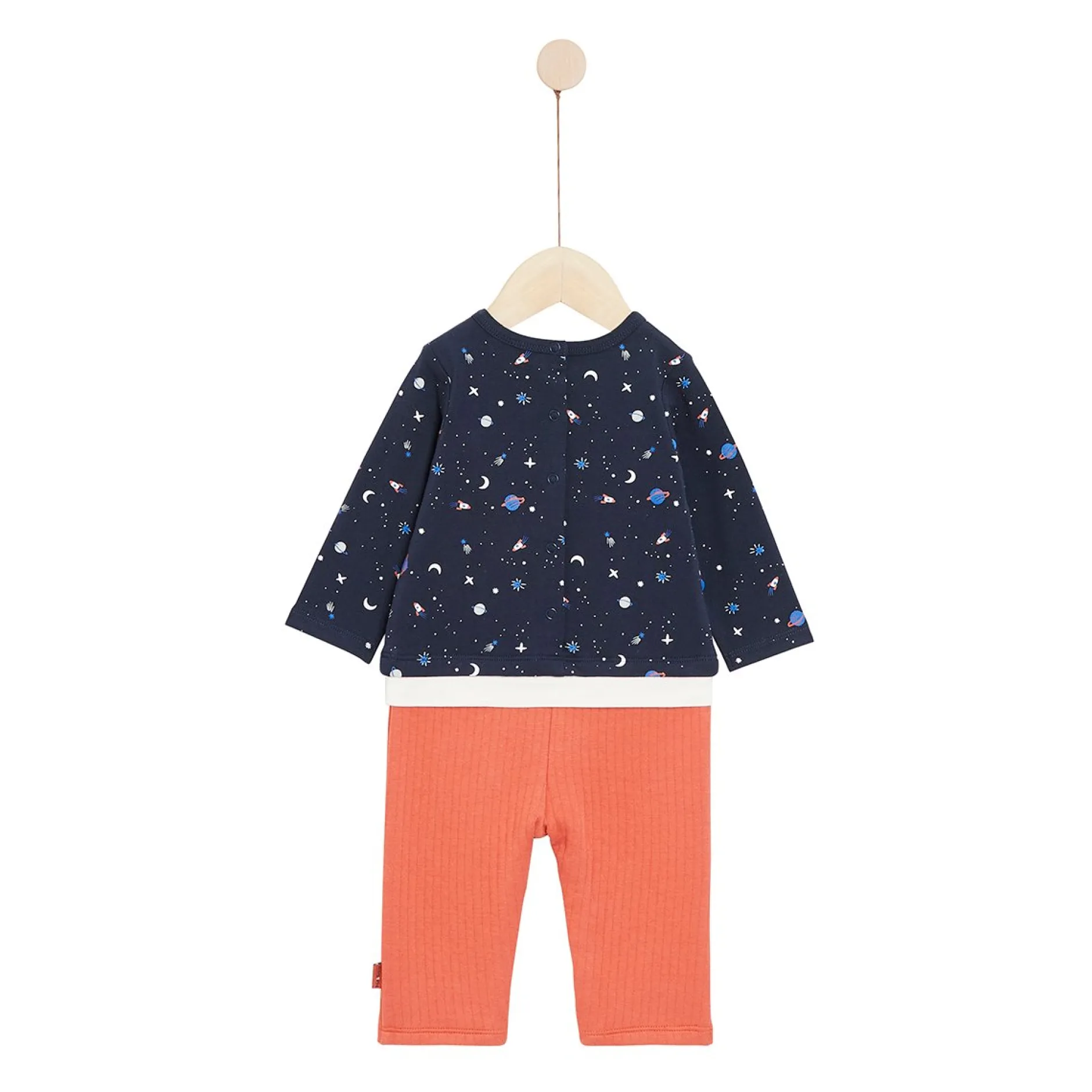 Combilongue P’tit Bisou avec le haut et le bas attenants : le haut manches longues est en jersey lycra marine avec un imprimé très tendance : la constellation avec des fusées, des étoiles, un lune et des planètes. Et le bas est en molleton jacquard en orange paprika.