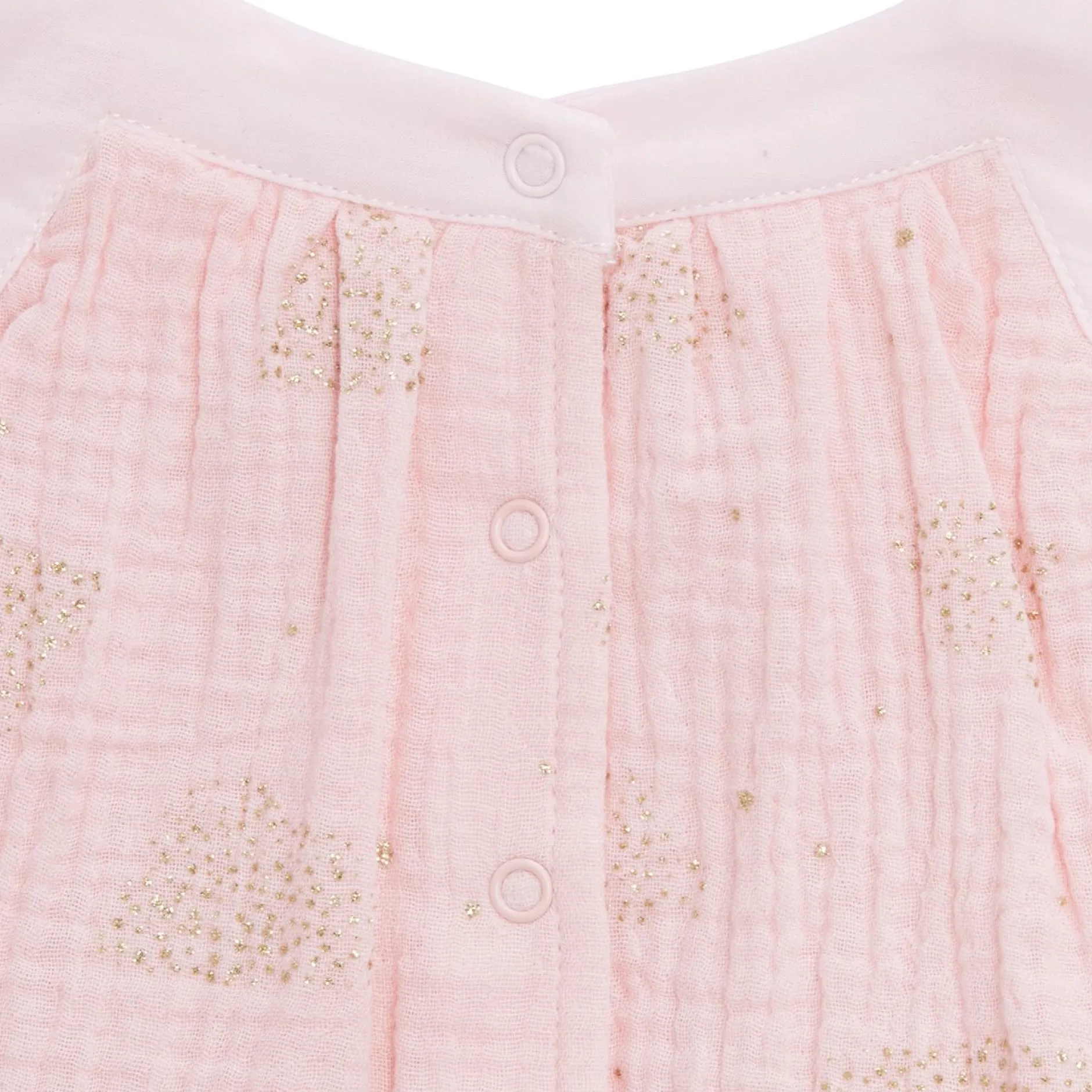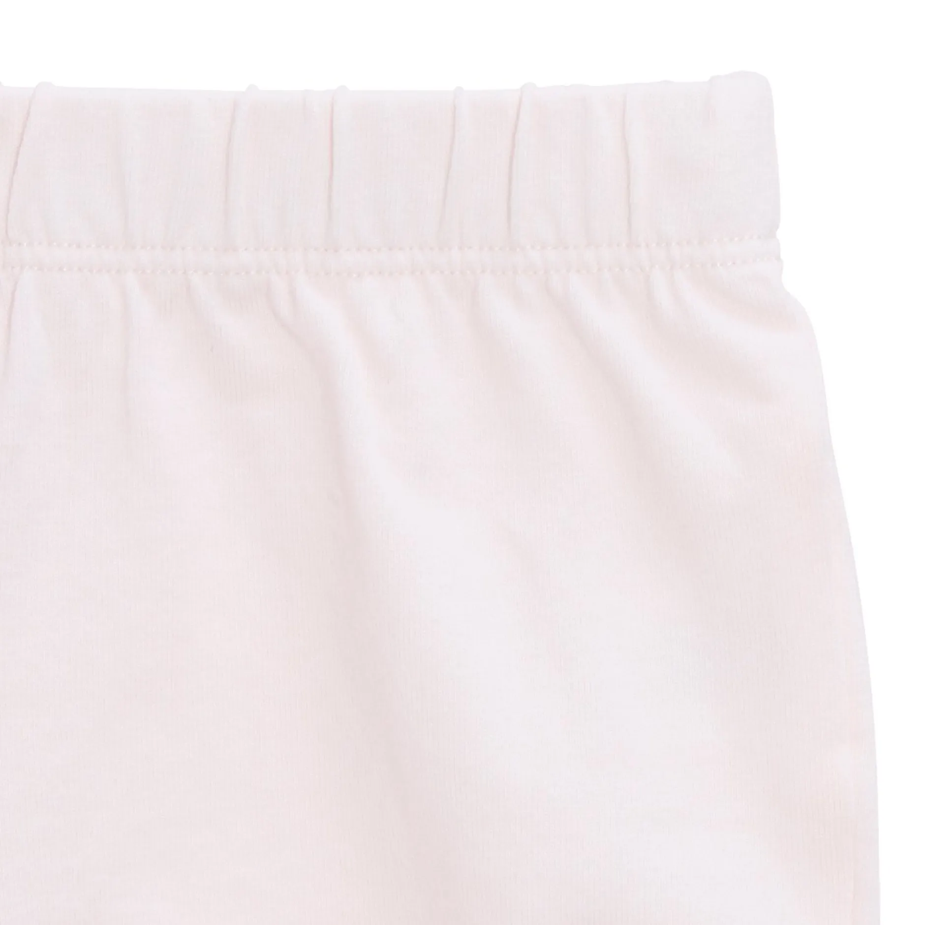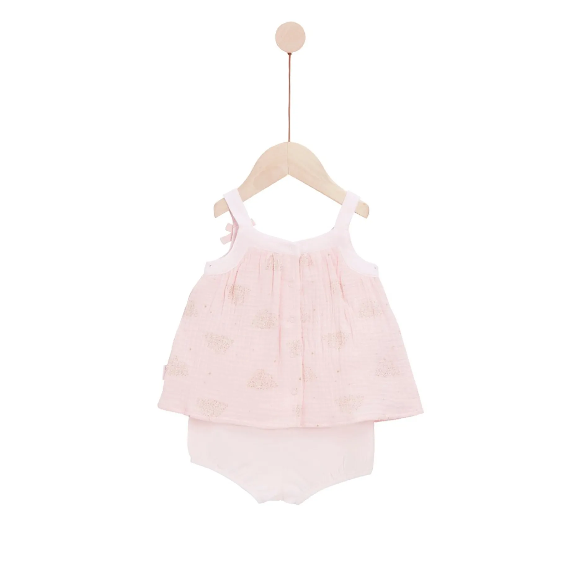 Ensemble 2 pièces P’tit Bisou composé d’un short en mousseline de gaze marine très tendance et d’un polo manches courtes en jersey écru avec impression d’un nuage et d’un texte « cool ».