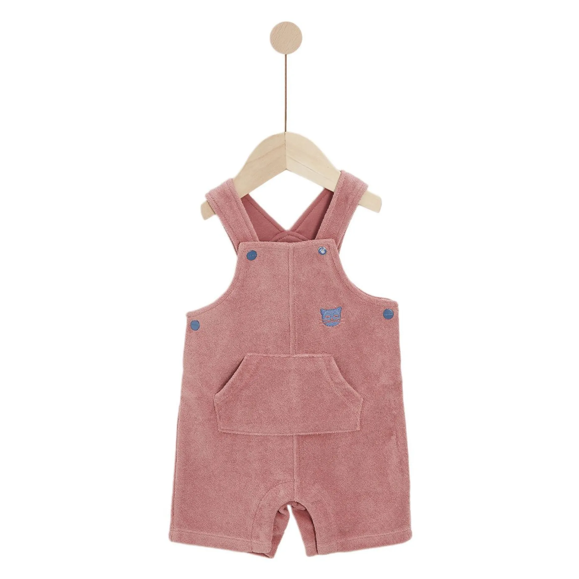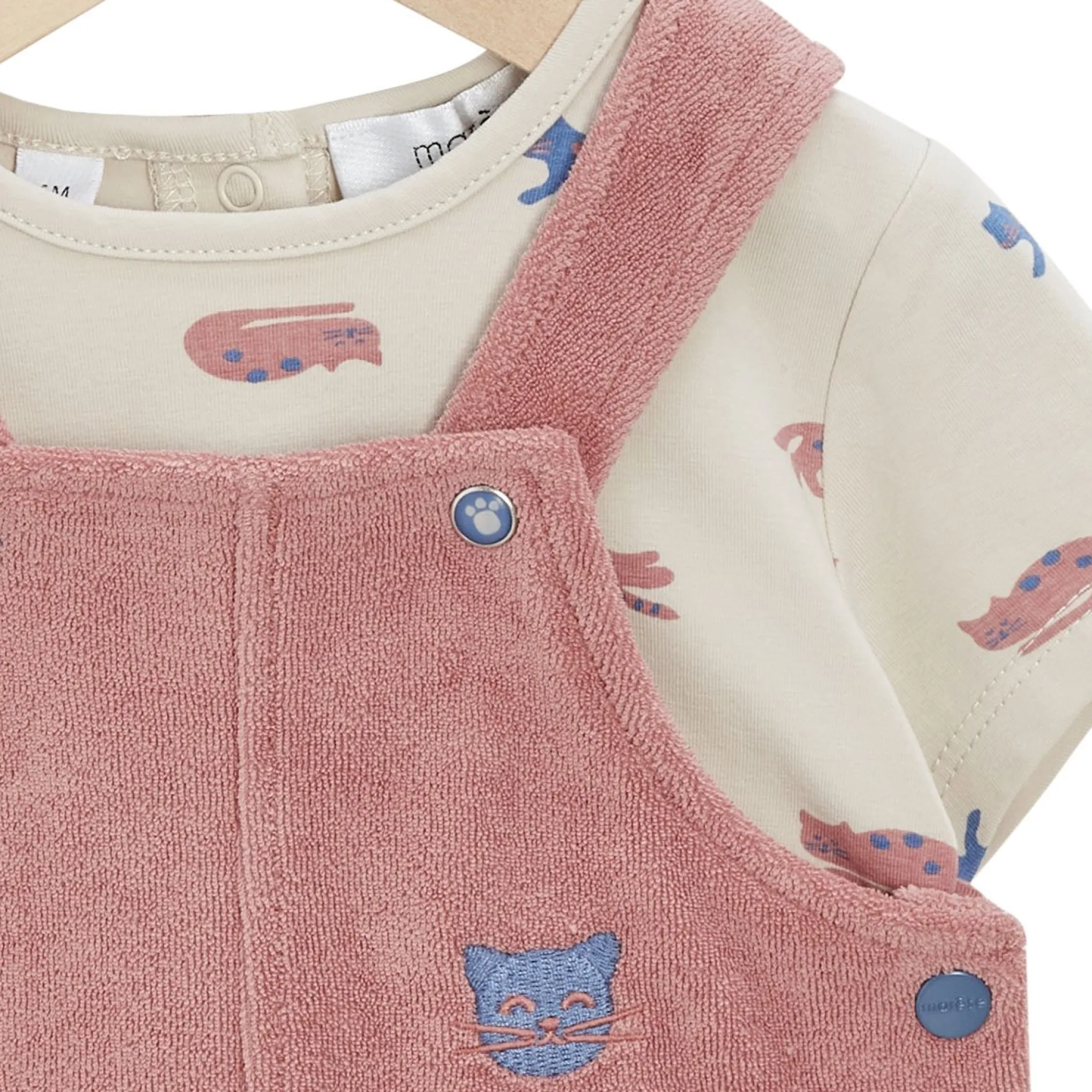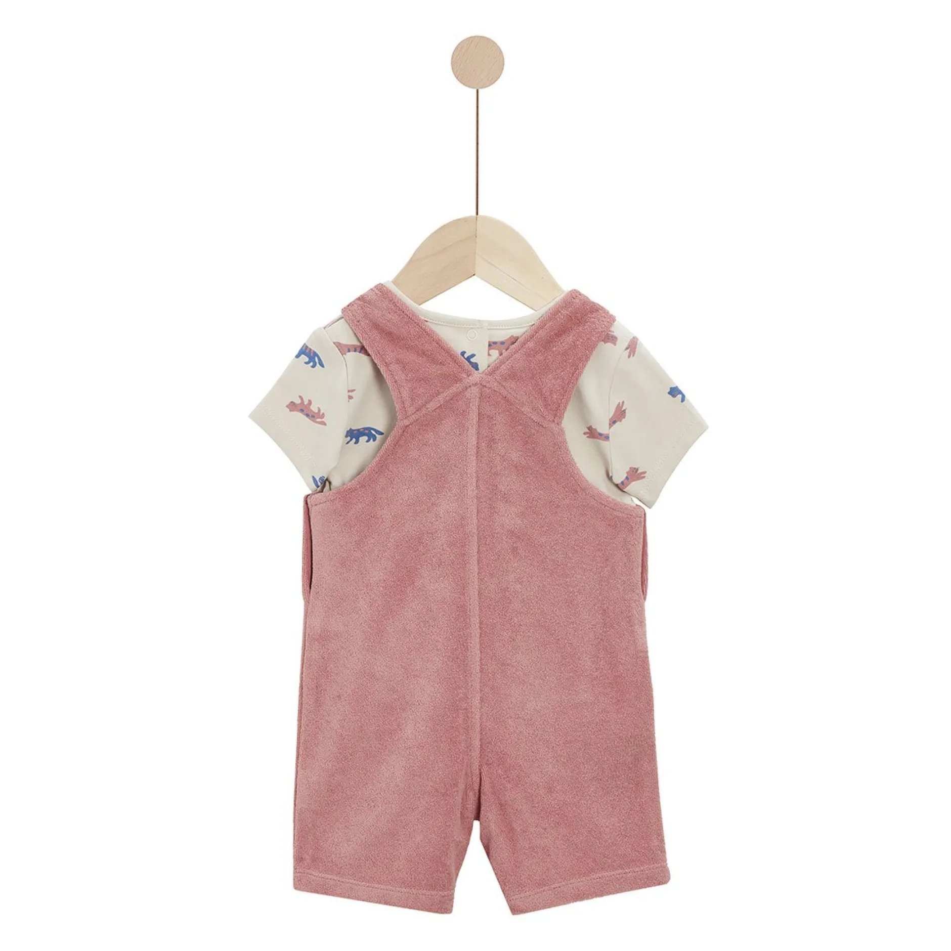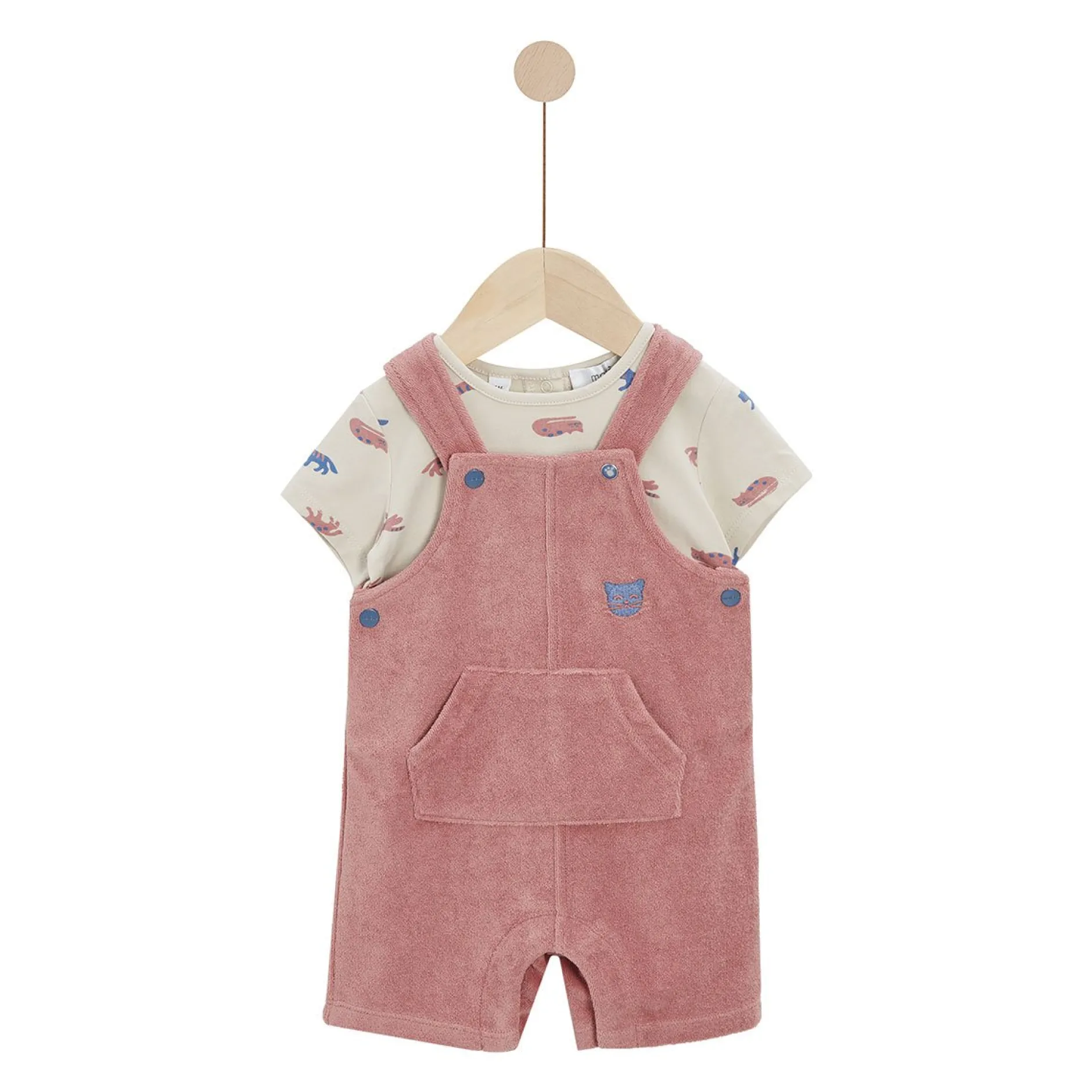 Ensemble 2 pièces Marèse composé d’une salopette courte en éponge en terracotta et d’un tee shirt manches courtes et à encolure ronde en jersey beige avec l’ imprimé » petits chats « en bleu saphir et terracotta.