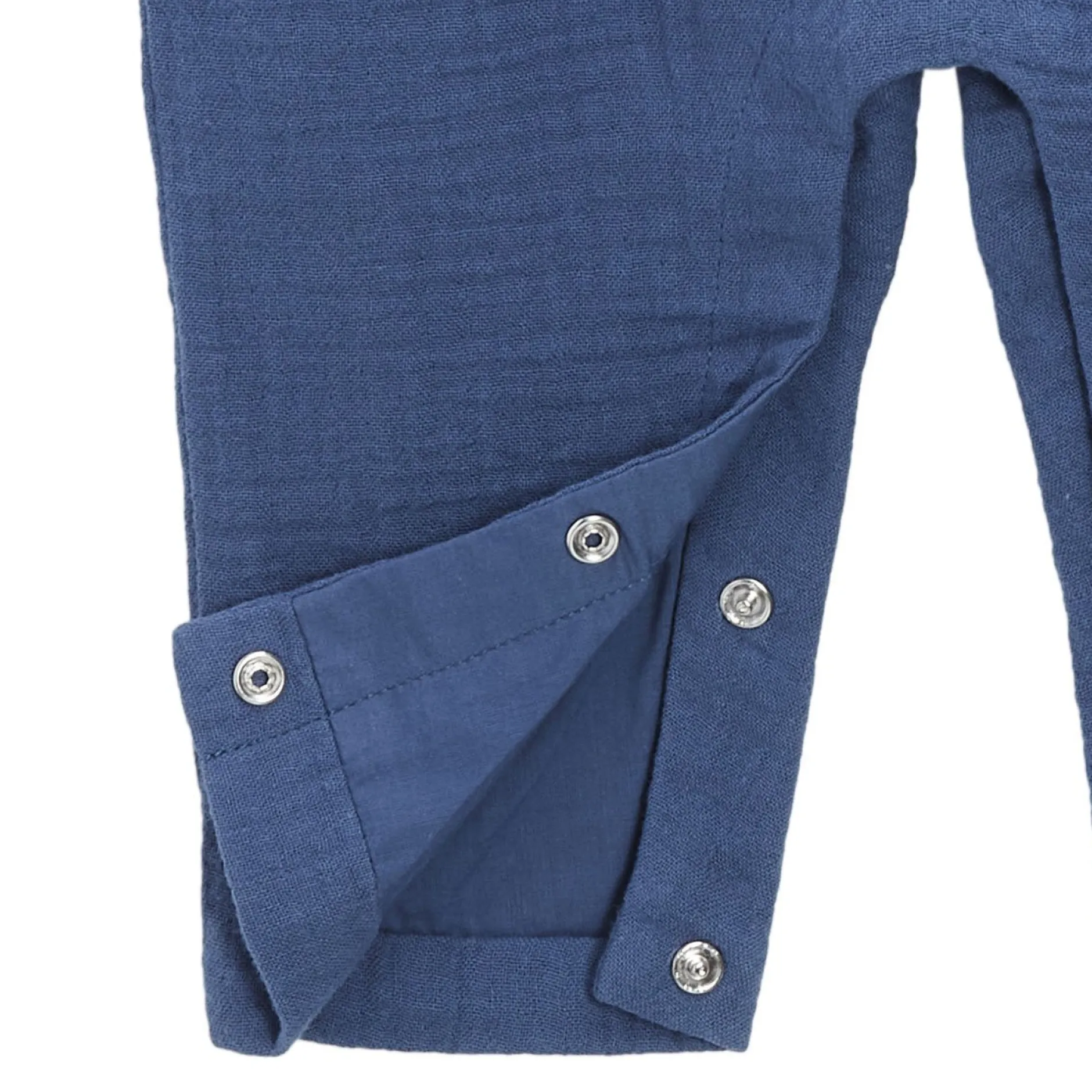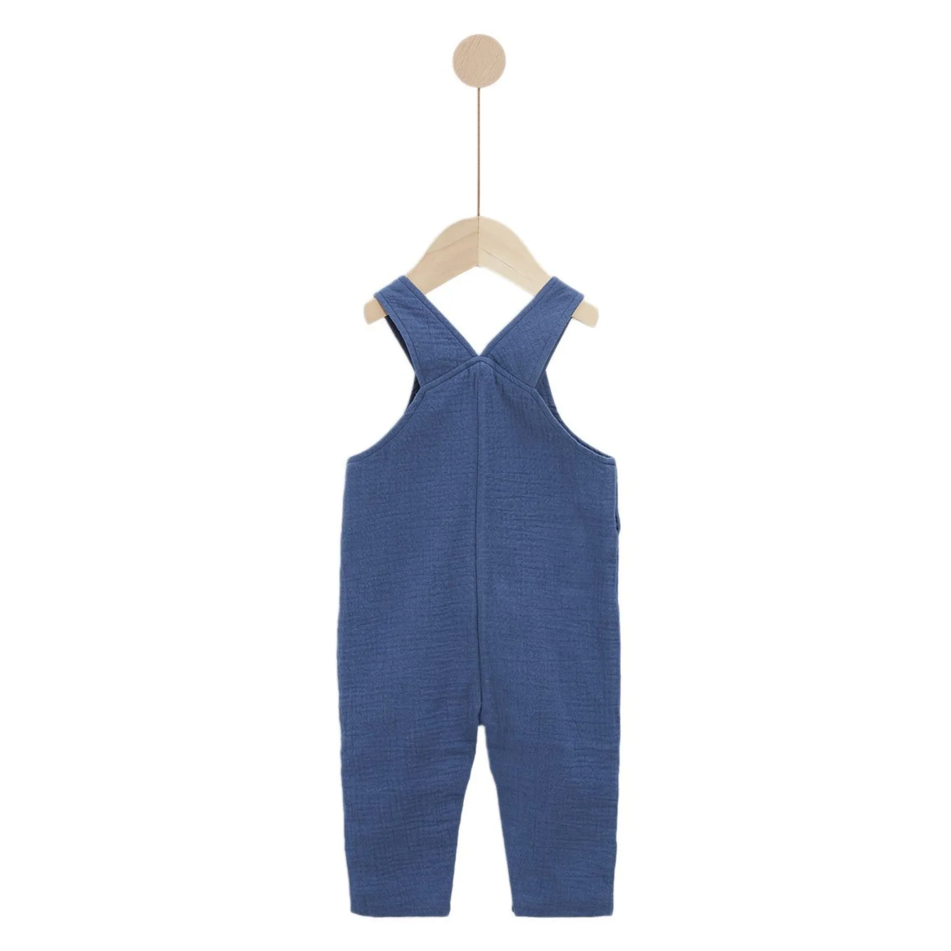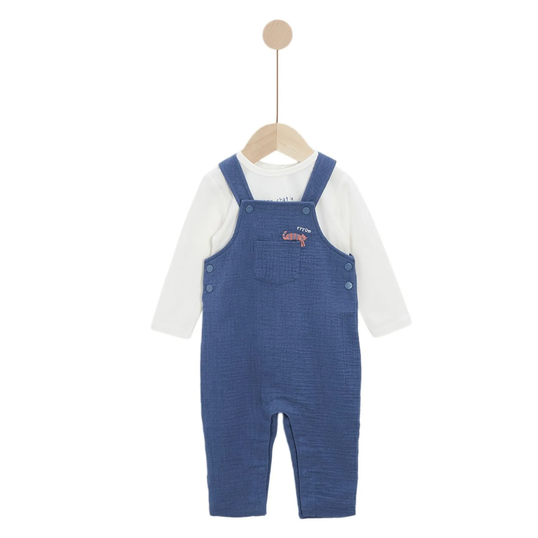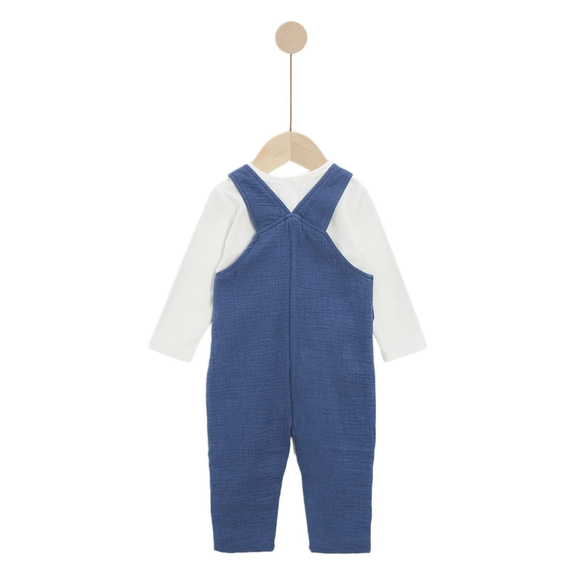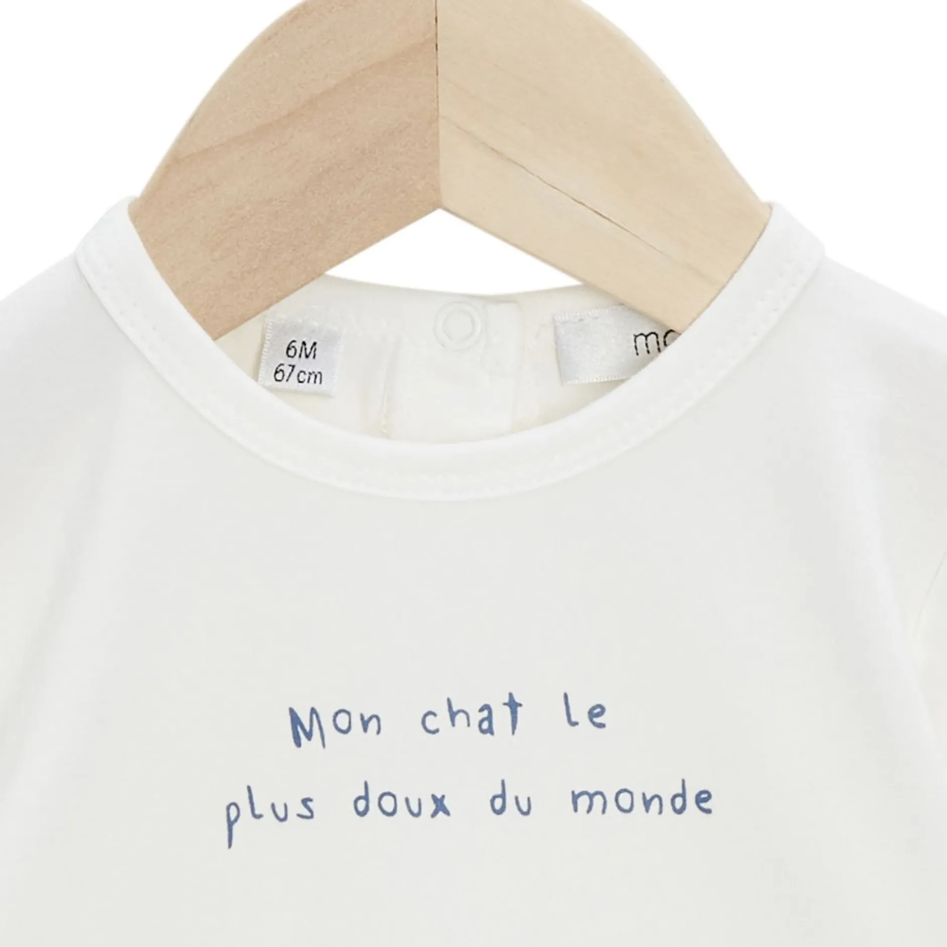 Ensemble 2 pièces Marèse composé d’une salopette longue en mousseline de gaze en bleu saphir et d’un tee shirt manches longues et à encolure ronde en jersey beige avec un joli texte imprimé devant : » mon chat le plus doux du monde « .