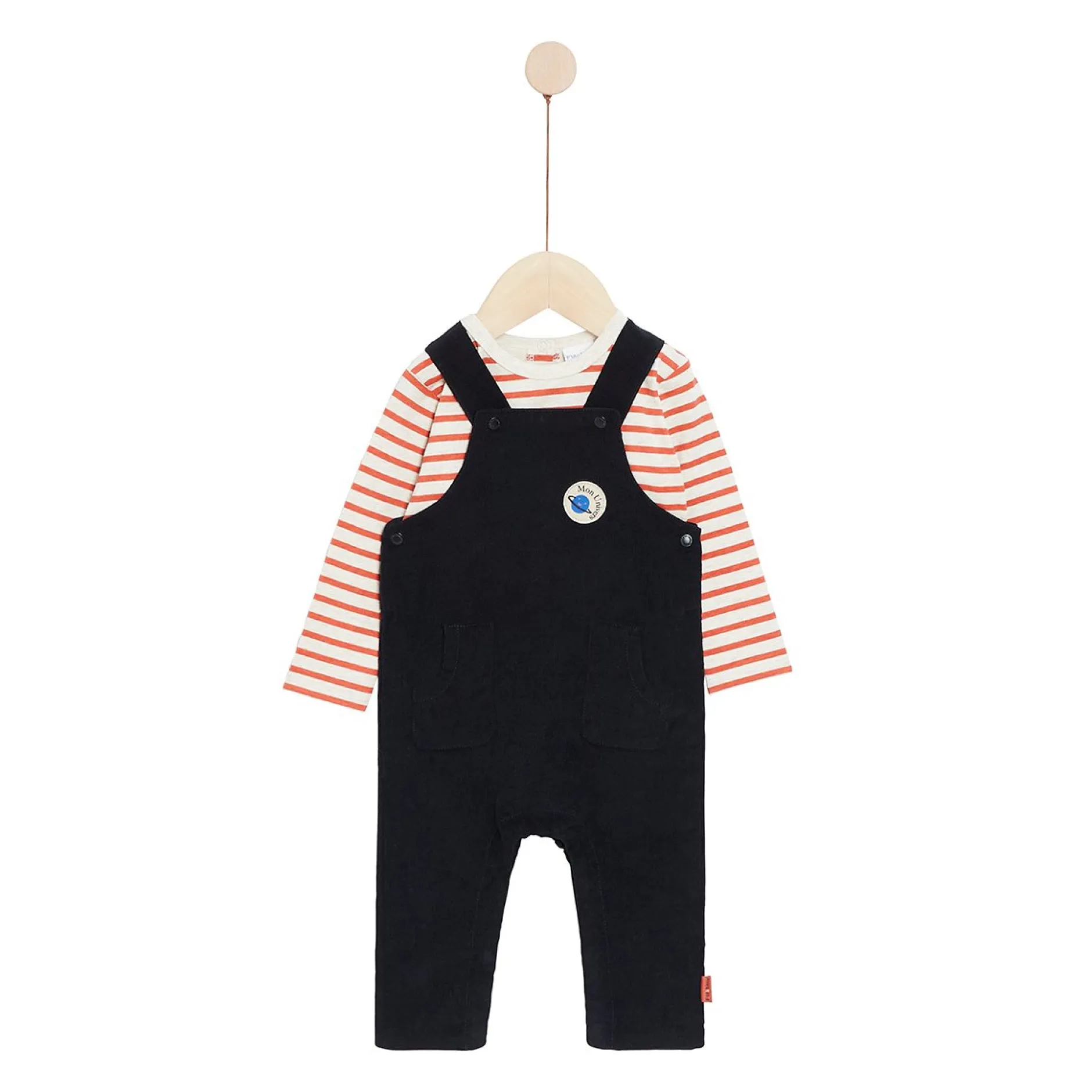 Ensemble 2 pièces long P’tit Bisou composé d’une salopette en velours milles raies en bleu marine et d’un tee-shirt manches longues en jersey à rayures orange paprika et beige sable.