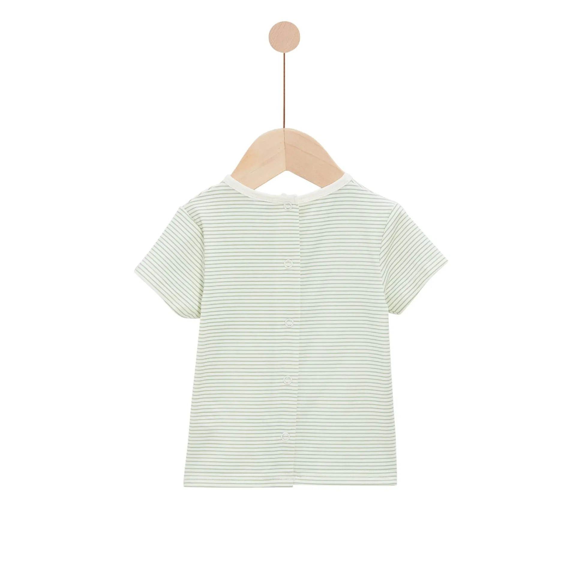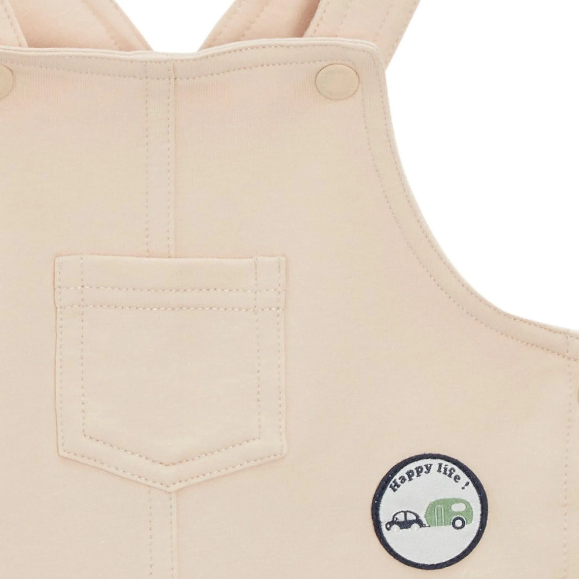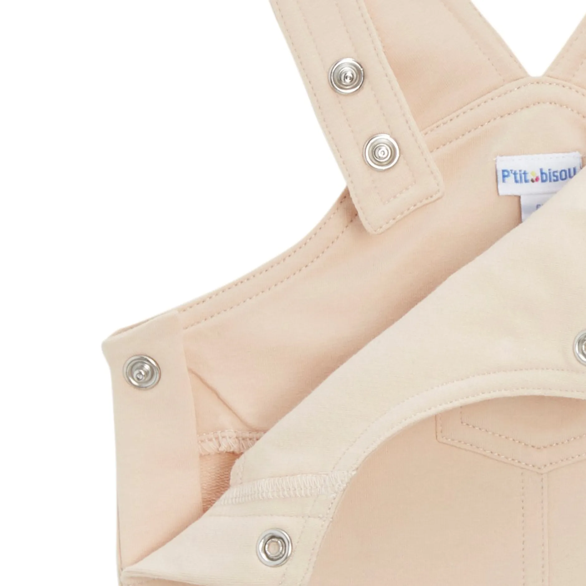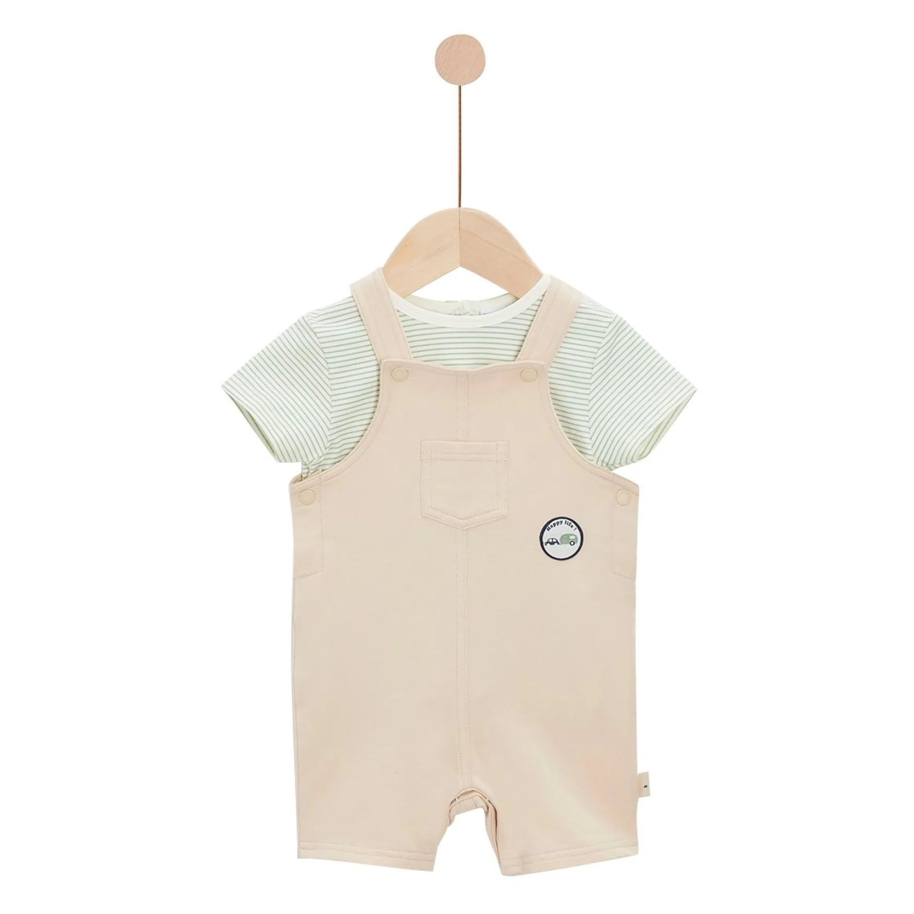 Ensemble 2 pièces composée d’une salopette en molleton beige et un tee shirt manches courtes en jersey rayé écru/vert sauge . La salopette est absolument ravissante avec ses fines bretelles et son petit volant devant. Elle est doublée de voile ton sur ton pour de belles finitions. Elle une forme rétro chic un peu arrondie et un petit resserrage élastiqué en Bas de jambes pour un plus bel effet. Très fonctionnelles avec son ouverture entrejambes par pressions cachées et ouverture par pressions en ton sur ton au dos.