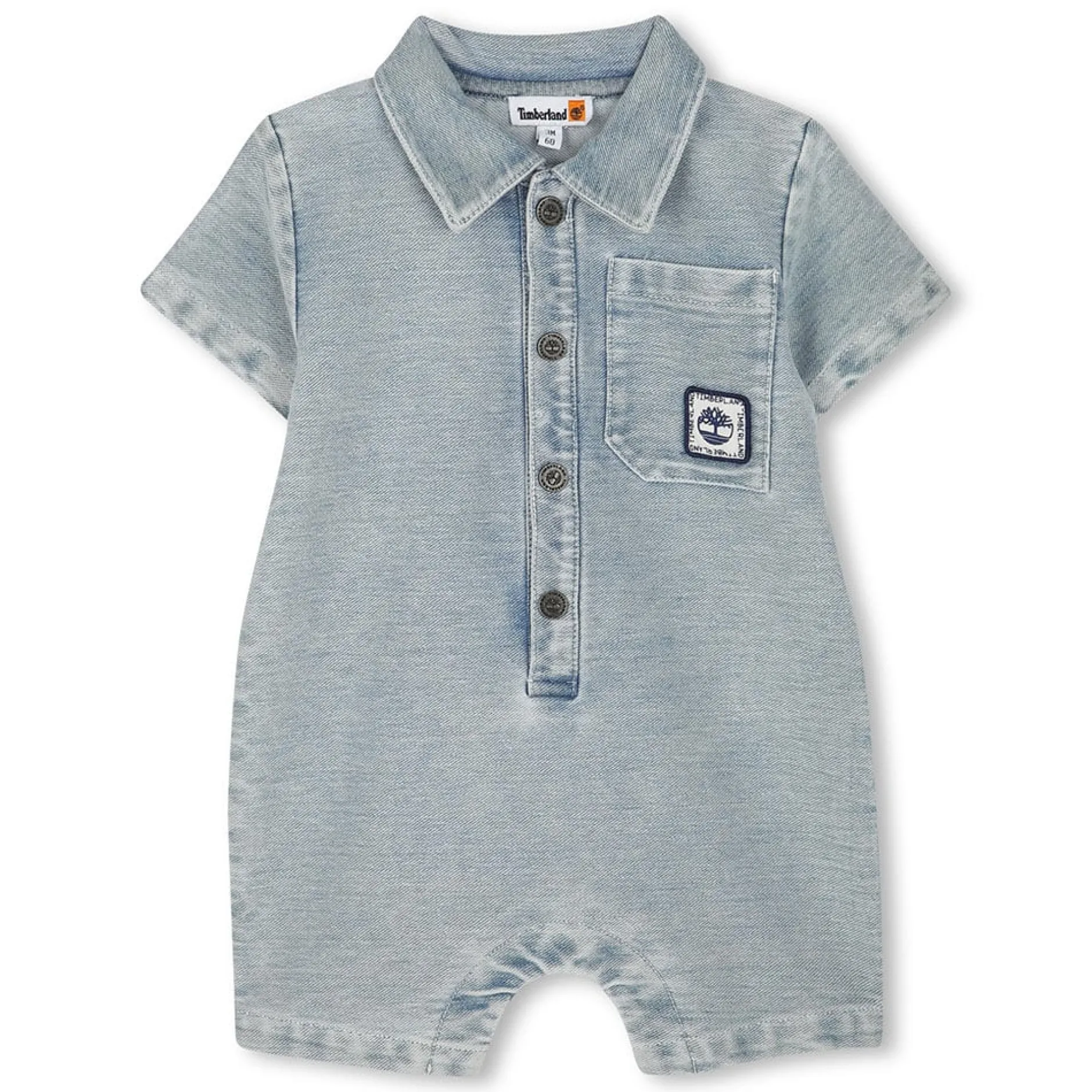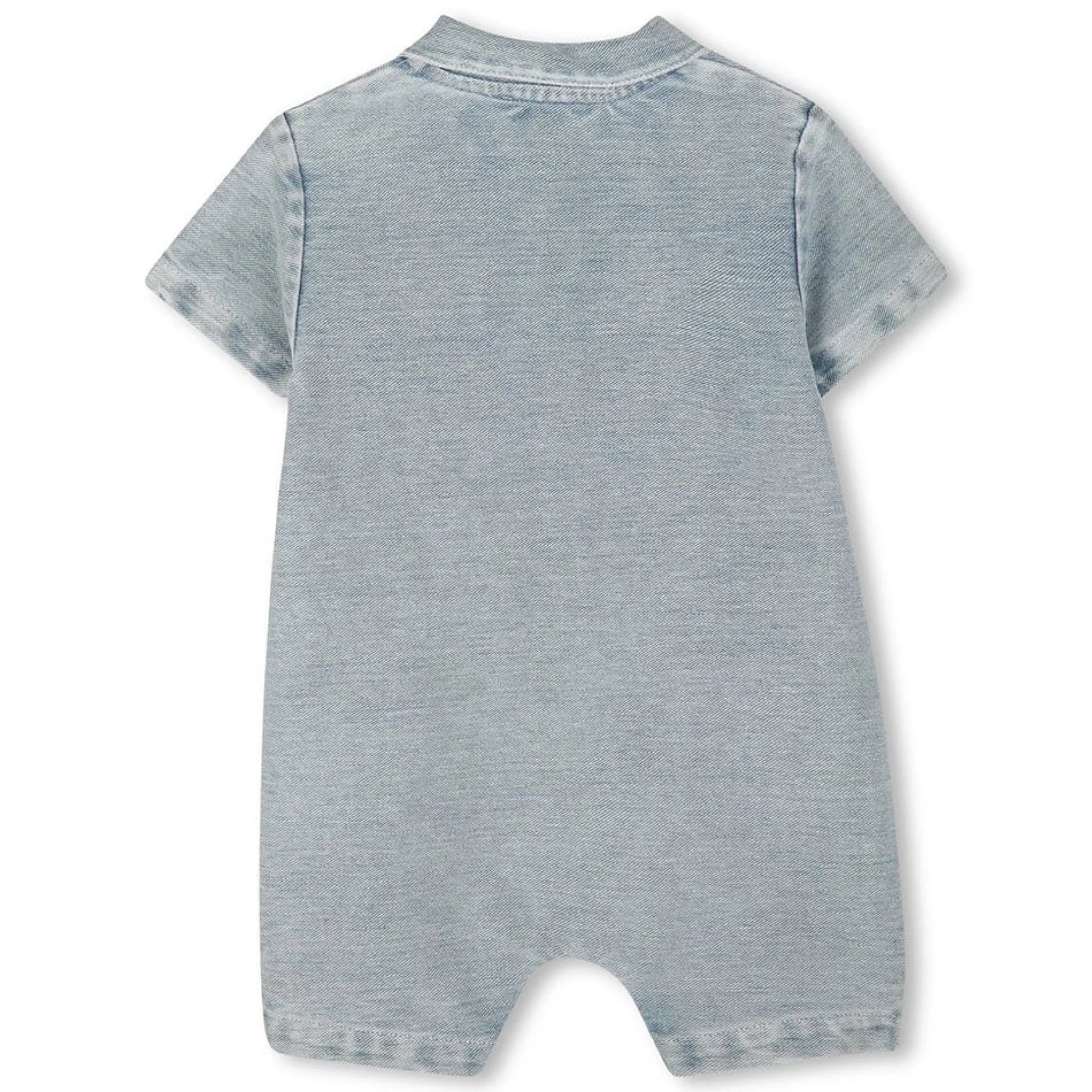 Combinaison short en denim maille 89% coton / 11% élasthanne, bouton pressions sur le devant, poche avec étiquette tis…