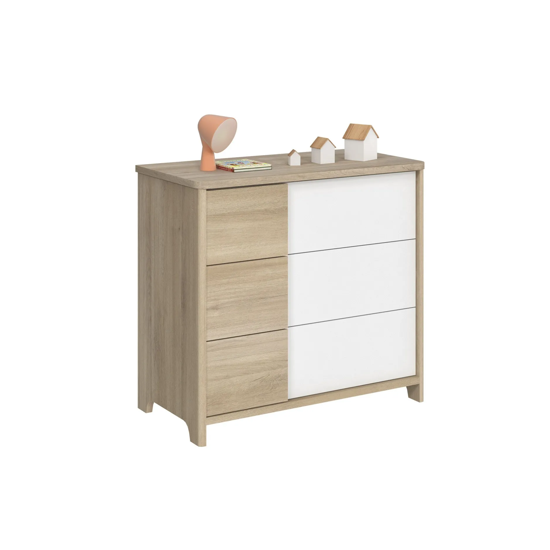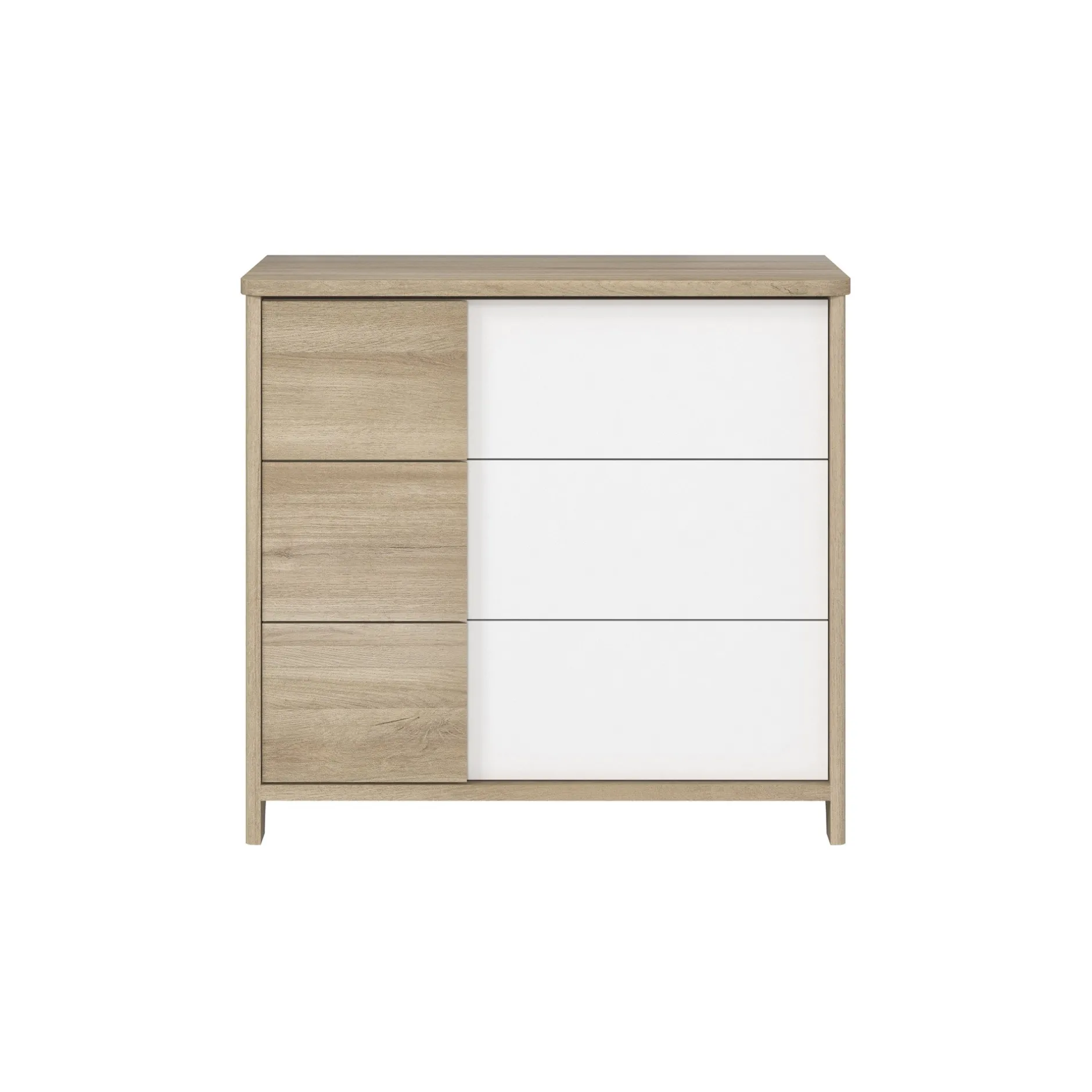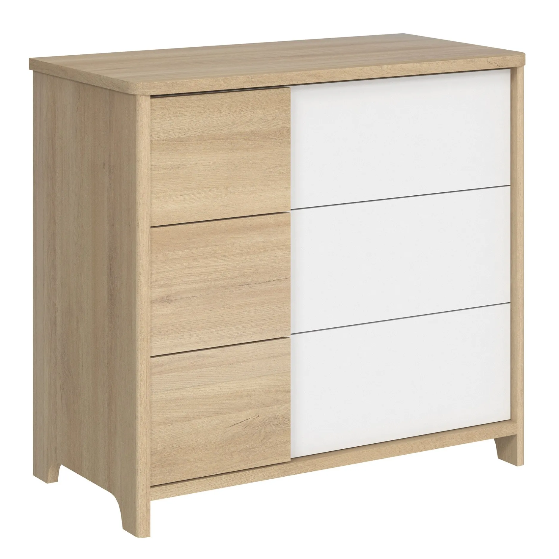 Commode 3 tiroirs Sacha. Corps en panneaux de particules revêtus papier décor imitation Pin blanchi. Chants ABS décor bois sur le dessus de la commode.