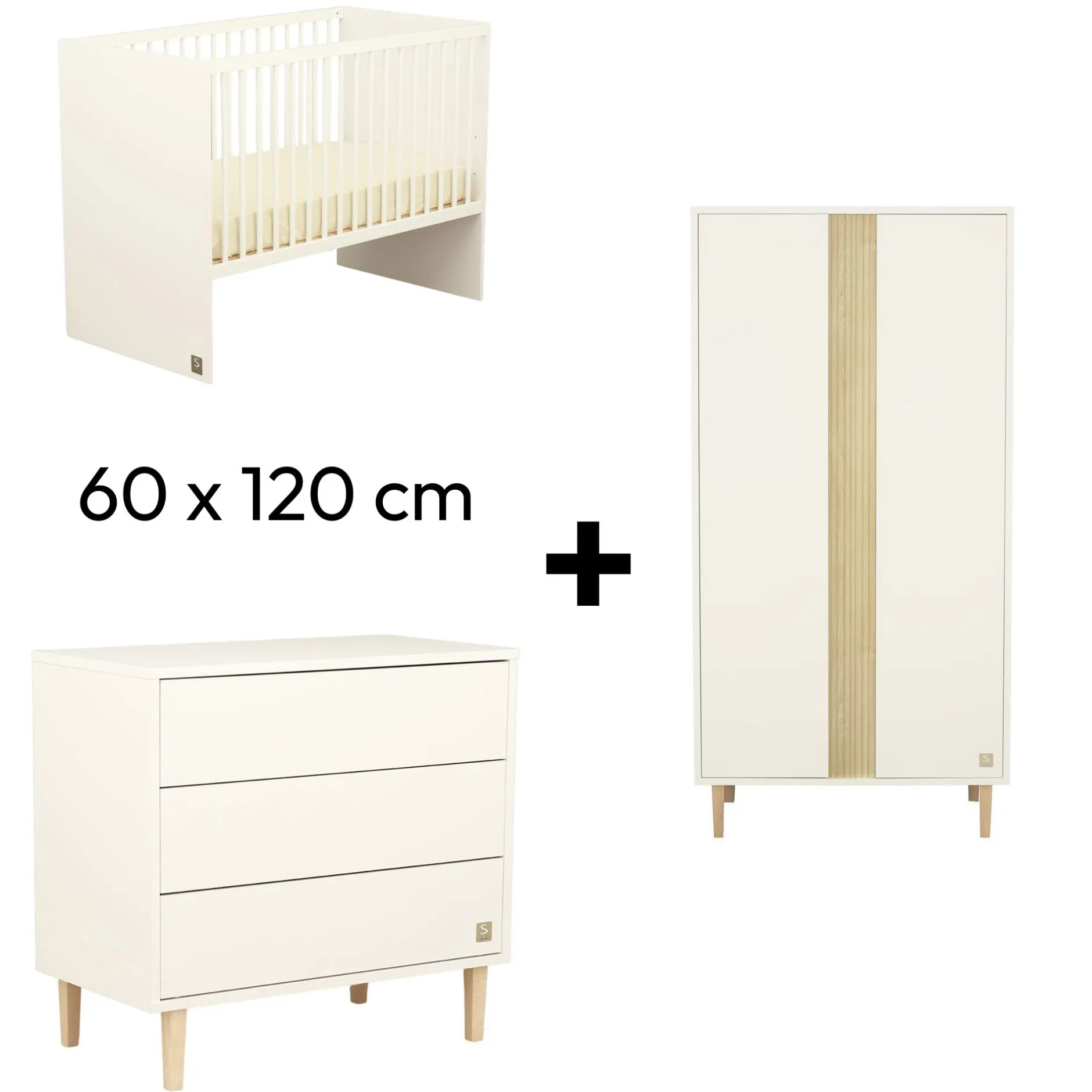 Ce pack contient un lit 60 x 120 cm (coloris au choix), une commode (coloris au choix) et une armoire (coloris au choix) de la collection Paloma de la marque Sauthon.