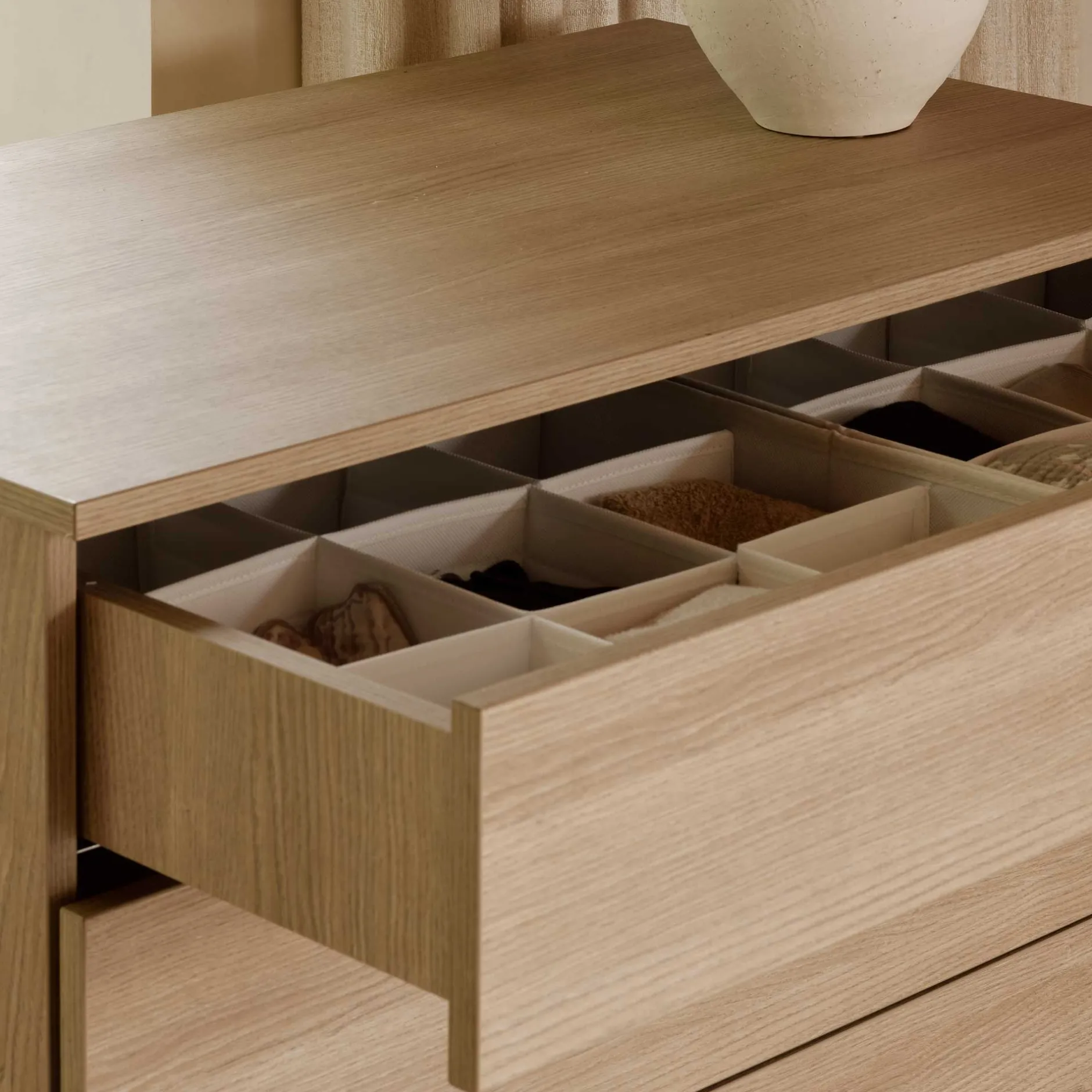 Commode 3 tiroirs de la chambre Flow de Quax. Plan à langer vendu séparément. Superstructure du meuble en panneau de particules mélaminé. Le plateau et le fond des commodes est en panneau avec bois imprimé, tandis que les côtés et les façades des tiroirs sont de couleur unie.
