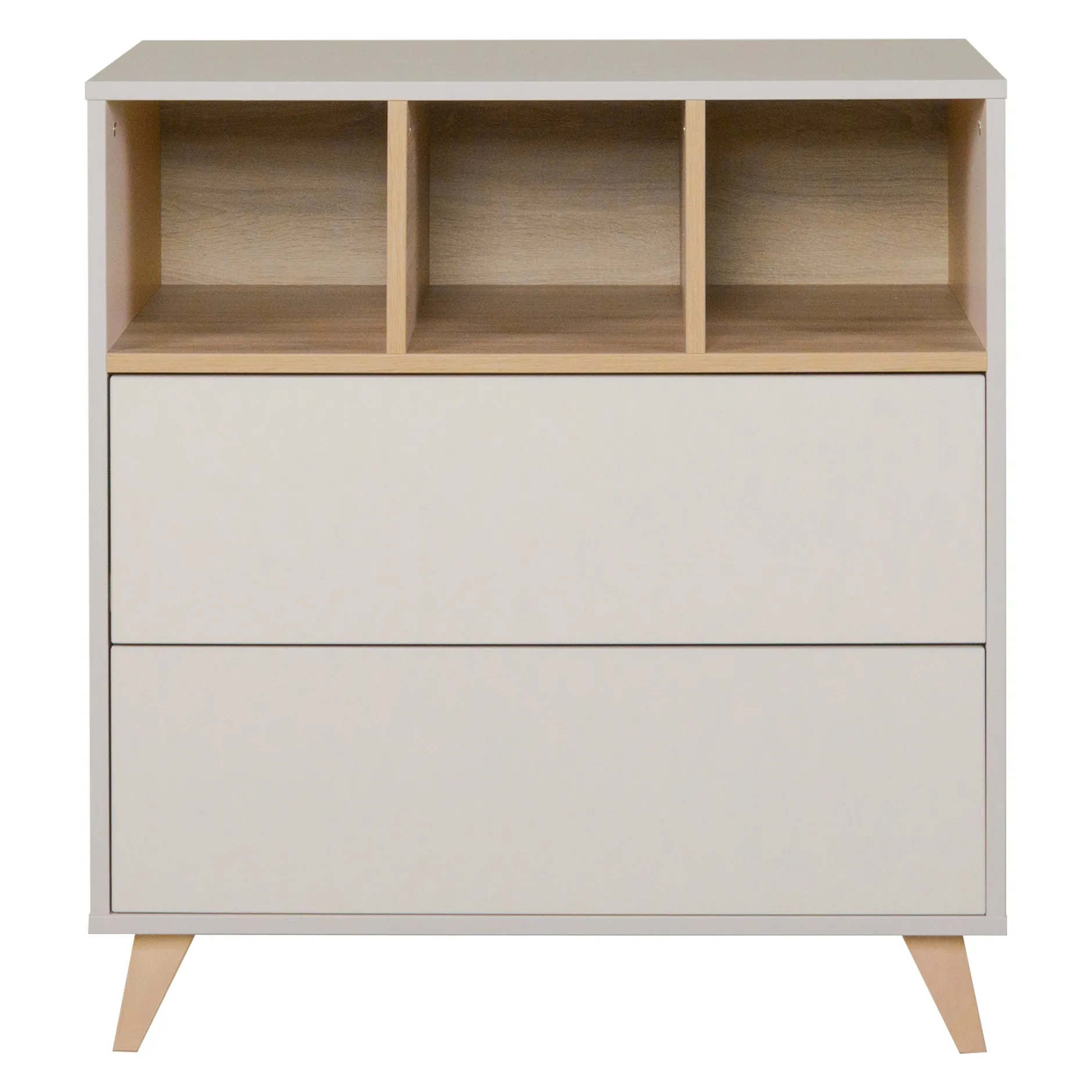 Commode de la chambre Loft de Quax. Munie de deux tiroirs et d’une poignée invisible.