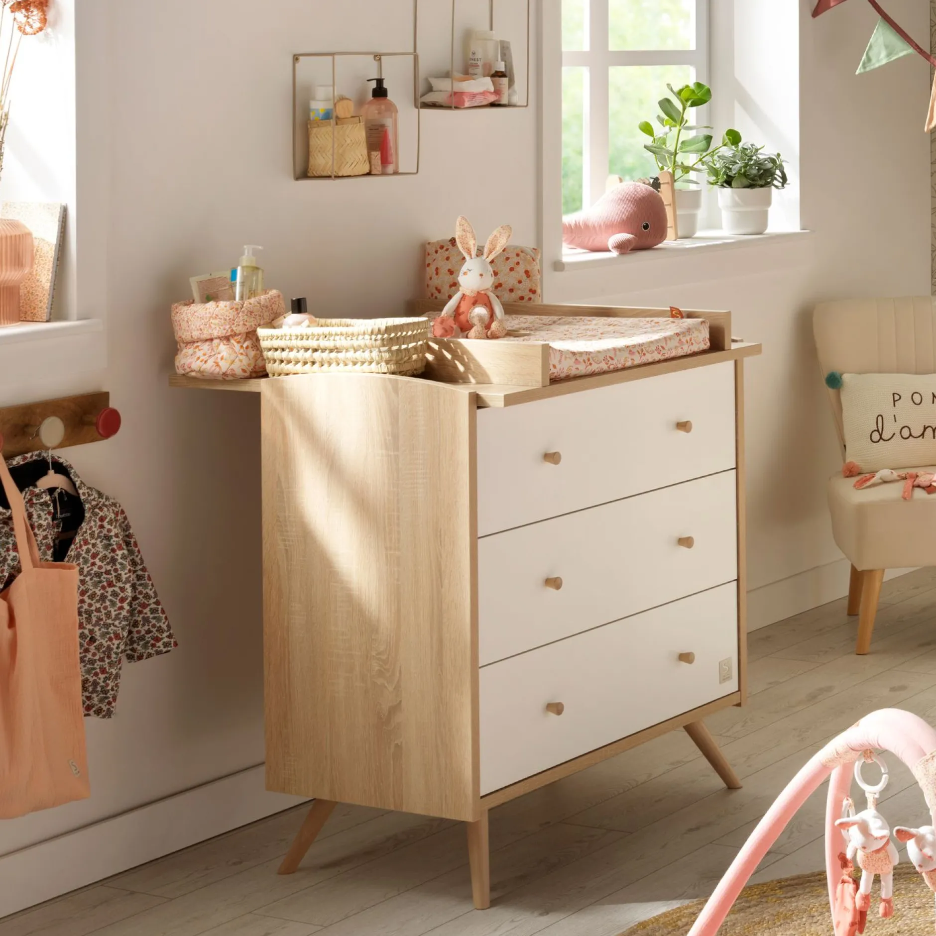 Un design intemporel qui conviendra à toutes les ambiances de chambre ! Ses 3 tiroirs ultra pratiques seront parfaits pour un espace de rangement optimisé ! Pratique, un plan à langer de la même collection pourra être fixé sur le dessus de la commode (non inclus).