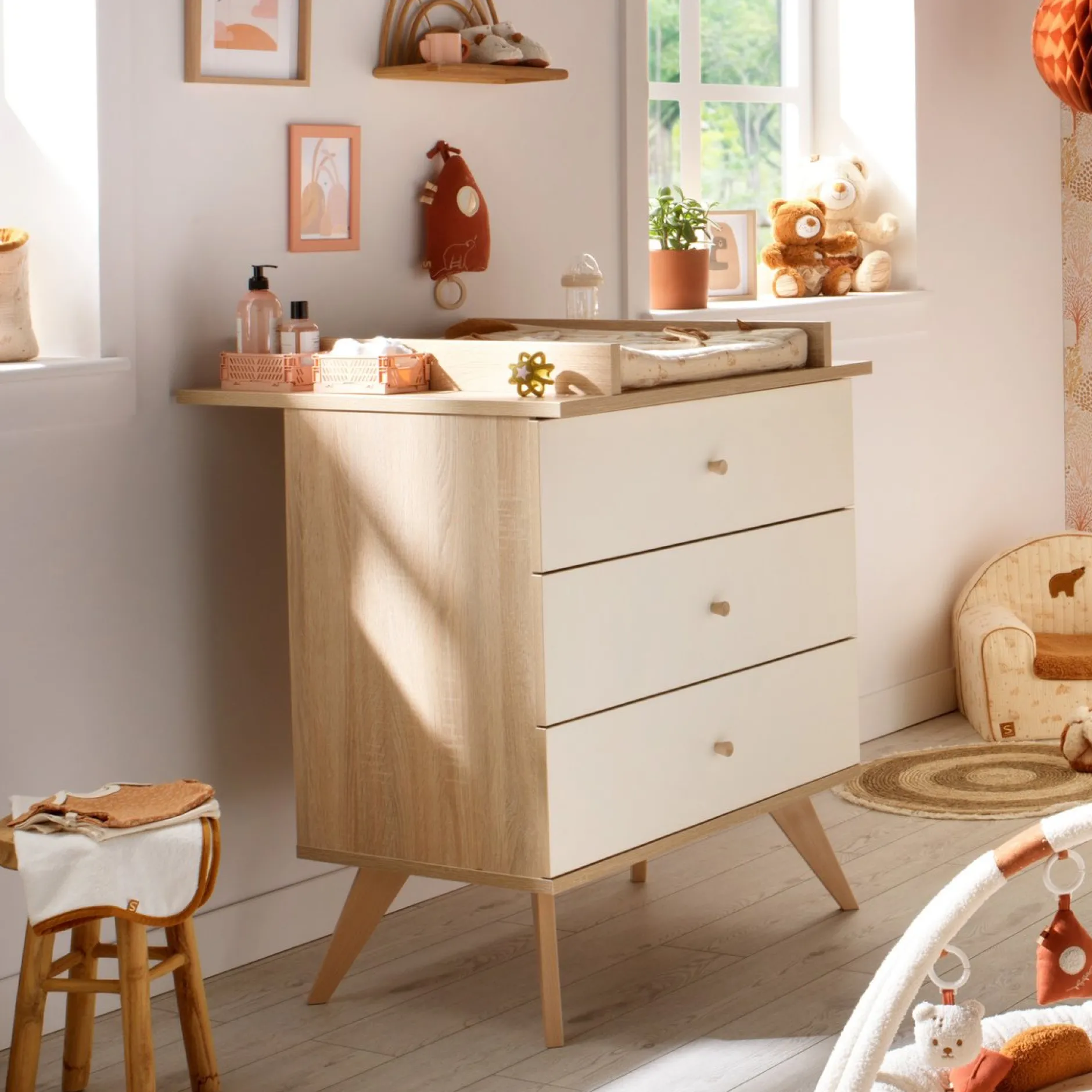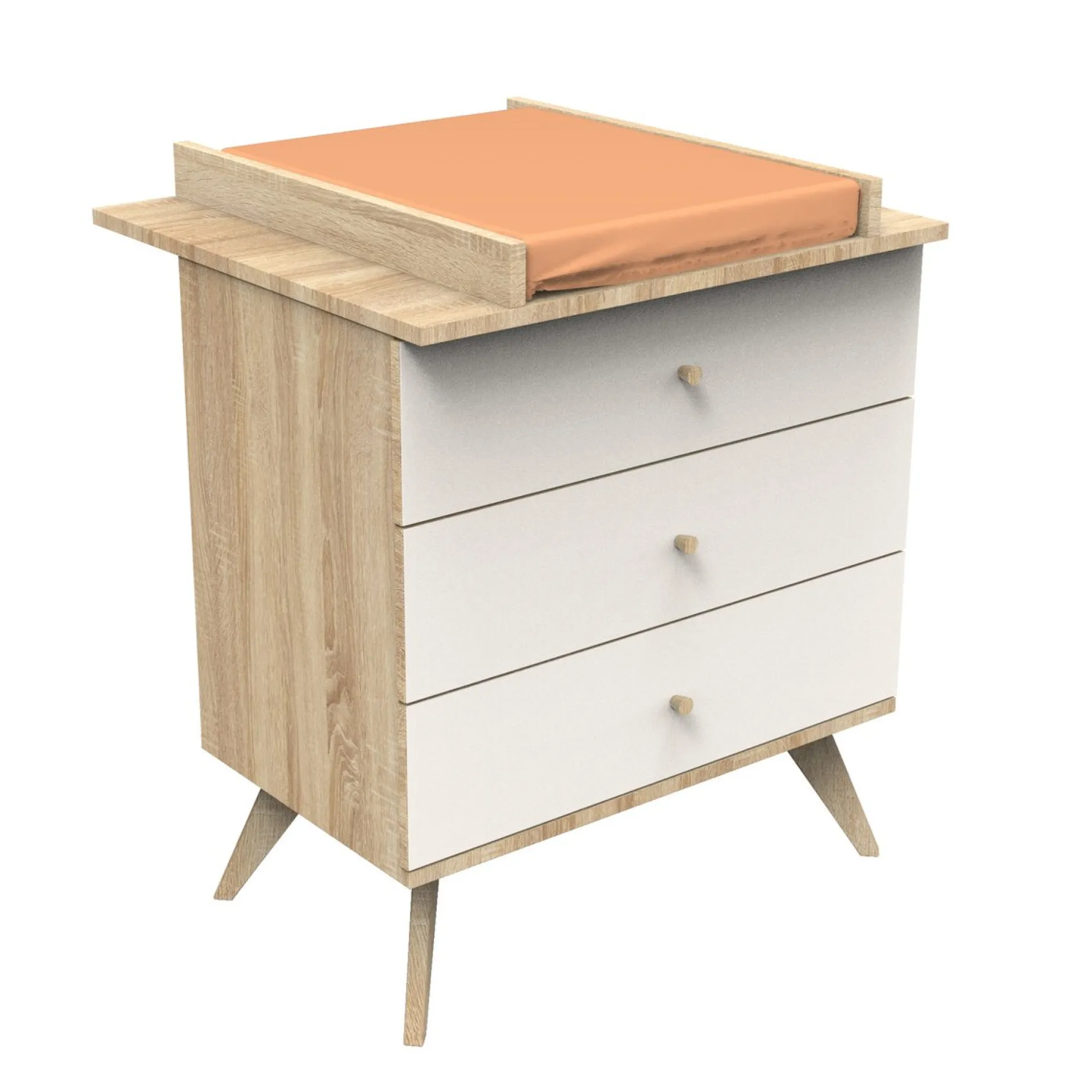 En effet, les 3 tiroirs permettent de ranger tout le nécessaire pour Bébé. Les pieds obliques apporteront la touche déco rétro.