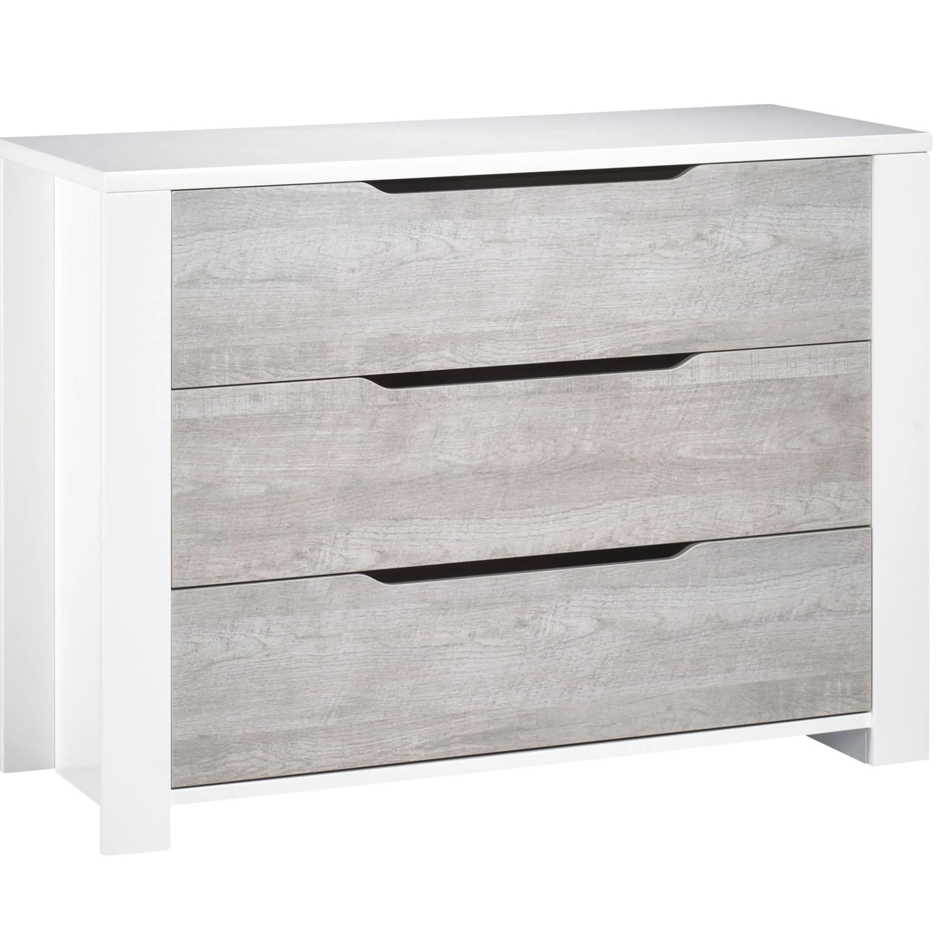- Faces tiroirs, en panneaux de particules revêtus papier décor gris loft, avec 1 découpe prise de main.