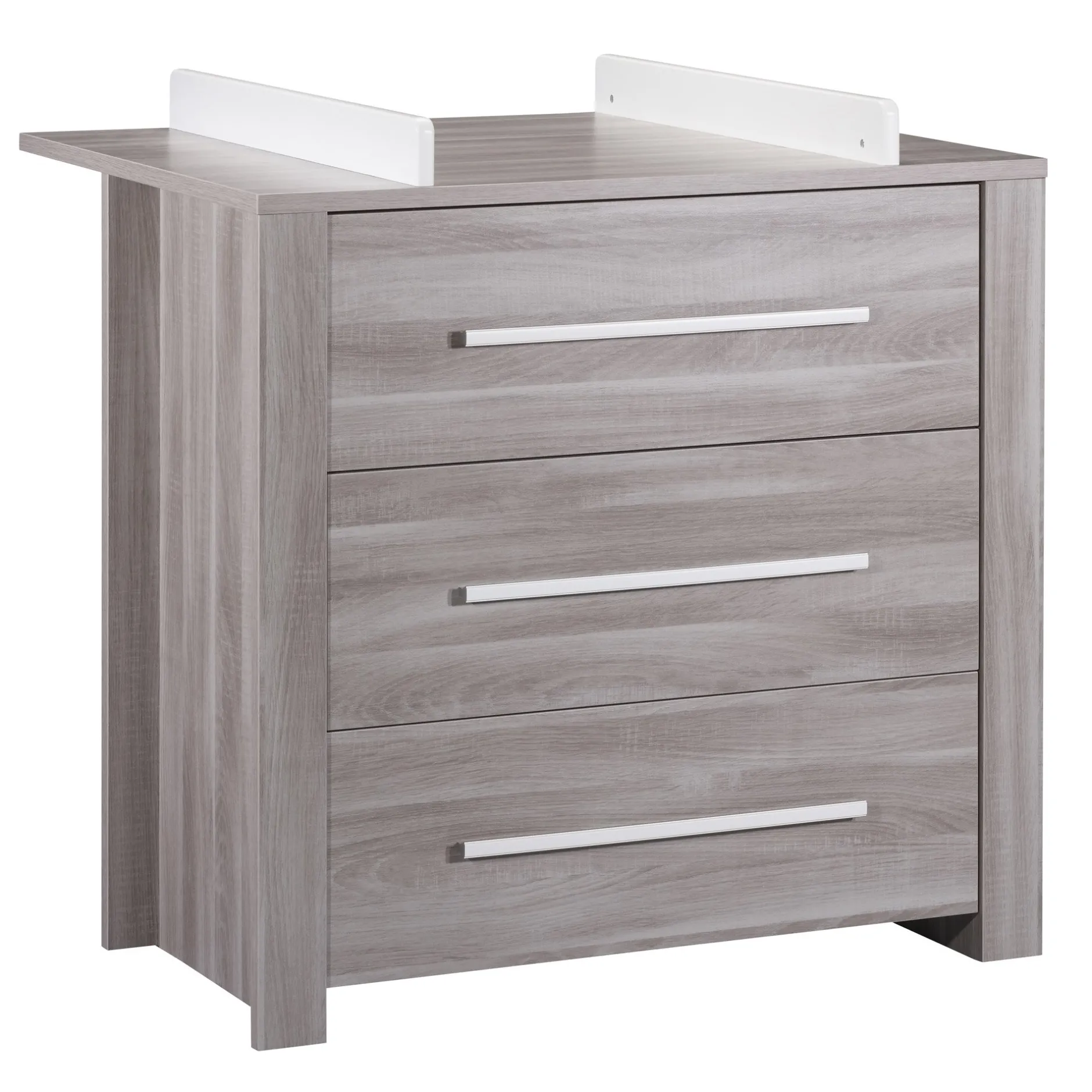 Commode 3 tiroirs de la chambre Pure. Dessus et montants en panneaux de fibres de moyenne densité (MDF) laqués blanc. Côtés et faces tiroirs en panneaux de particules mélaminés laqués une face blanc.