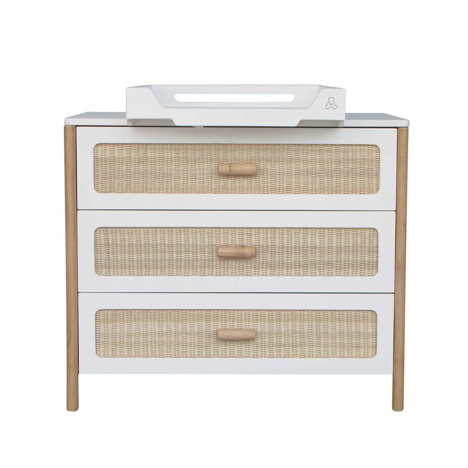 Commode à langer Océania Silex. Trois grands tiroirs, des fermetures douces et des panneaux en tressage de rotin naturel pour une touche asiatique sur cette commode. Existe en coloris Neige ou Silex.