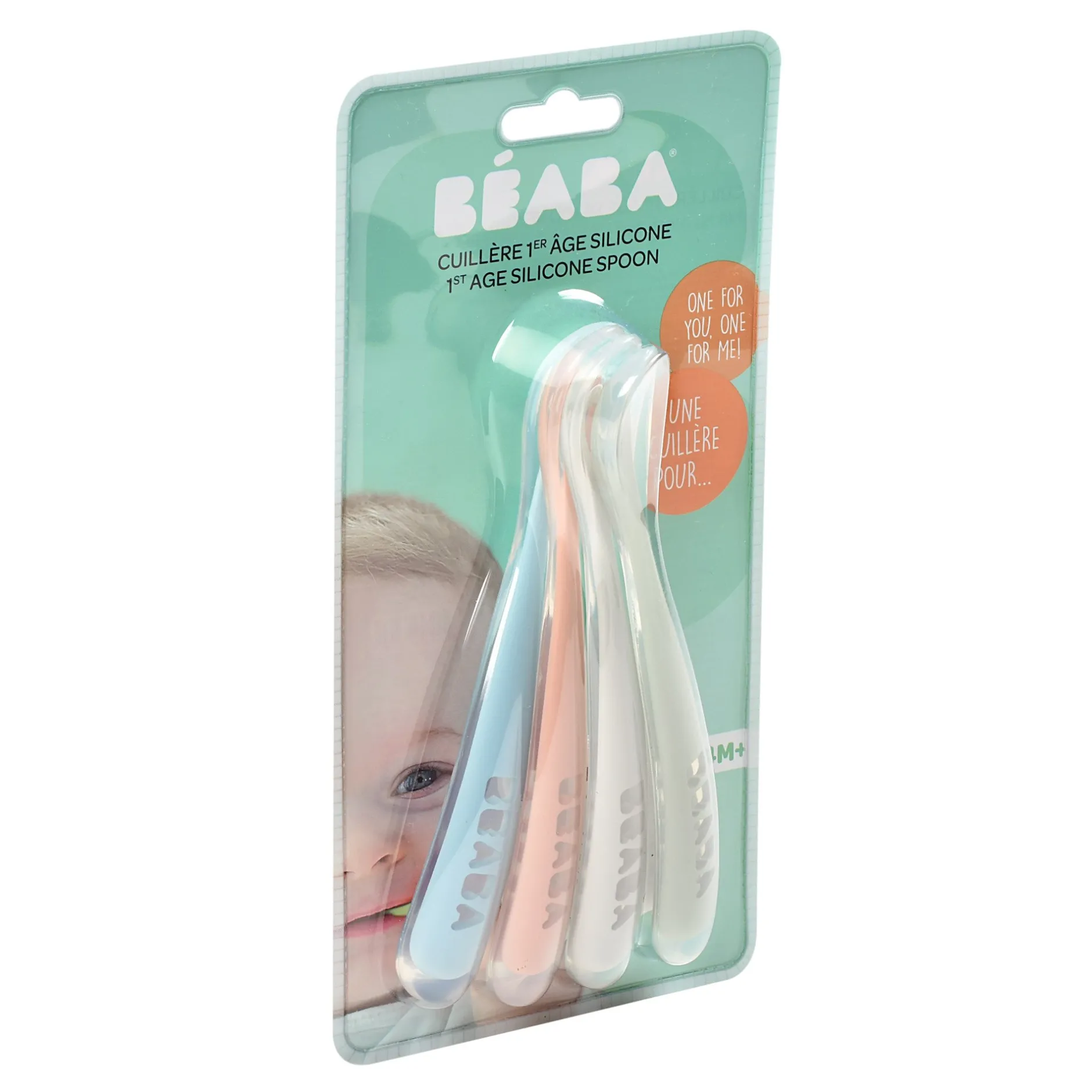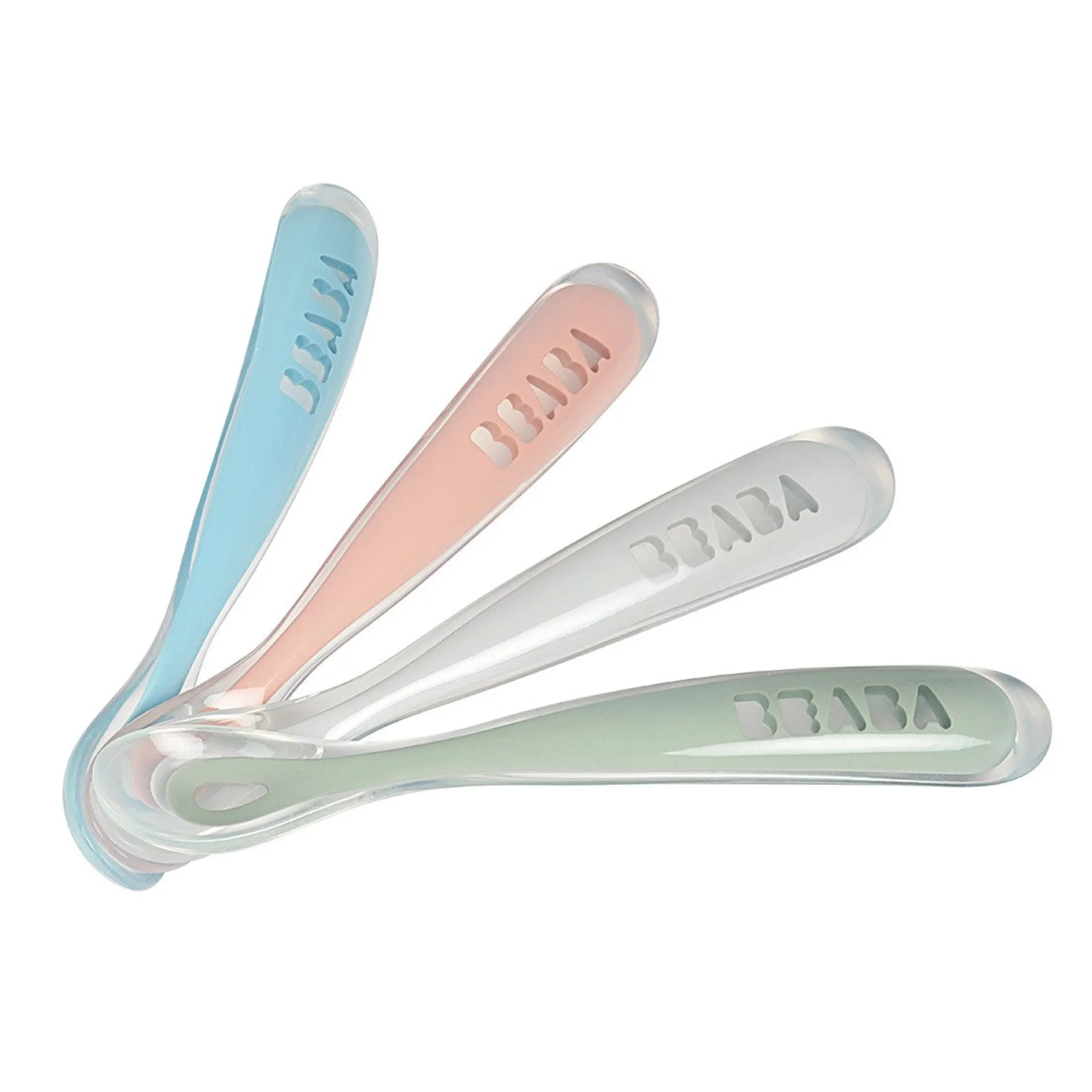Lot de 4 cuillères premier repas. Embout silicone spécialement conçu pour la transition de la tétine à la cuillère…