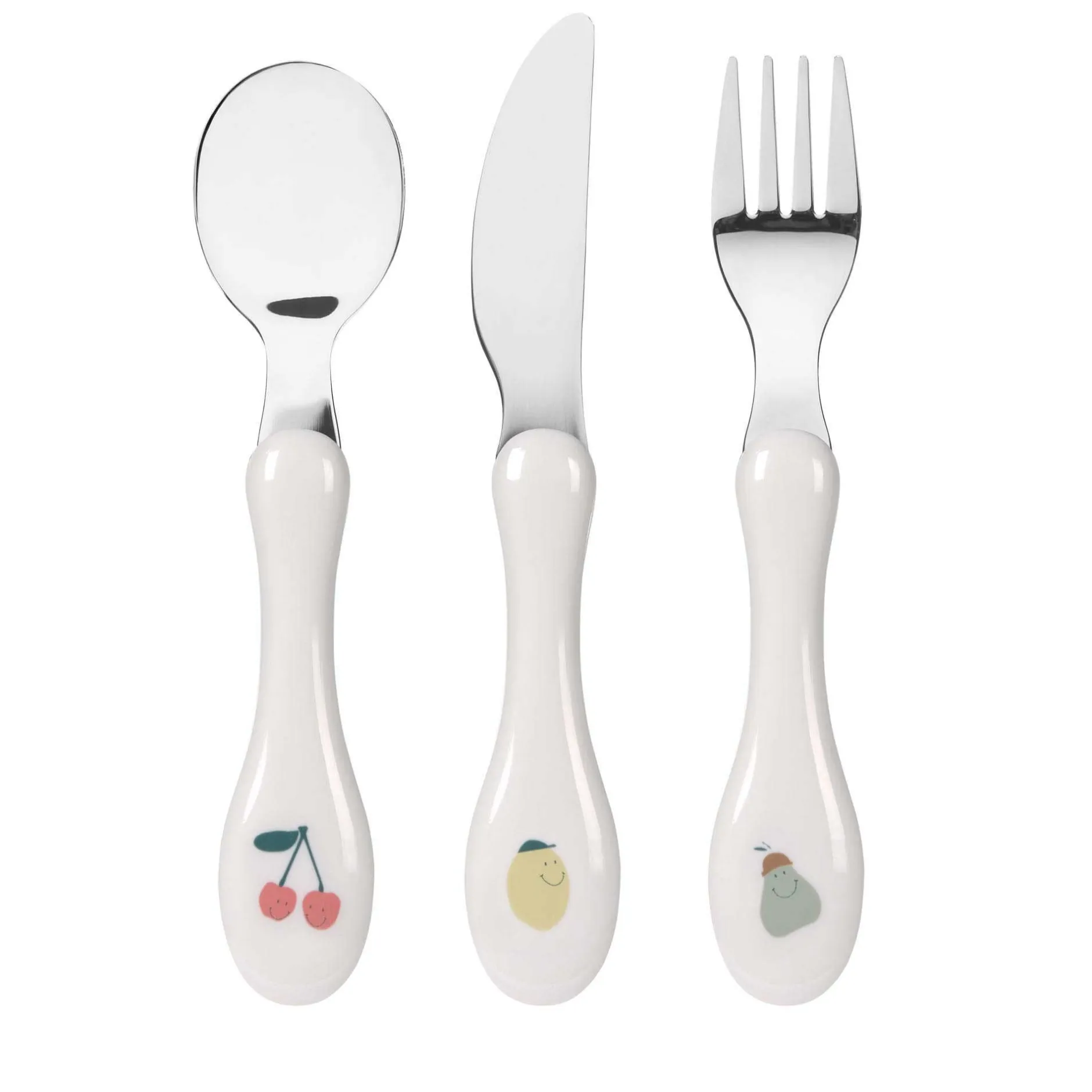 Avec ces couverts pour enfants en acier inoxydable de LÄSSIG de la collection Happy Fruits, comprenant fourchette, cuillère et couteau, manger tout seul devient un vrai plaisir.