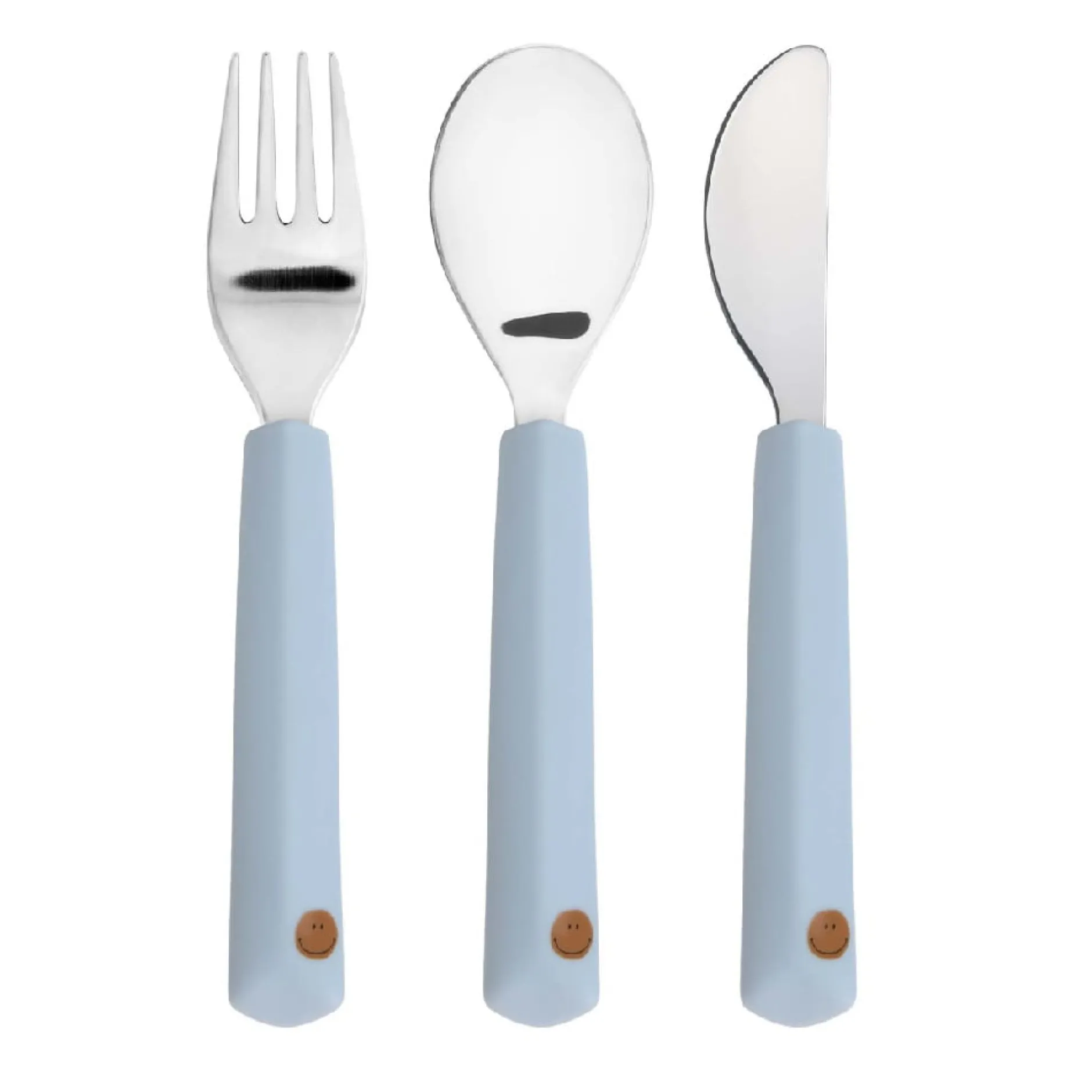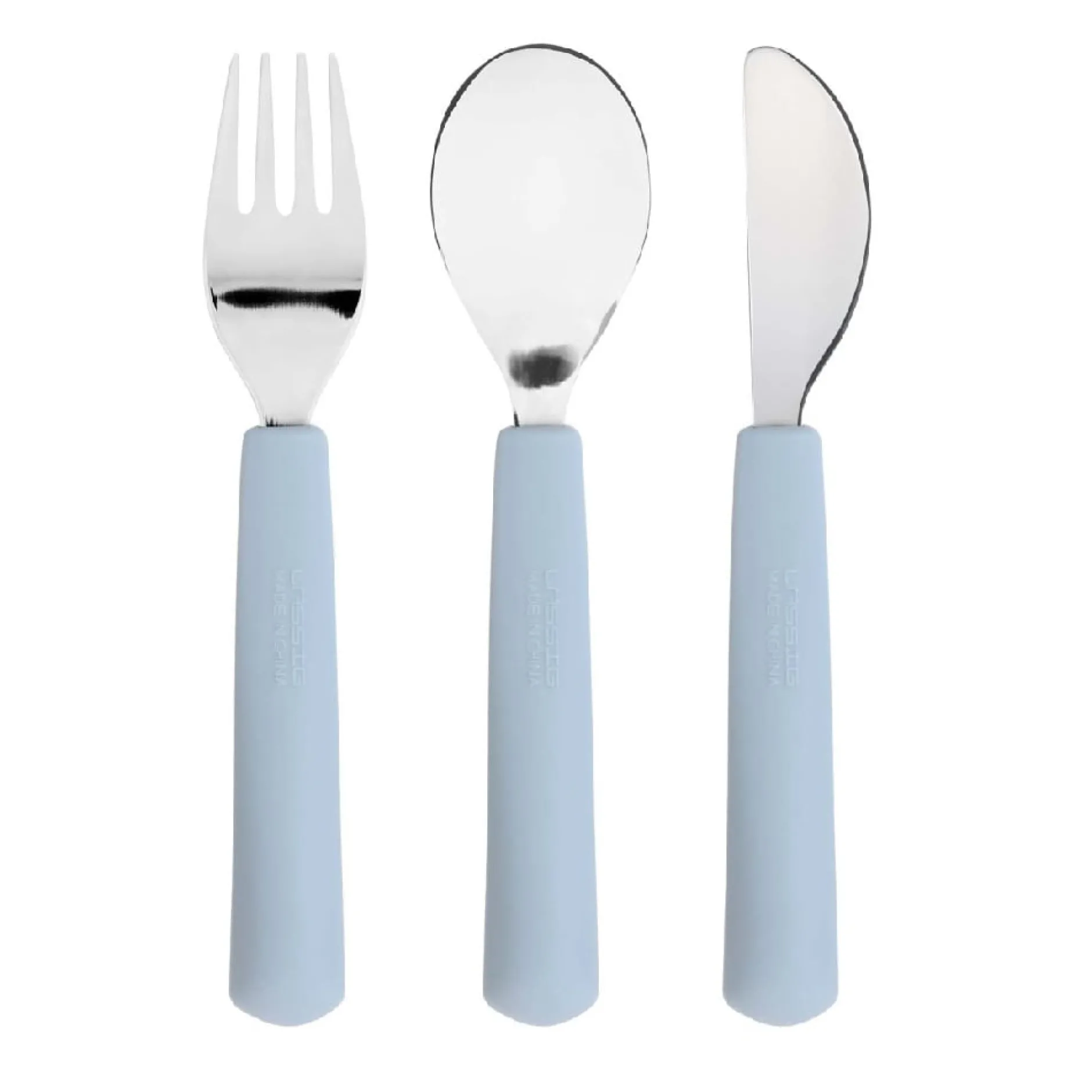 Le set est composé d’un couteau, d’une fourchette et d’une cuillère en acier inoxydable avec des manches en silicone.