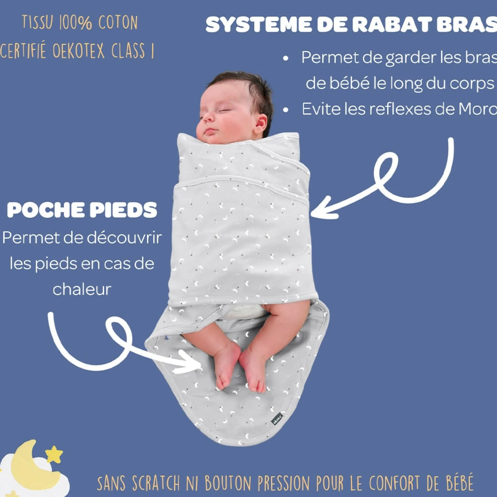 - Rabats intérieurs permettant de garder les bras de bébé le long du corps et d’éviter le réflexe de Moro (mouvements désordonnés des bras de bébé qui le réveillent en sursaut et le font pleurer)