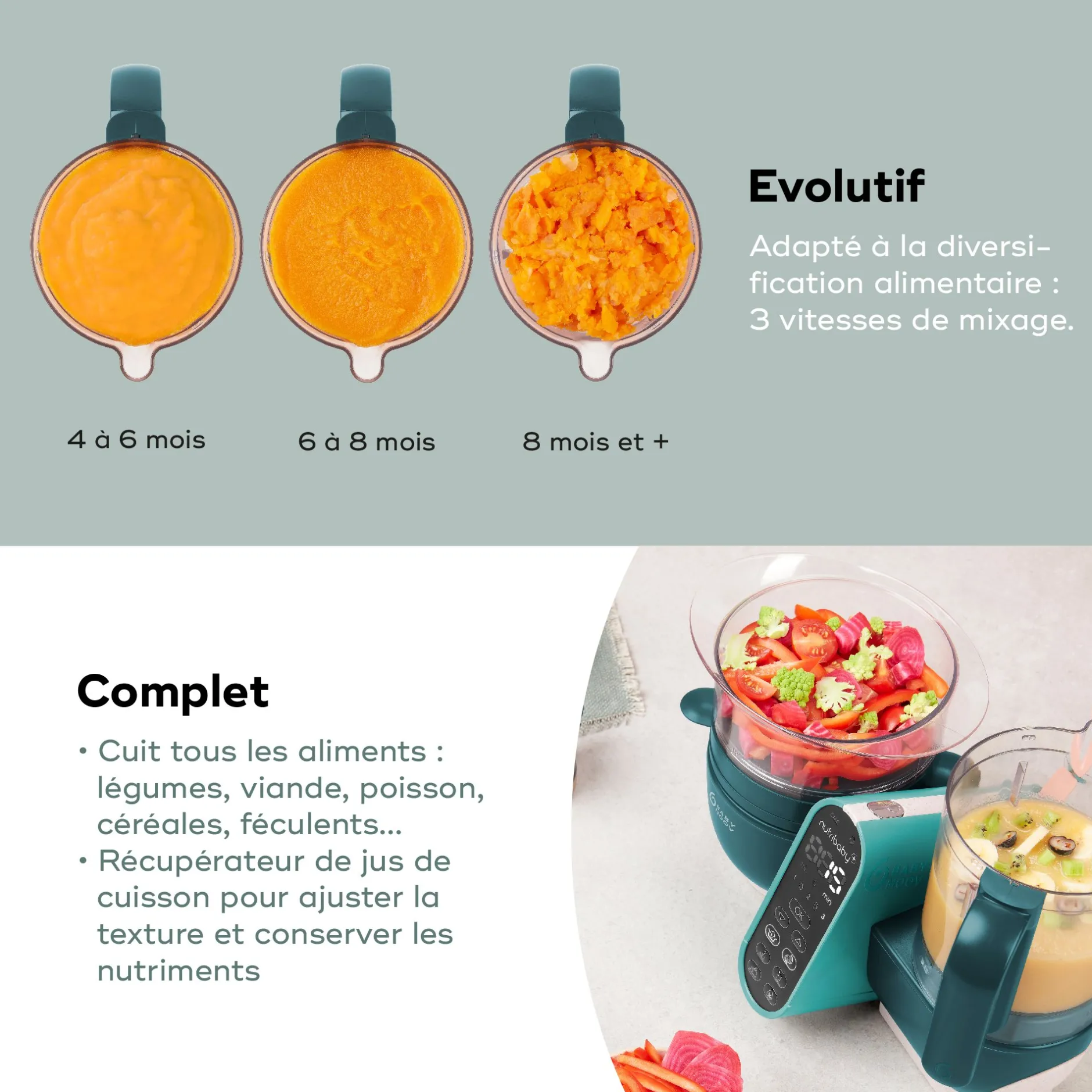 - Evolutif : des préparations adaptées à la diversification de votre bébé et pour toute la famille