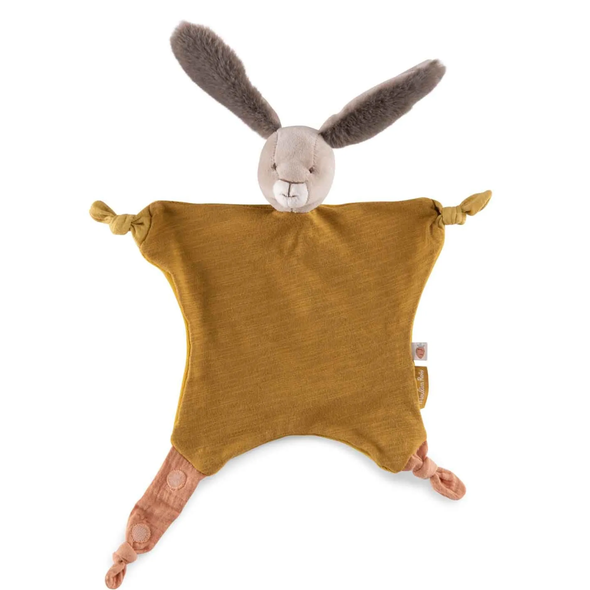 Doudou plat lapin ocre avec attache-tétine. Compagnon bi-matières réconfortant aux grandes oreilles toutes douces. Noué à chaque coin, il est facile à saisir par les petites mains et sera un allié précieux pour bébé.