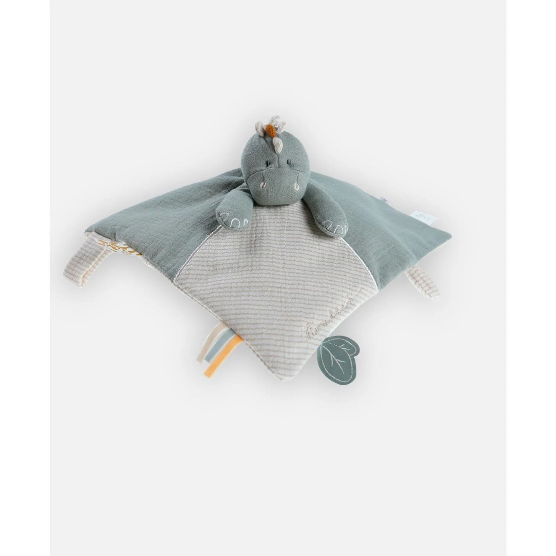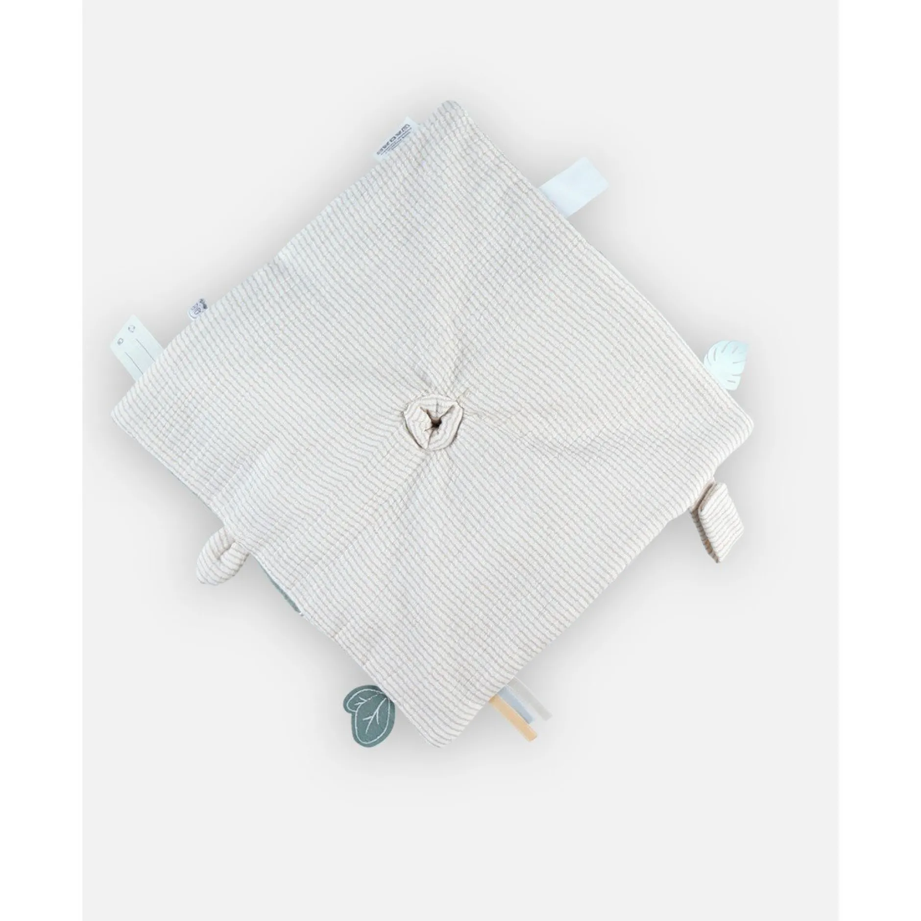 Grâce à son attache en velcro, le doudou Stegi vert eucalyptus en mousseline de coton BIO de la collection Tiga, Stegi & Ops s’attache facilement à la manche du pyjama Noukie’s ou à la tétine.