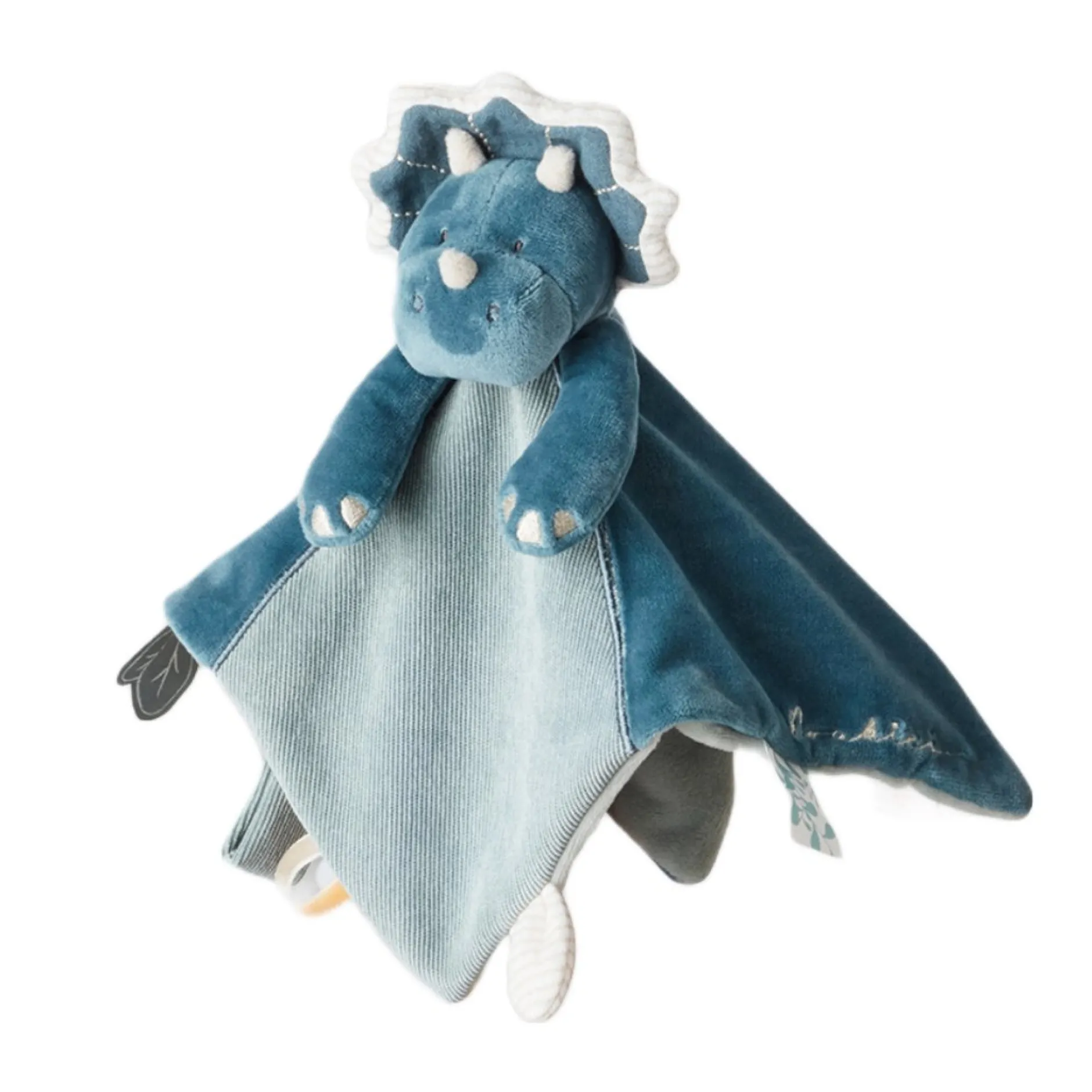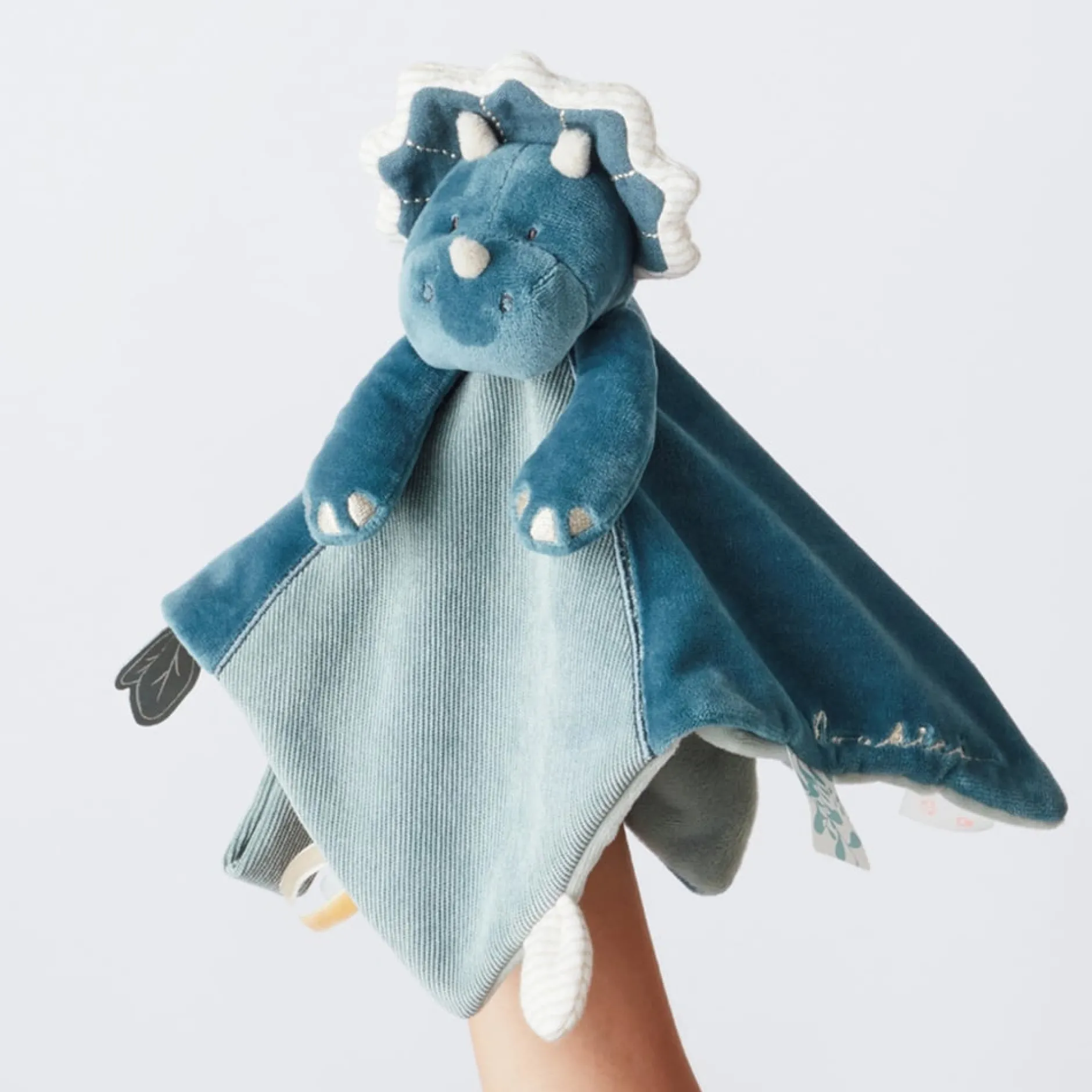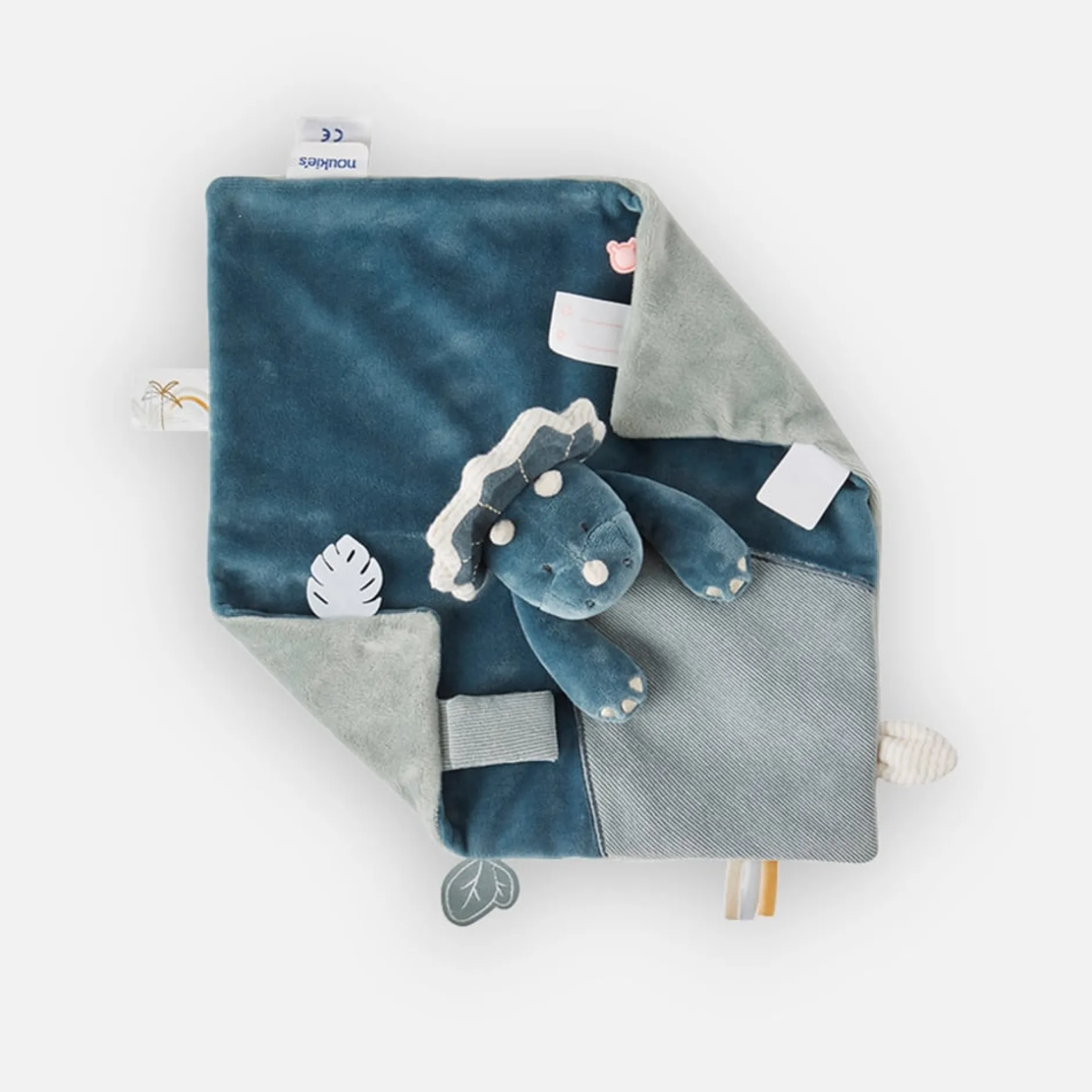 Grâce à son attache en velcro, les doudous de la collection Tiga, Stegi & Ops s’attache facilement à la manche du pyjama Noukie’s ou à la tétine. Ce doudou rassurant et réconfortant suivra bébé dans tous ses déplacements. Noukie’s y a ajouté des étiquettes colorées, de matières et de tailles différentes pour stimuler l’éveil des sens de bébé en toute sécurité.