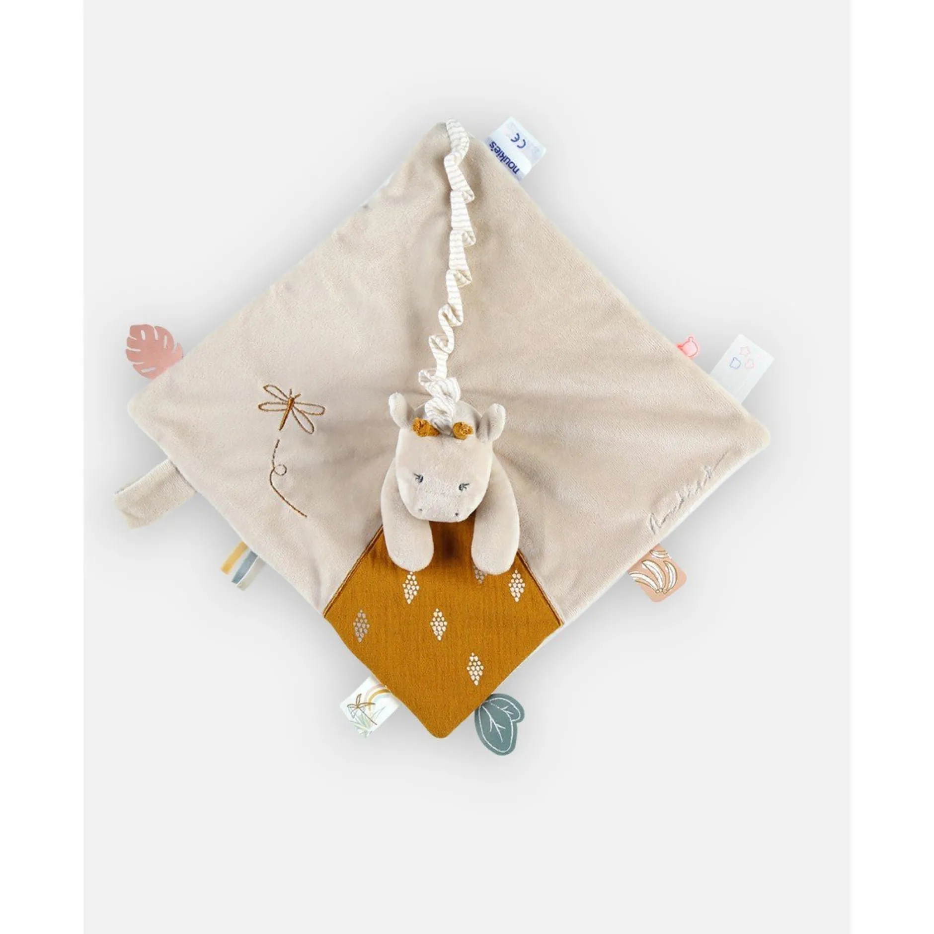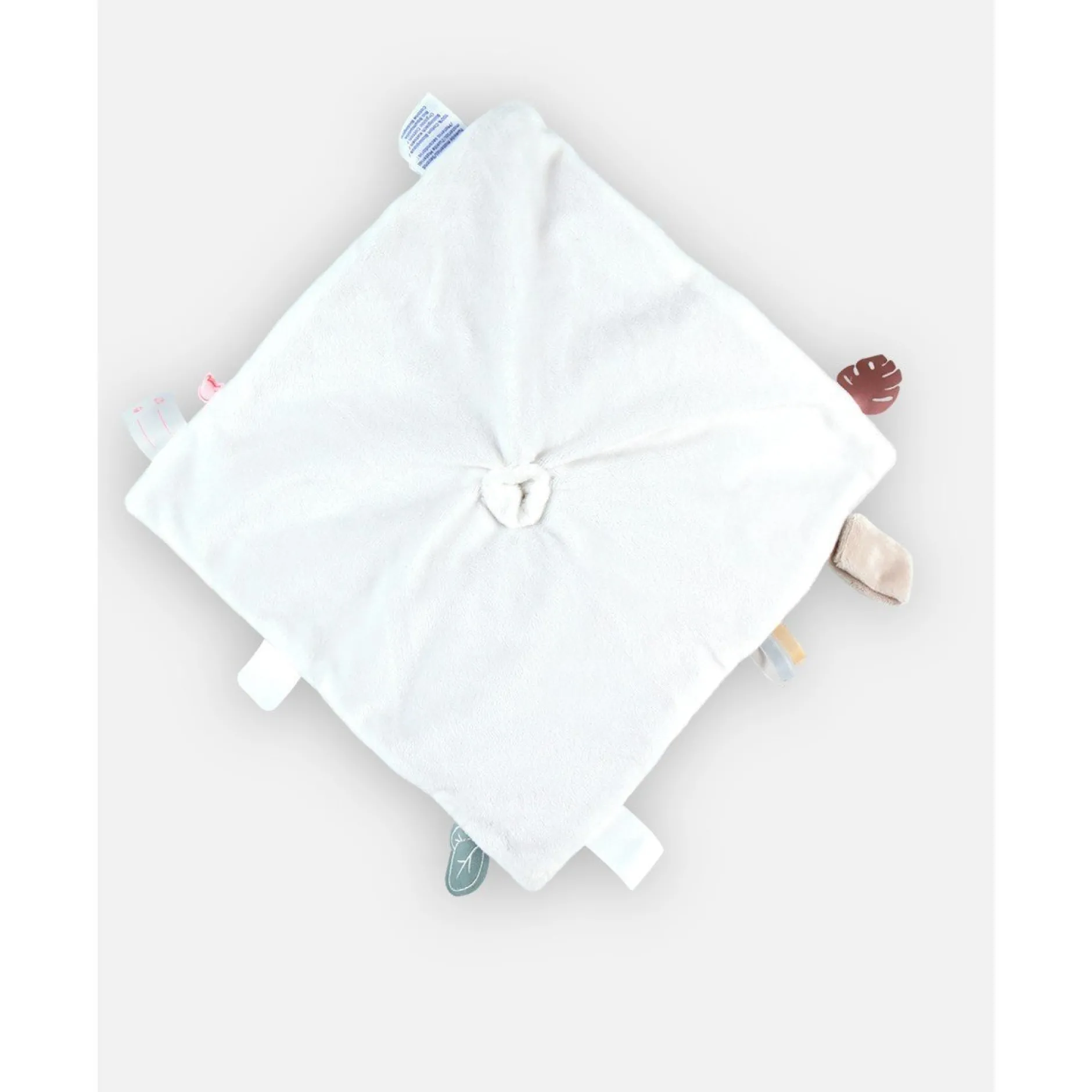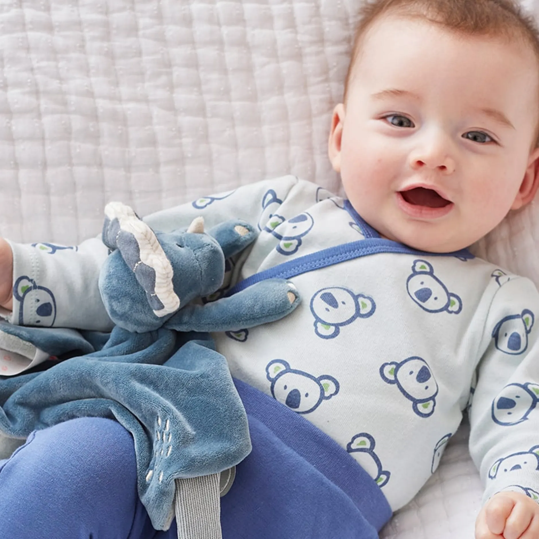 Grâce à son attache en velcro, les doudous de la collection Tiga, Stegi & Ops s’attache facilement à la manche du pyjama Noukie’s ou à la tétine. Ce doudou rassurant et réconfortant suivra bébé dans tous ses déplacements. Noukie’s y a ajouté des étiquettes colorées, de matières et de tailles différentes pour stimuler l’éveil des sens de bébé en toute sécurité.