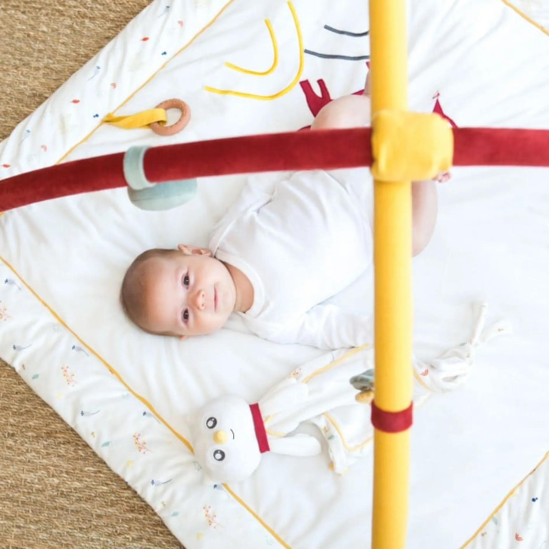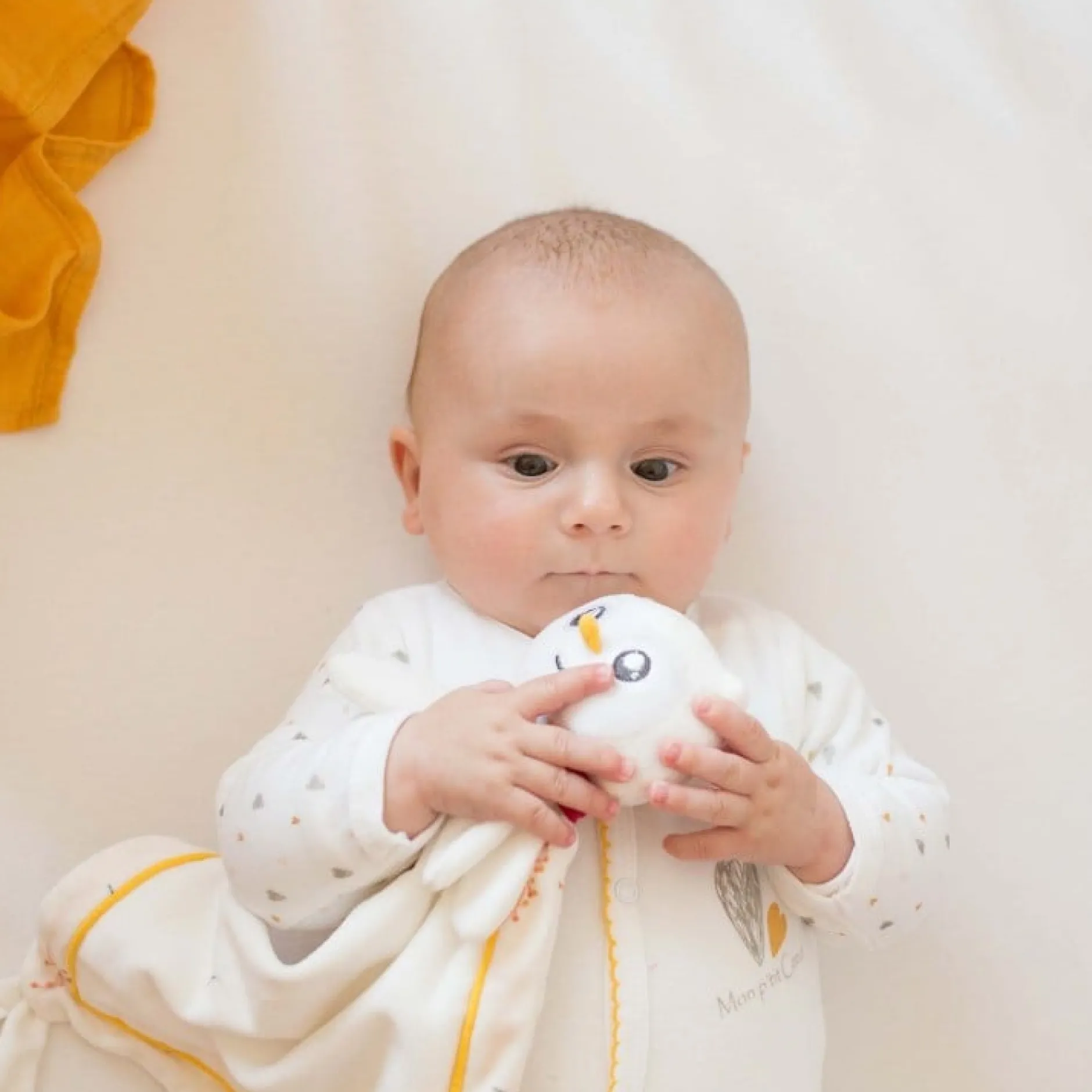 Le doudou Violette aux tons neutres et avec un magnifique liseré jaune primevère surmonté de l’adorable frimousse d…