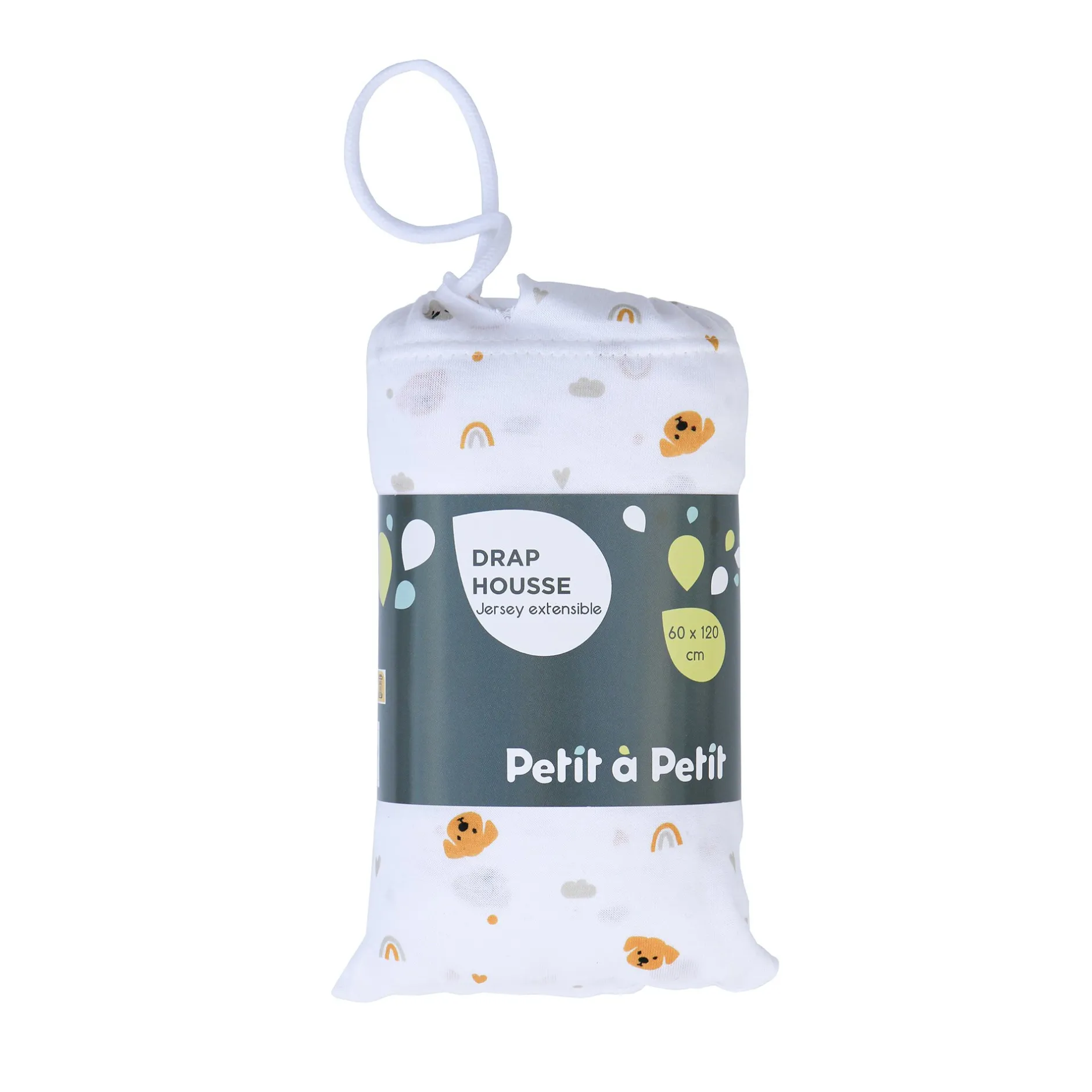Drap housse en jersey. Existe en plusieurs coloris et en différentes tailles : 40×80 cm, 60×120 cm ou 70×140 cm.