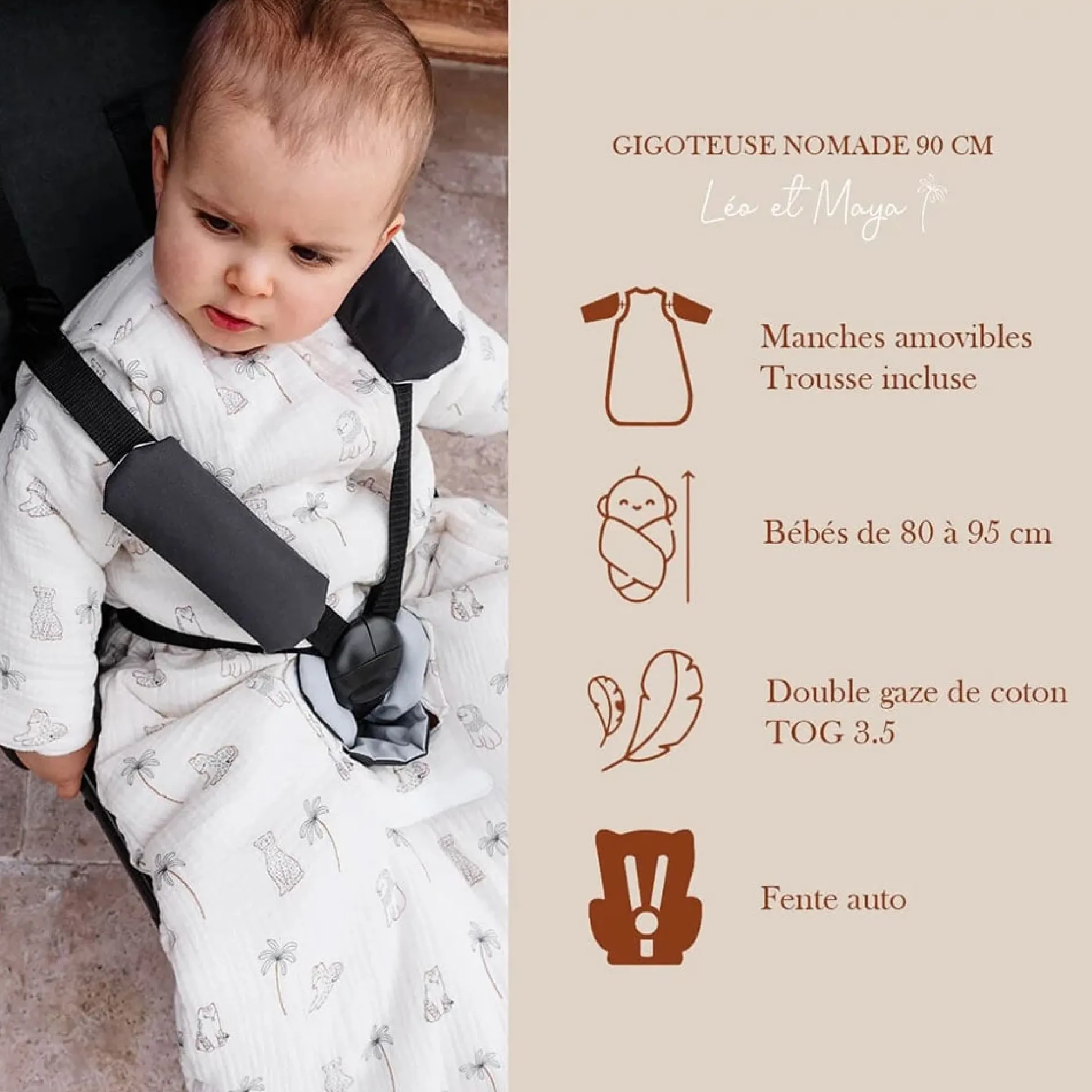 La collection Léo et Maya invite les tout-petits à embarquer pour un voyage au cœur d’une savane enchantée, où les léopards et les palmiers dansent sous le ciel. Chaque gigoteuse est une promesse de tendresse.