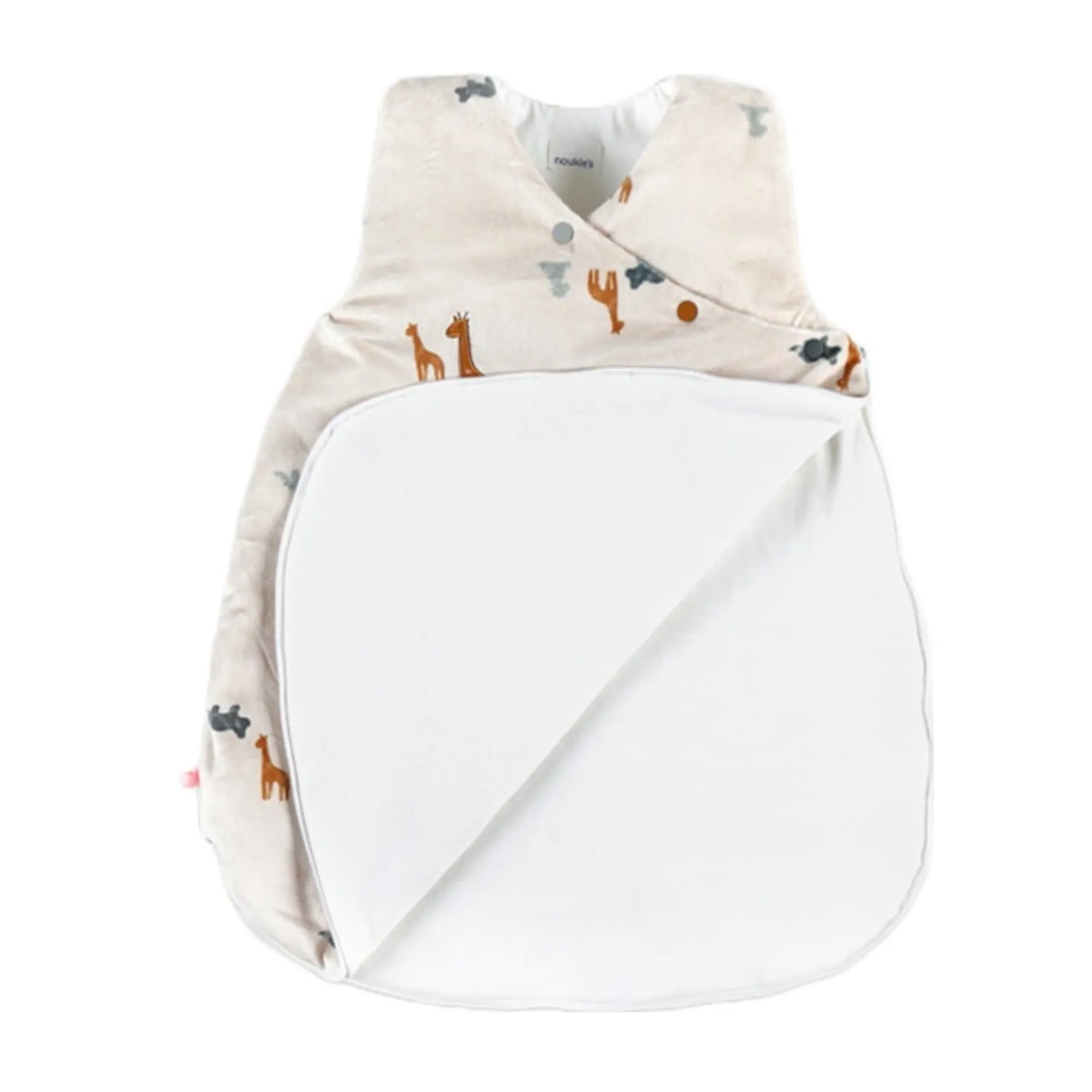 Boutons pressions aux emmanchures pour s’adapter à bébé et pour qu’il ne glisse pas à l’intérieur, et ouverture zip pour faciliter le change. L’absence de manche permet une ventilation naturelle et la régulation de température du corps.