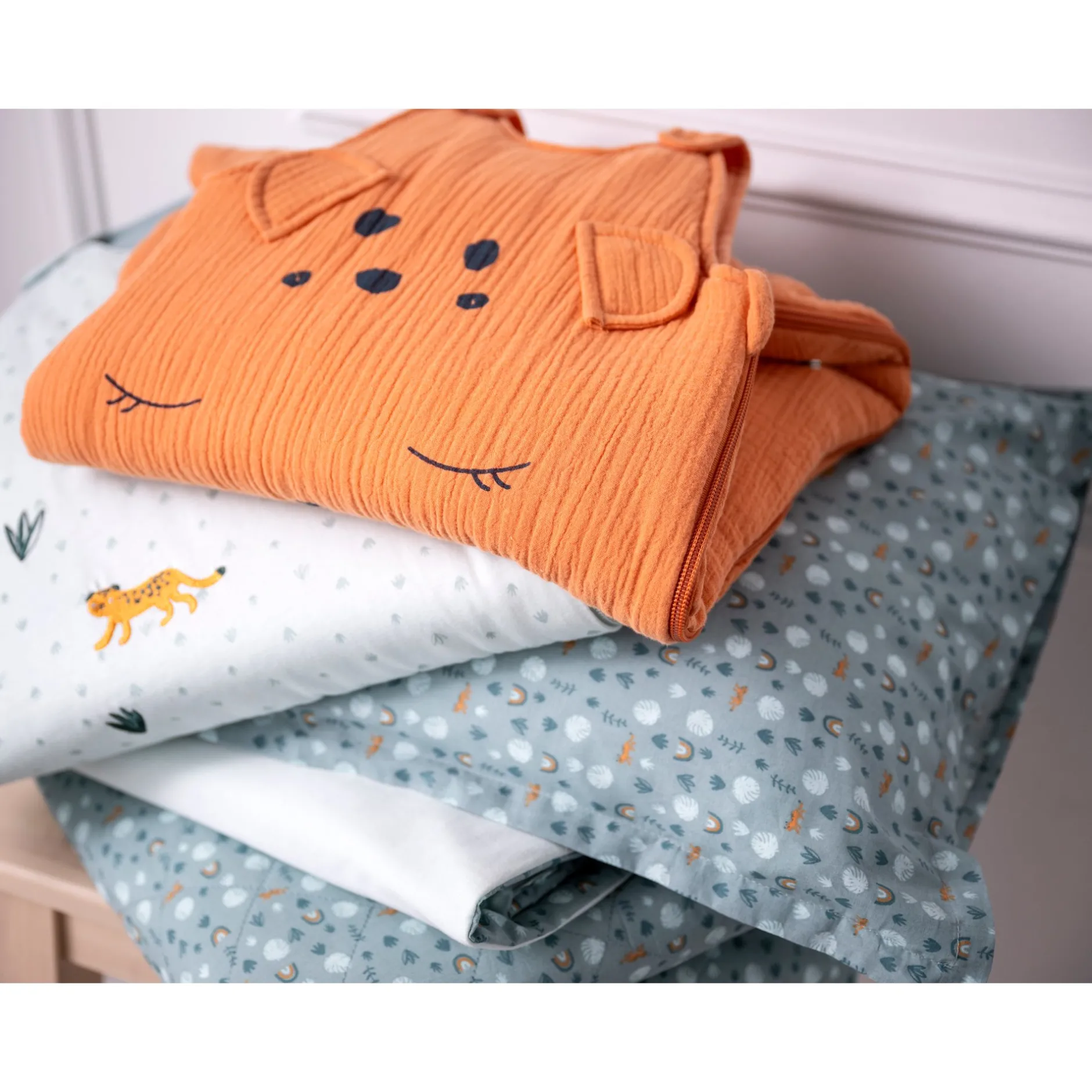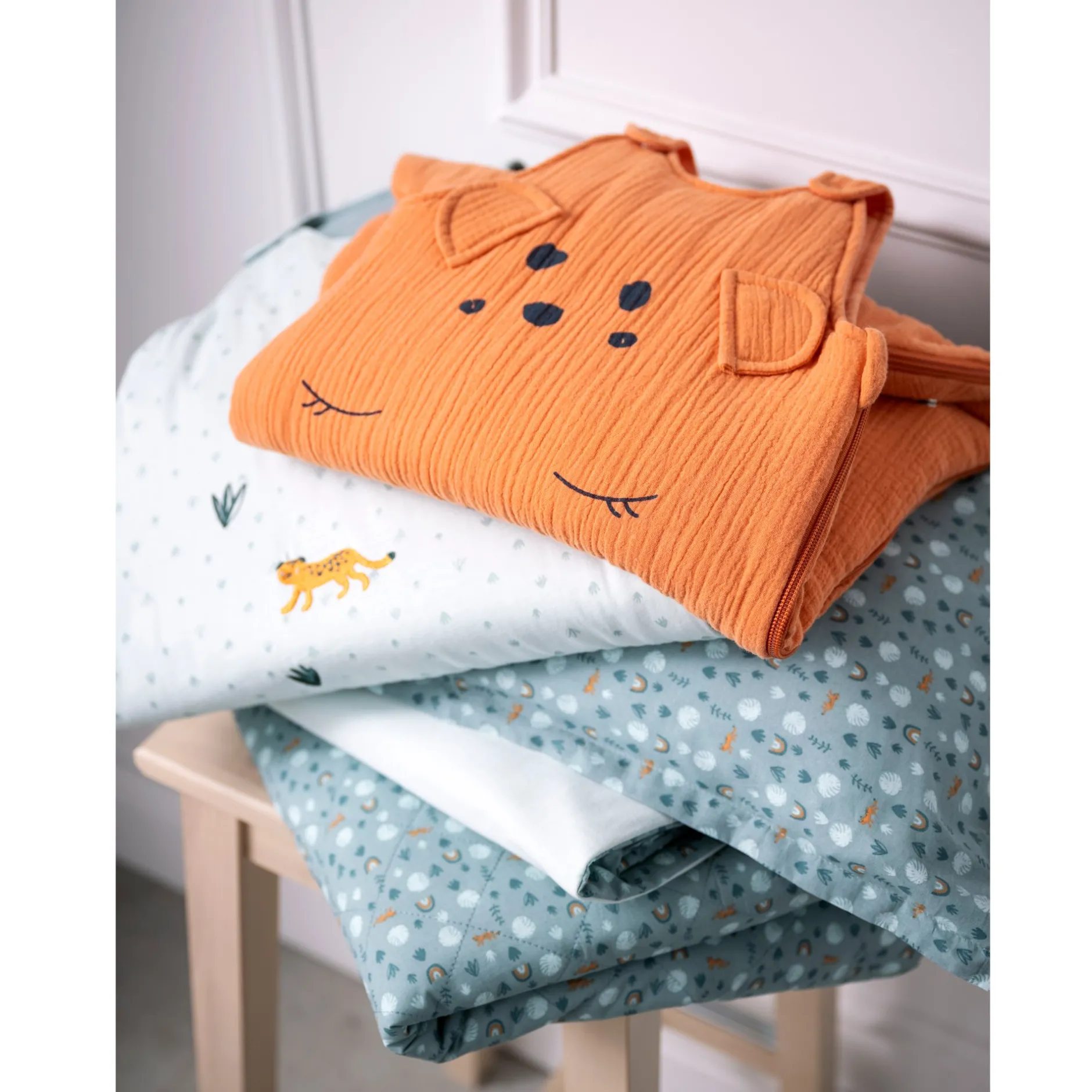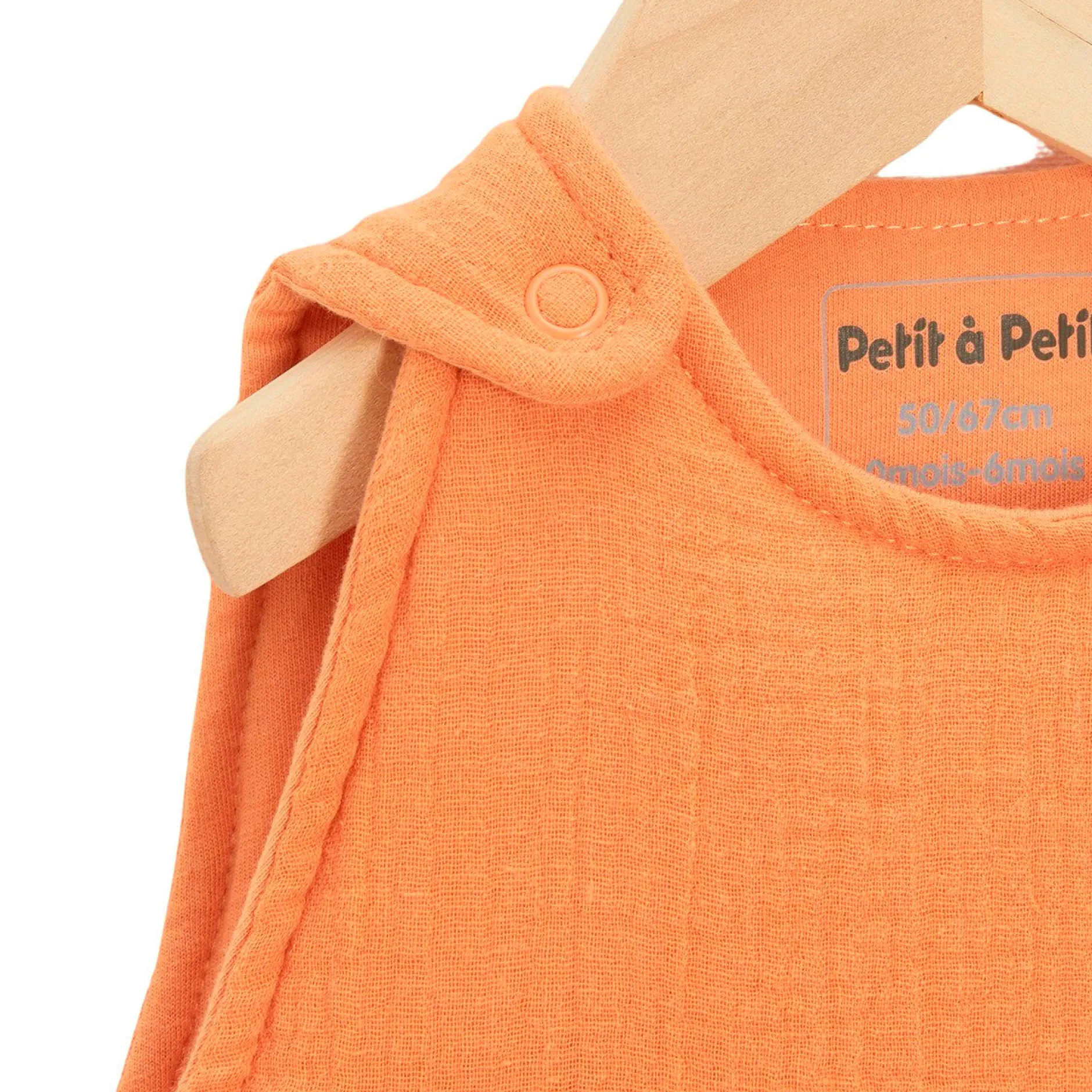 Gigoteuse Petit à petit en mousseline de gaze orange muscade. Pressions aux épaules et zip sur le côté pour permettre une bonne ouverture pour une mise en place aisée de bébé. Cette gigoteuse a une jolie tête de félin sur le devant très affective et des éléments en doré. La taille de ce produit est 0-6 mois, TOG = 2,5.