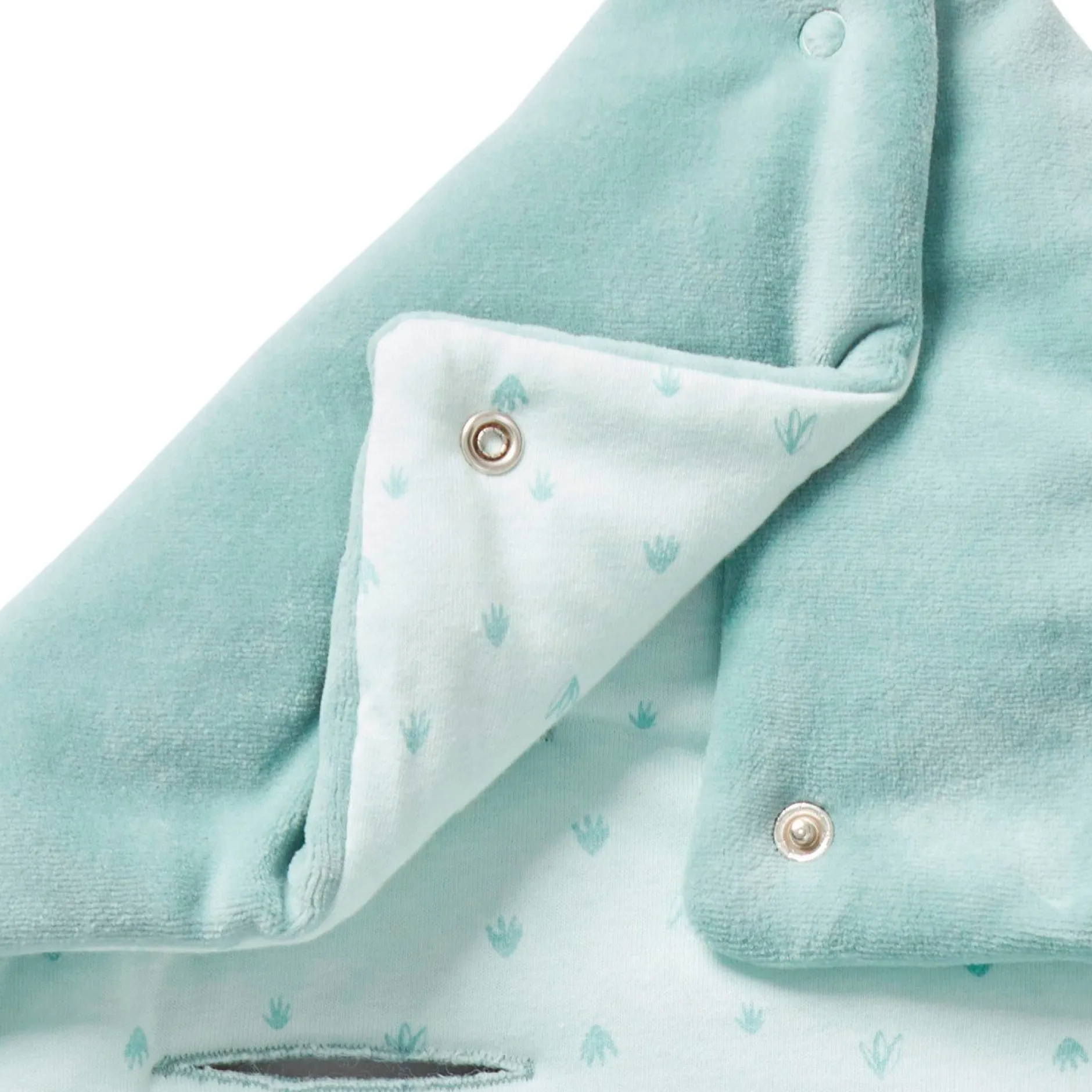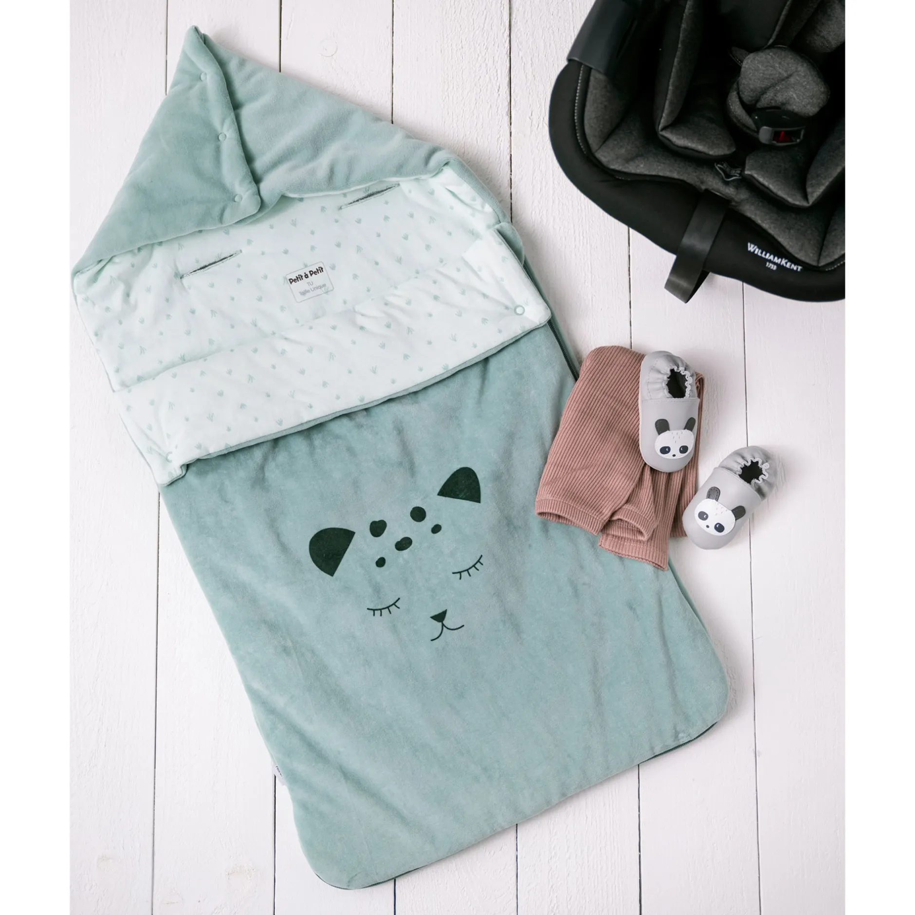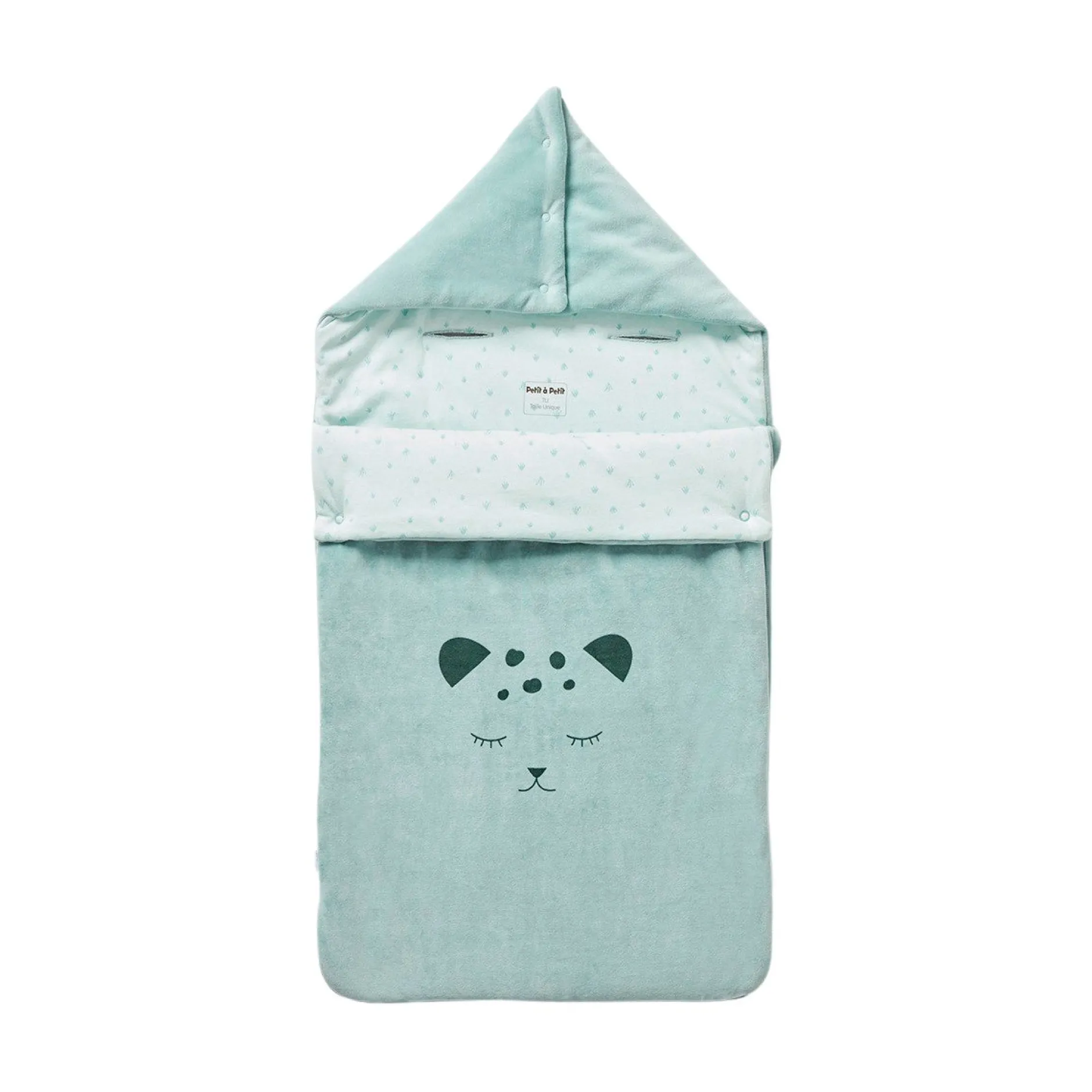 Nid d’ange Petit à petit en velours tout doux en coloris vert eucalyptus. Il est garni de ouate pour un meilleur confort et doublé de jersey imprimé petite végétation sur fond vert d’eau . Belle animation sur le devant avec une impression à la fois ludique et affective : la petite tête de félin ! La forme est à la fois cocoon et très fonctionnelle : ouverture par zip sur le côté pour ouvrir entièrement le produit sans à avoir à trop manipuler bébé.