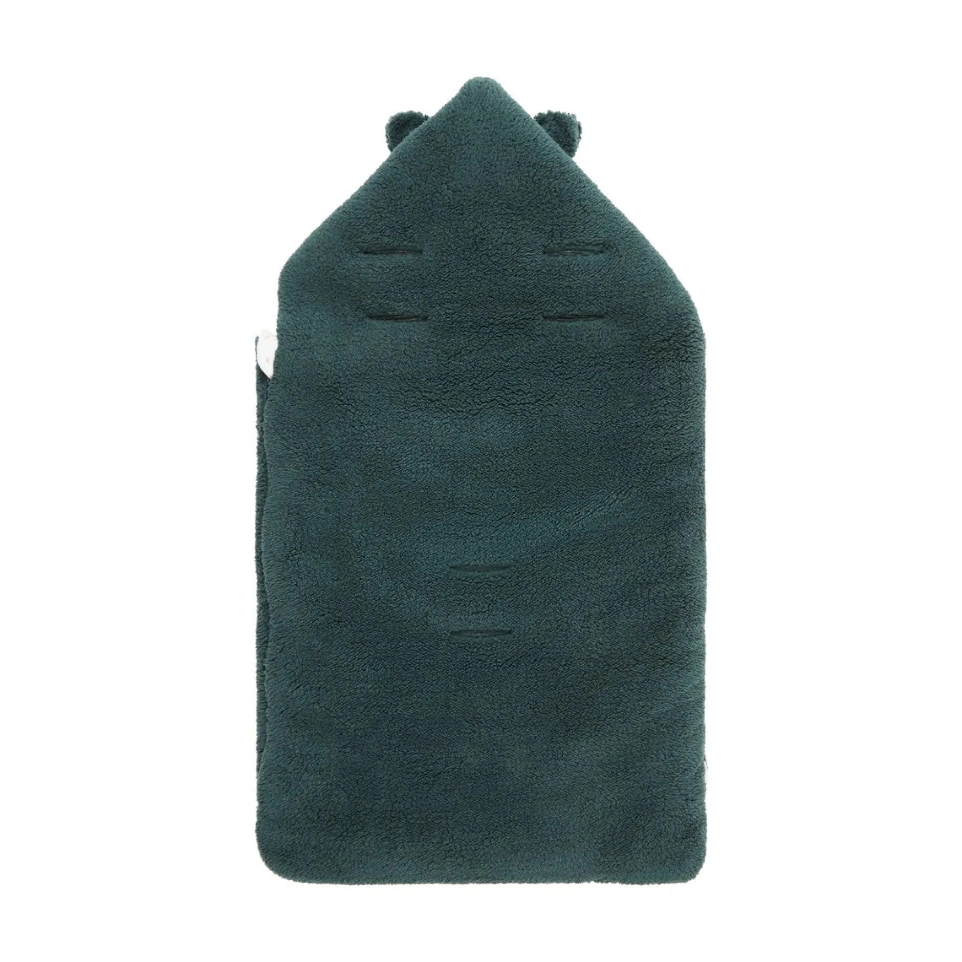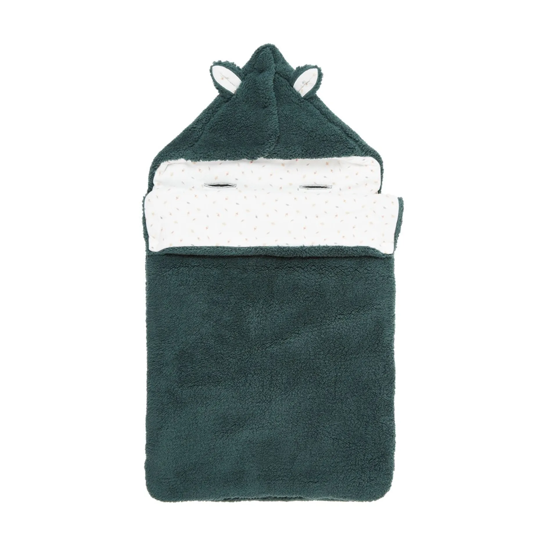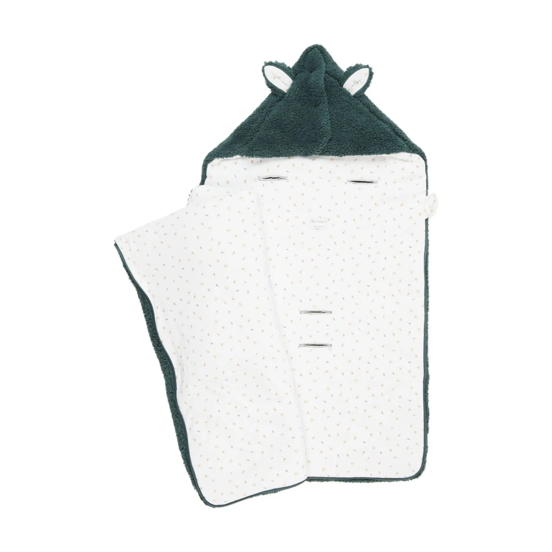 La forme est à la fois cocoon et très fonctionnelle : ouverture par zip sur le côté pour ouvrir entièrement le produit sans à avoir à trop manipuler bébé. La capuche peut se mettre par des pressions pour couvrir la tête de bébé et la maintenir au chaud. Elle est ludique et affective avec ses petites oreilles en volume. Mais sinon la capuche peut se rabattre à plat sur le devant pour le lit.