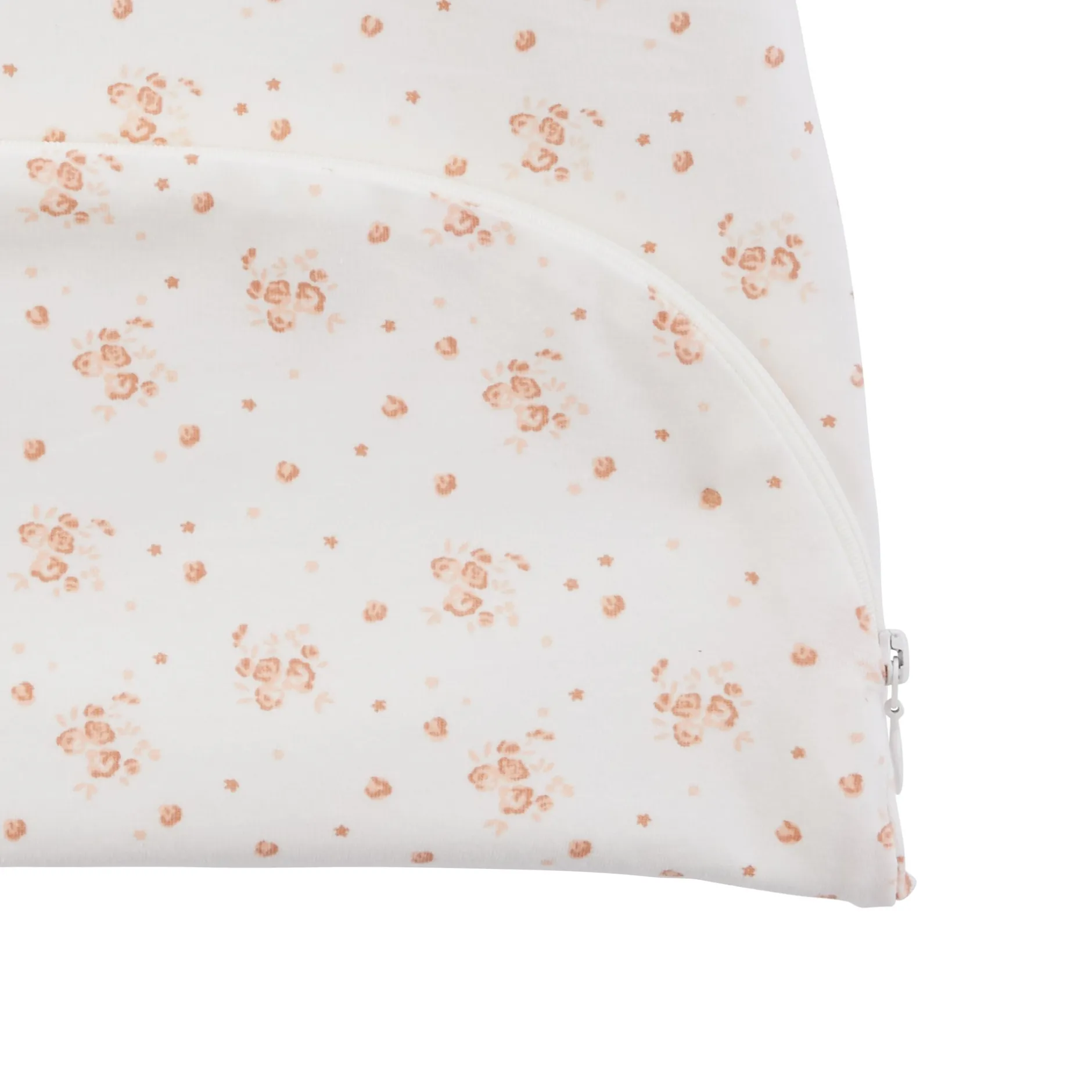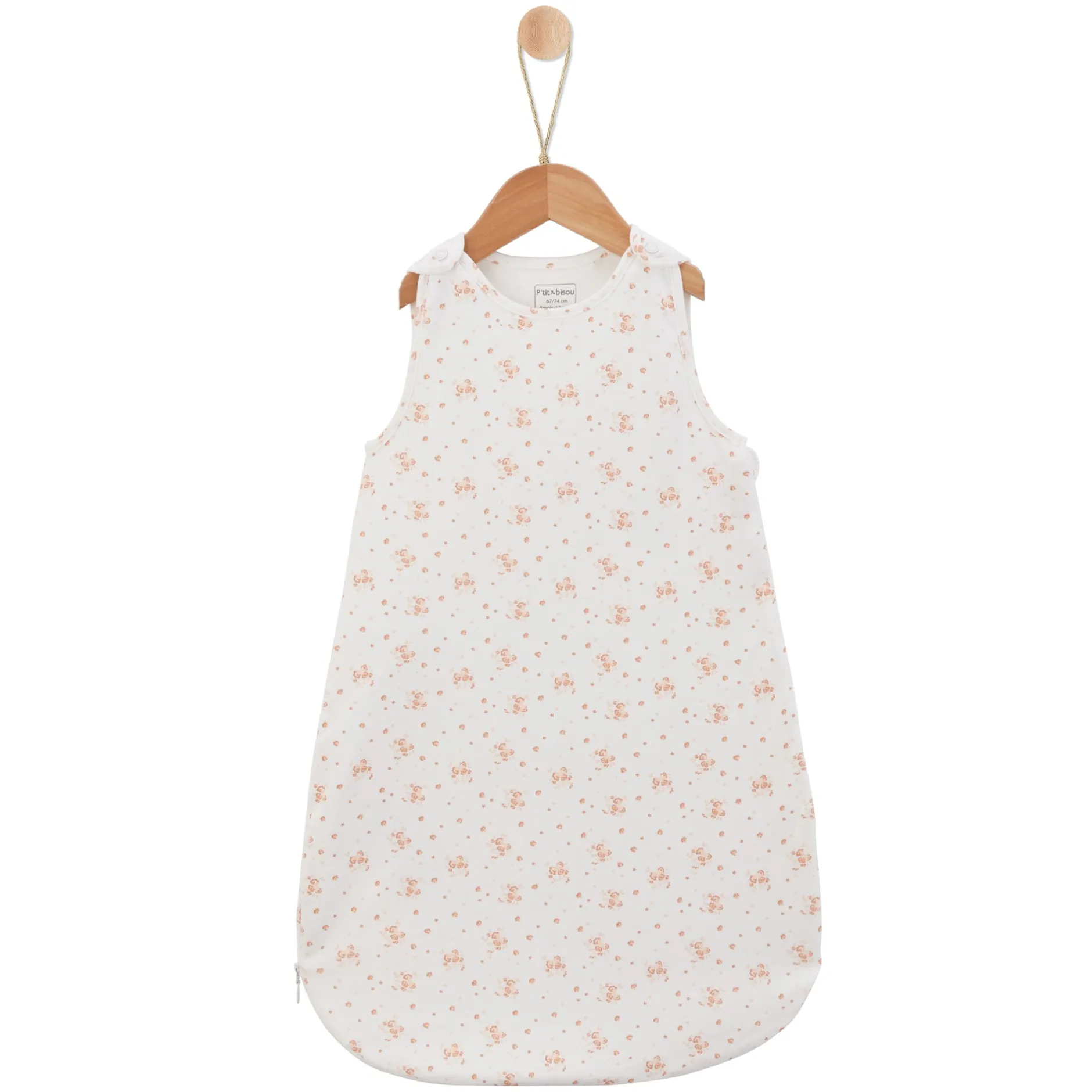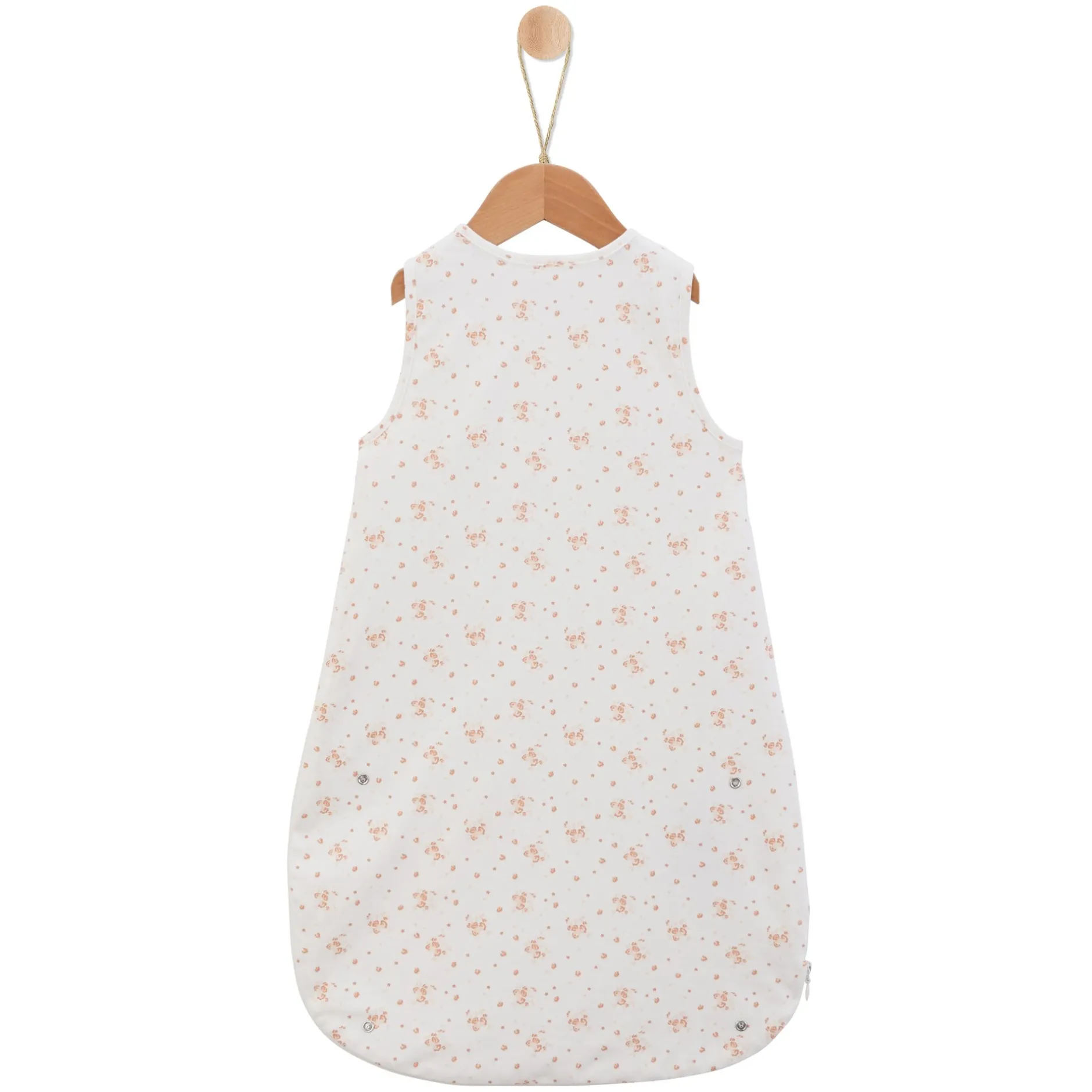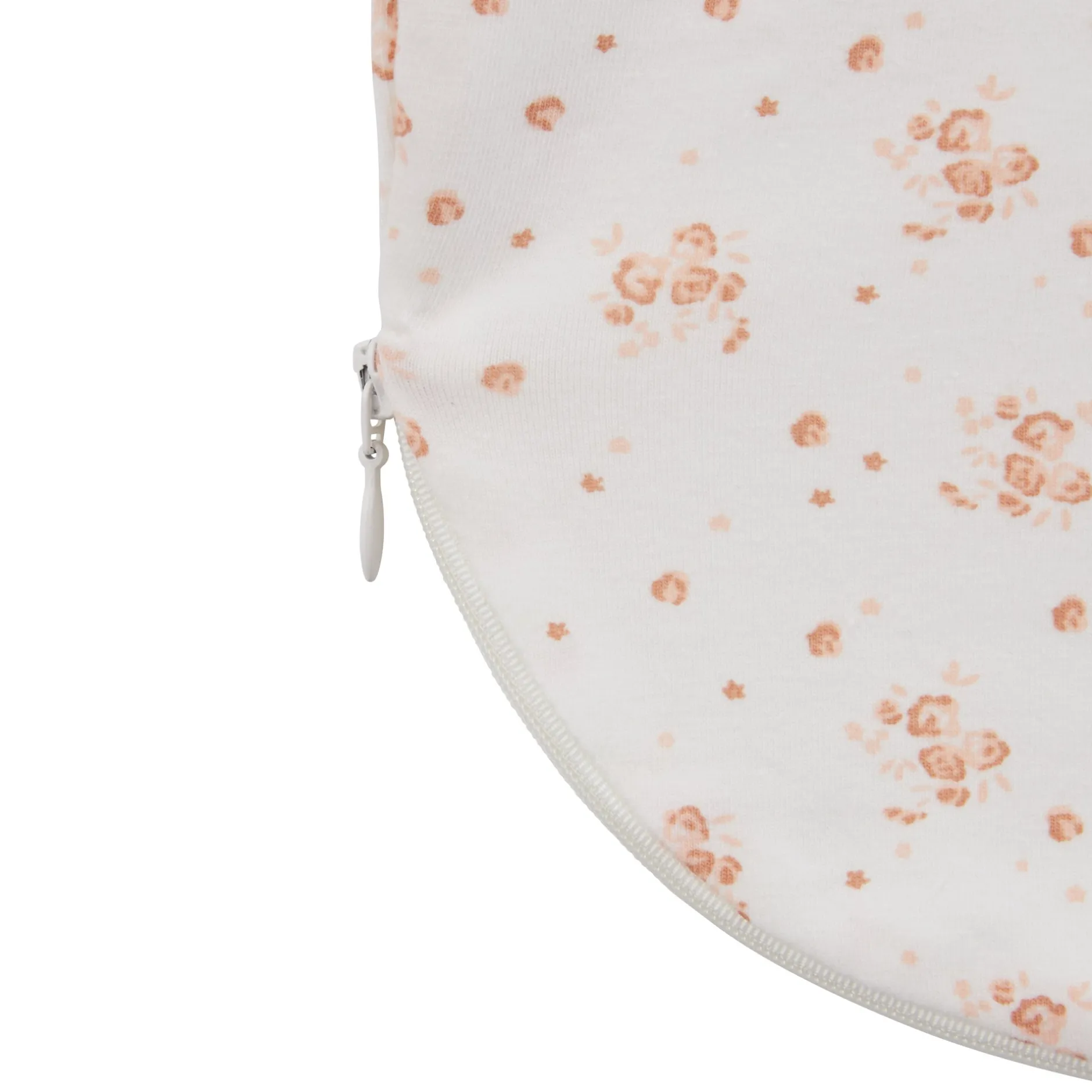 Gigoteuse P’tit Bisou en jersey motif floral en camaïeu de rose sur fond écru. Doublée de jersey pour le confort mais non ouatinée car l’utilisation est une gigoteuse légère en période estivale quand les températures s’élèvent. Ouverture par zip sur le côté et pressions aux épaules. Cette gigoteuse est ajustable derrière par pressions pour la raccourcir et s’adapter à des bébés plus petits.