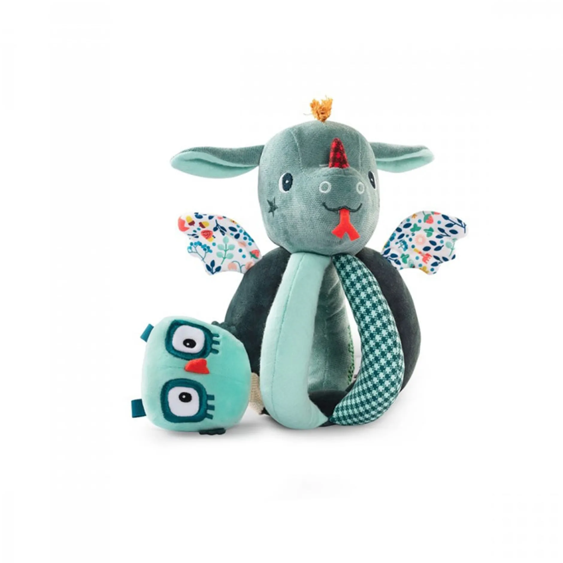 D’abord, un hochet à faire tinter encore et encore dans la tête de Joe le dragon, idéal pour éveiller votre tout-petit aux sons. Ensuite, les cinq poignées qui composent le jouet proposent différentes matières et motifs qui stimuleront la vue et le toucher. Il y a même du papier bruissant à faire crépiter !
