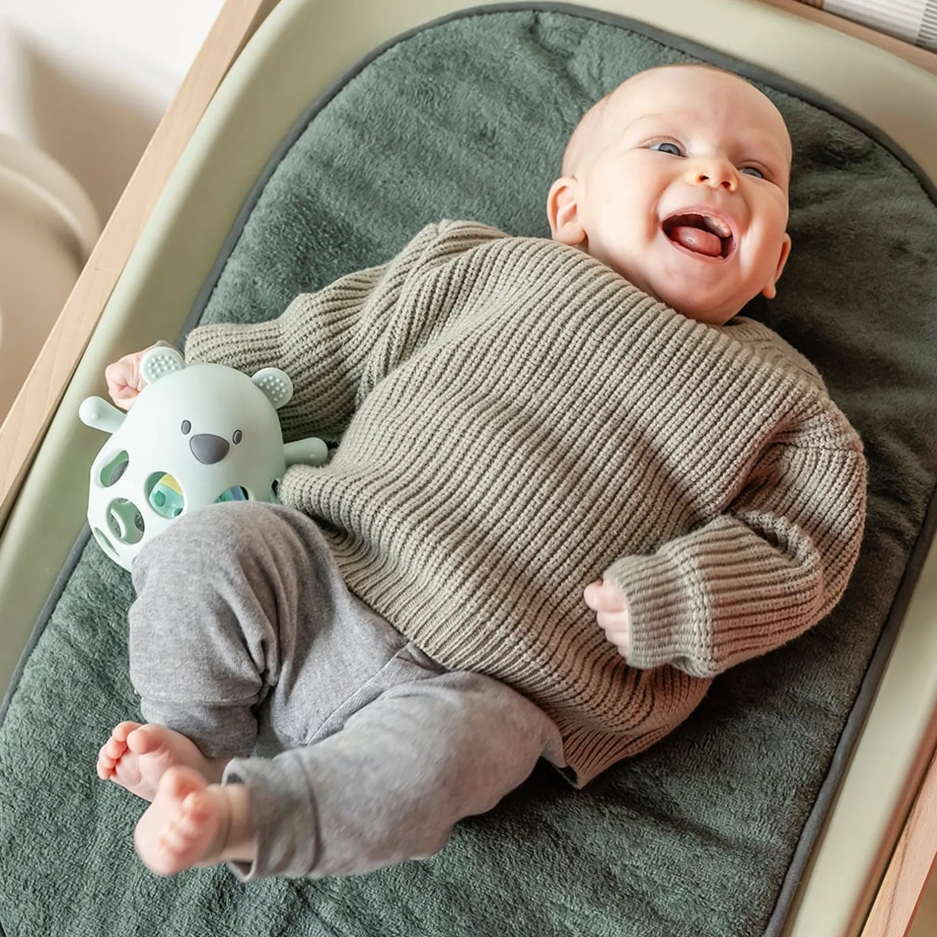 Un hochet avec une double fonction! En tant qu’anneau de dentition souple, l’ours procurent un massage bénéfique aux gencives, soulageant de manière sensible l’inconfort des premières dents. En tant que hochet, l’ours convient parfaitement aux mains fragiles de votre petit.