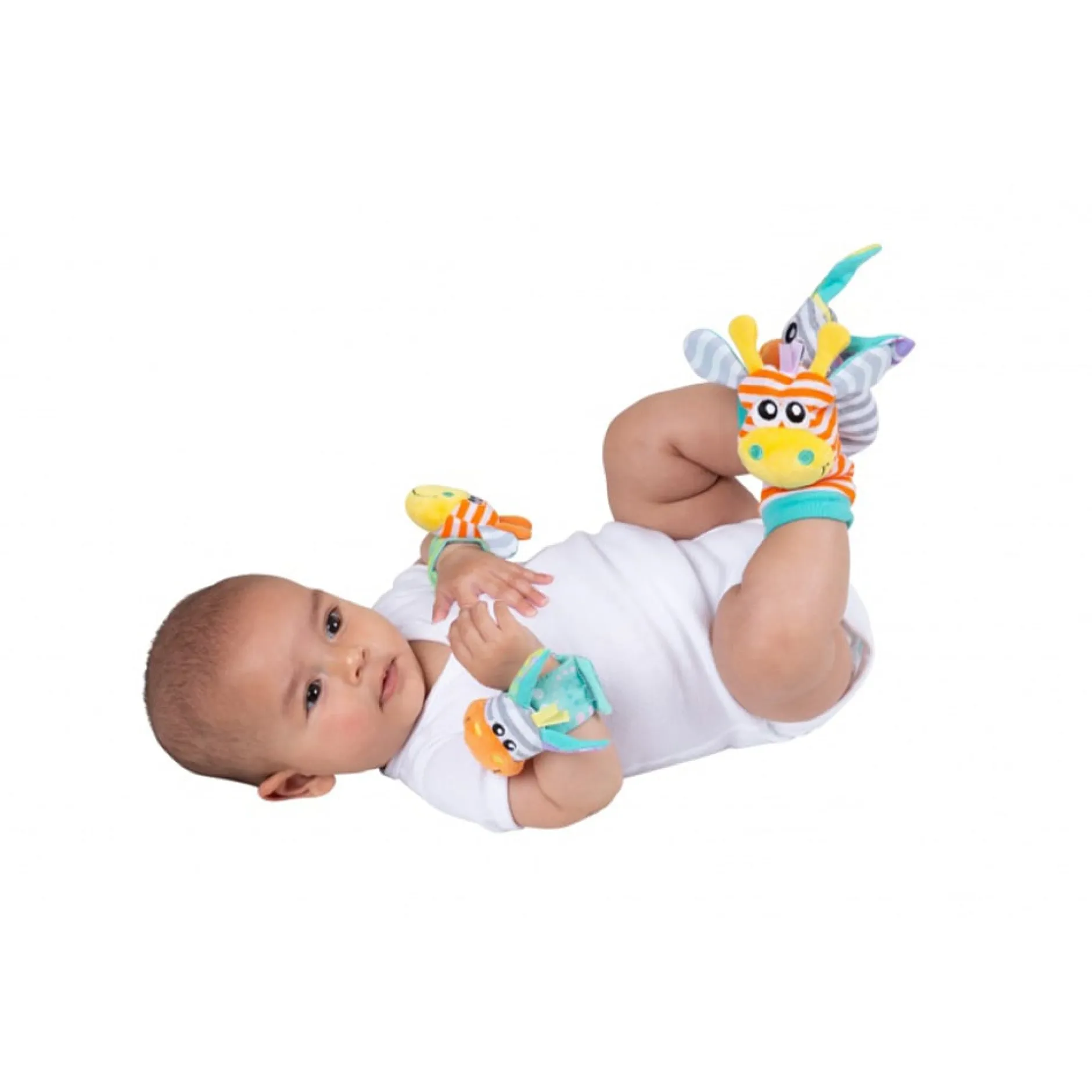 - Des bracelets en forme des mêmes animaux sont attachés au poignet de l’enfant avec du velcro. Une girafe et un zèbre sur chaque poignet aideront bébé à comprendre qu’il a 2 mains avec lesquelles jouer et beaucoup de doigts à explorer.