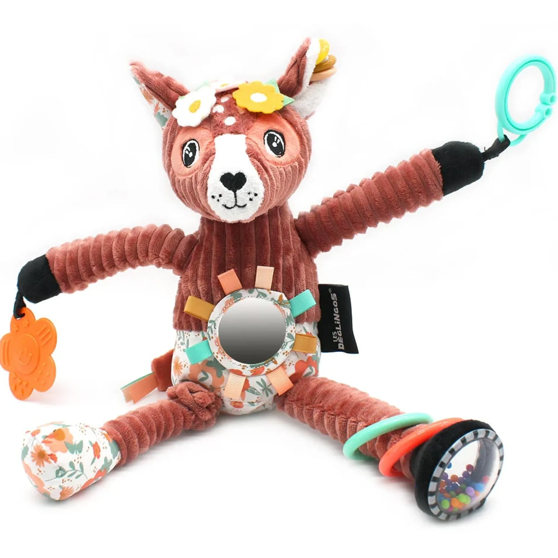 Jambe vibrante d’un côté, jambe et bras coulissants de l’autre ! Un anneau de dentition, un miroir, des billes, du papier bruissant, des anneaux de jeu… c’est bébé qui va être content ! Un vrai compagnon de jeu et de manipulation pour découvrir tout en douceur et stimuler tous les sens. Le jouet d’éveil rouge terracotta à l’effigie de Mélimélos la biche. La peluche d’activités peut s’accrocher à un lit, une poussette, un transat, une arche,… La peluche est idéale pour un cadeau naissance.