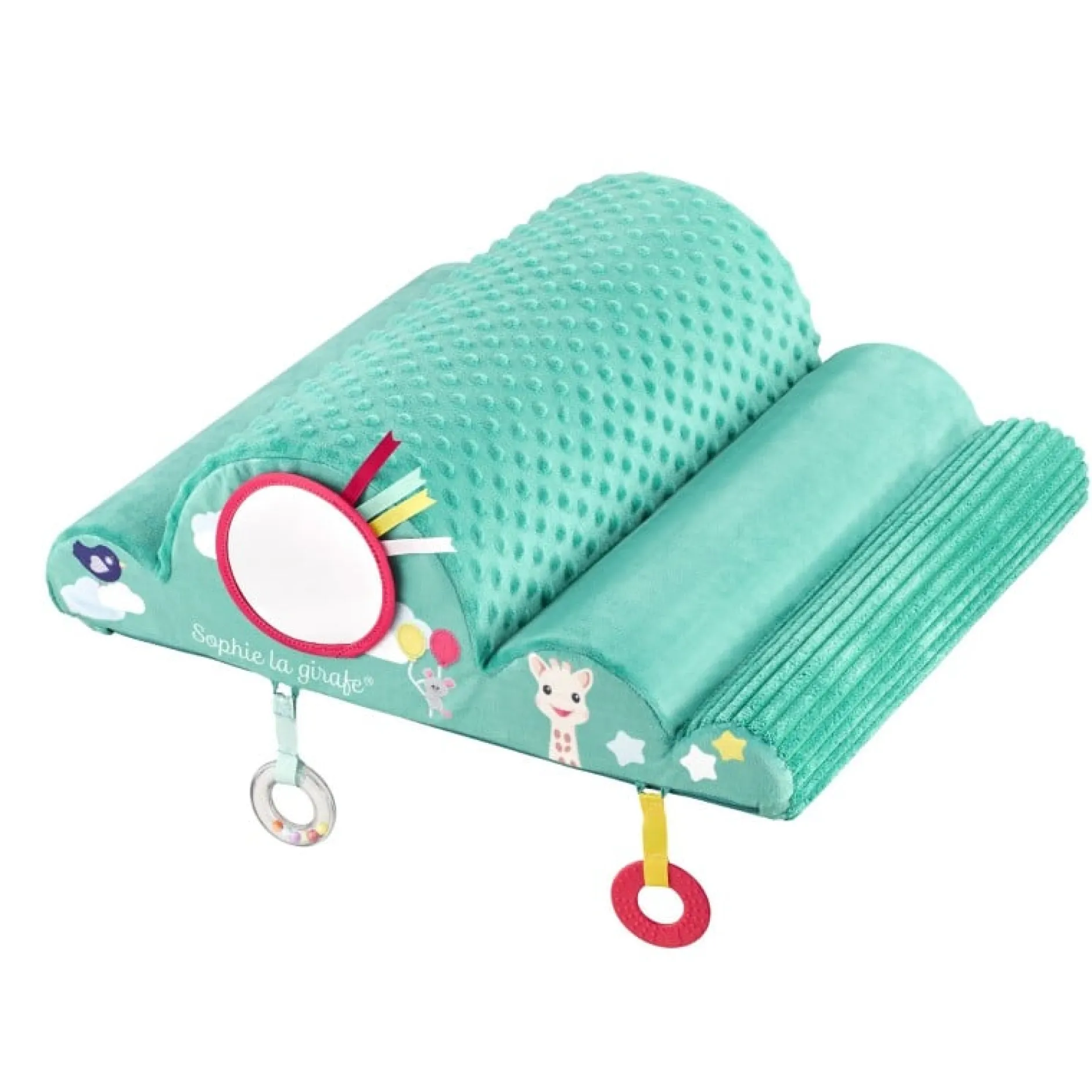 3 positions de jeu : allongé sur le ventre : bébé se muscle la nuque et le dos et s’éveille grâce aux diverses activités situées sur les deux faces du nuage (miroir, languettes, papier froissé…). en rampant ou à 4 pattes : bébé tente de gravir les marches et redescendre de l’autre côté du nuage.