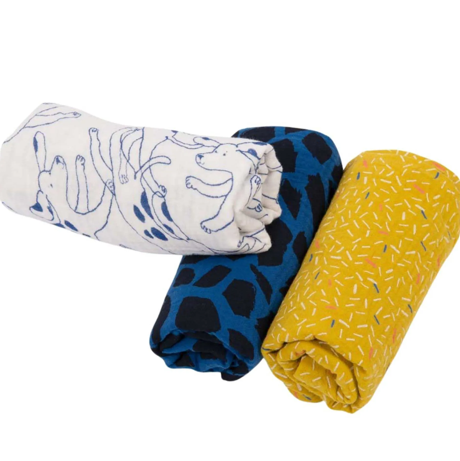Set de 3 langes certifiés OEKO-TEX® STANDARD 100 – CQ1337/1 IFTH, en coton biologique souples et légers pour changer bébé ou l’envelopper de douceur pendant les balades.