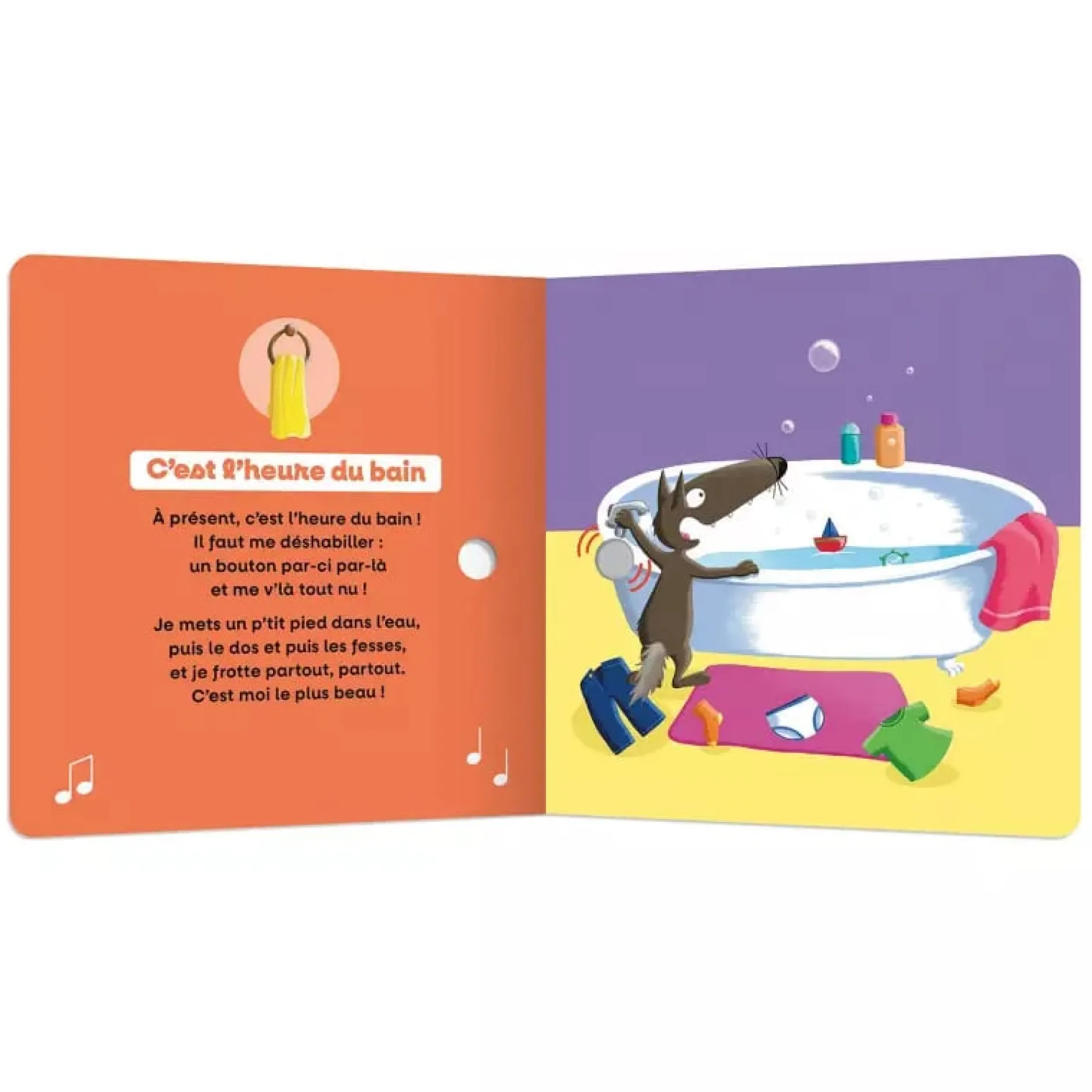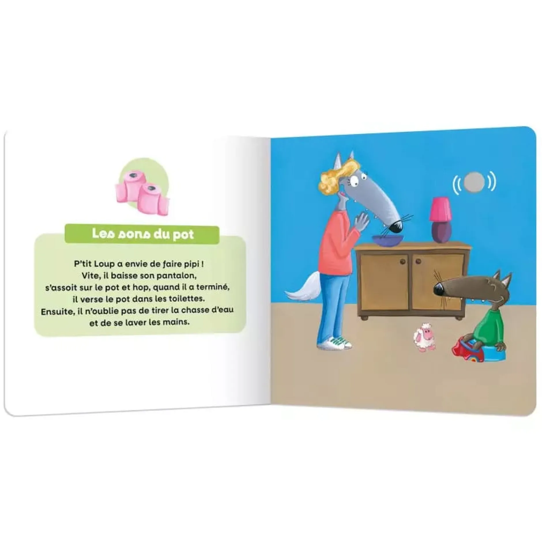 L’ouvrage contient aussi 2 pistes sonores qui reprennent les bruitages de la salle de bain et des toilettes !