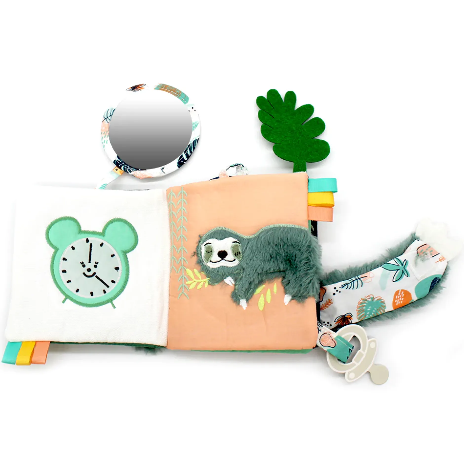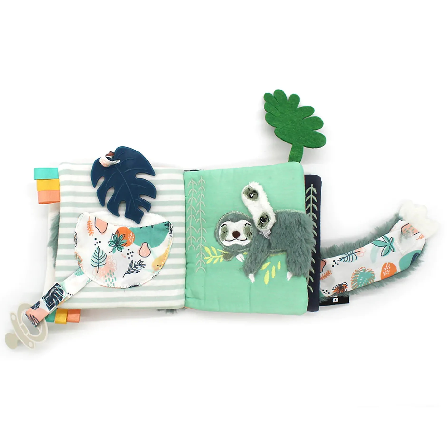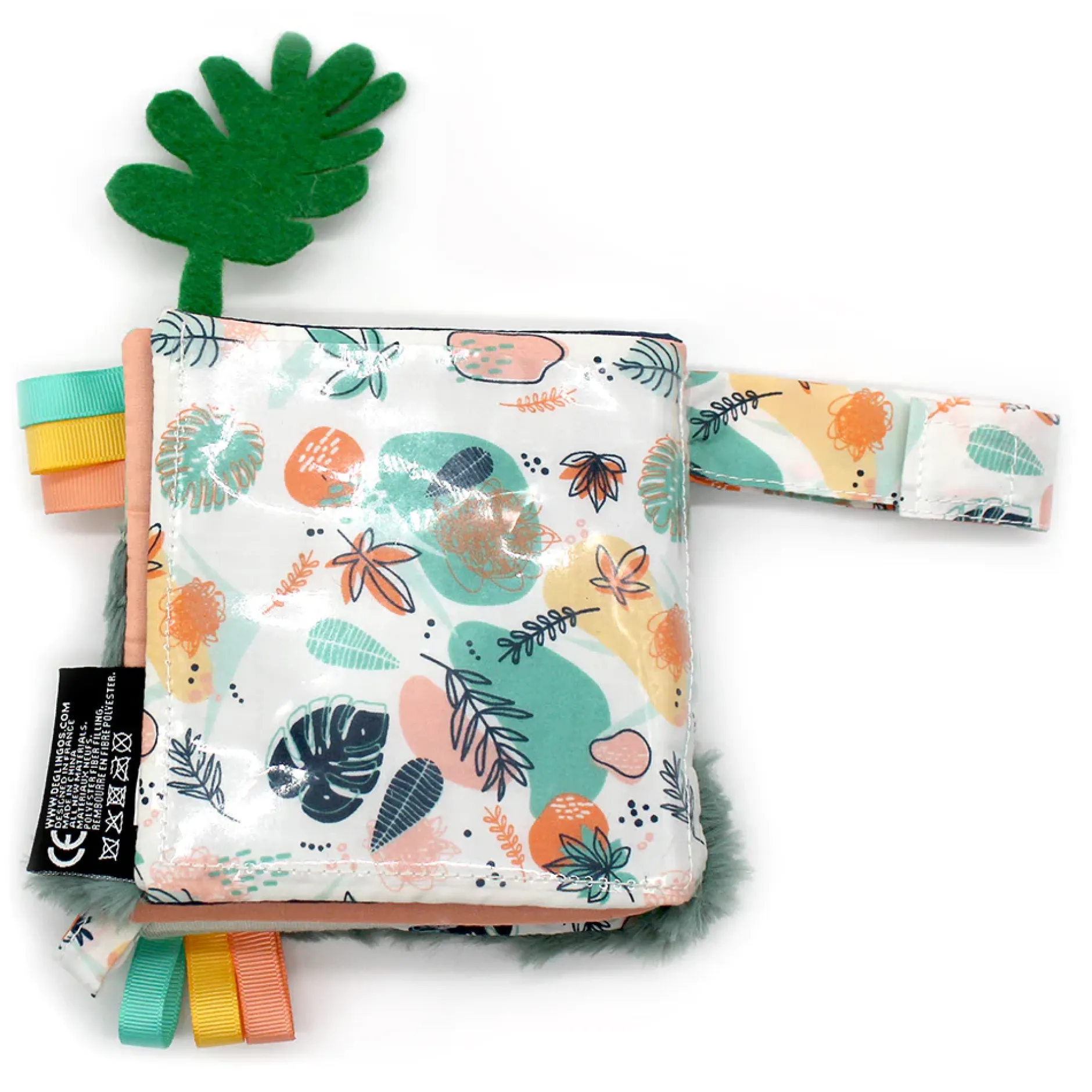 Son petit plus : ses 2 attaches ! L’une pour la sucette de bébé pour ne pas la perdre en voyage et l’autre pour attacher le livre d’éveil dans un parc, une arche, une poussette,…