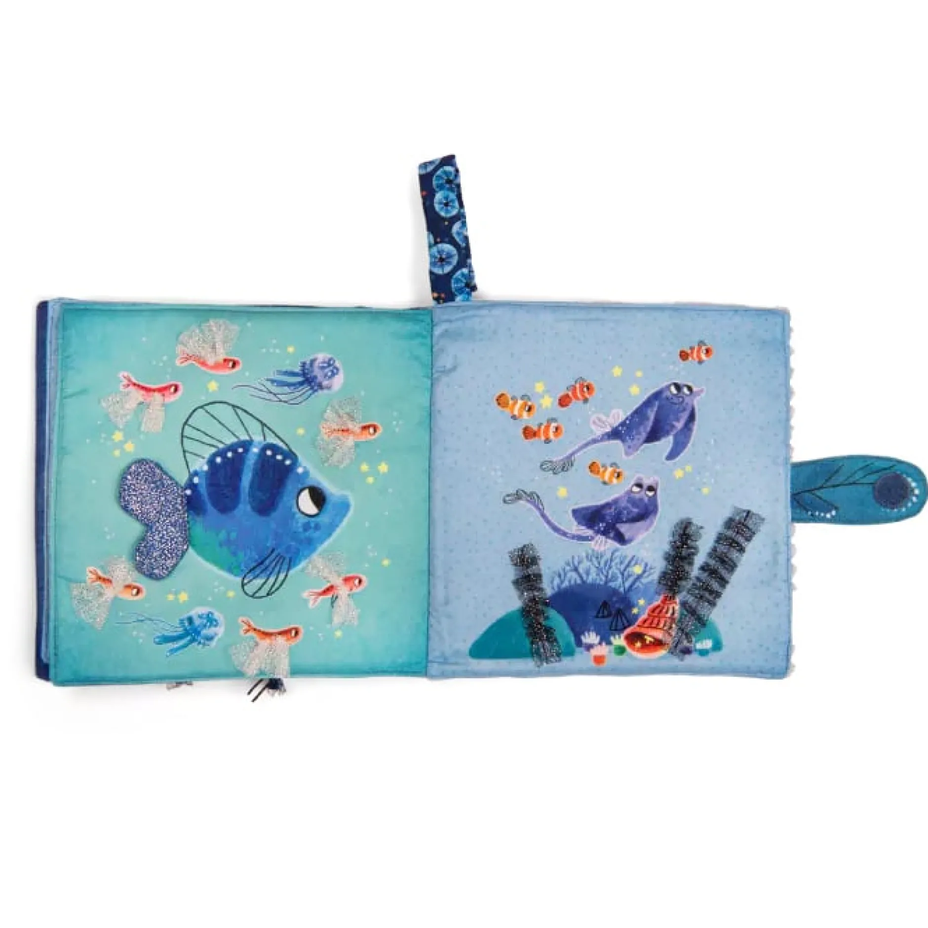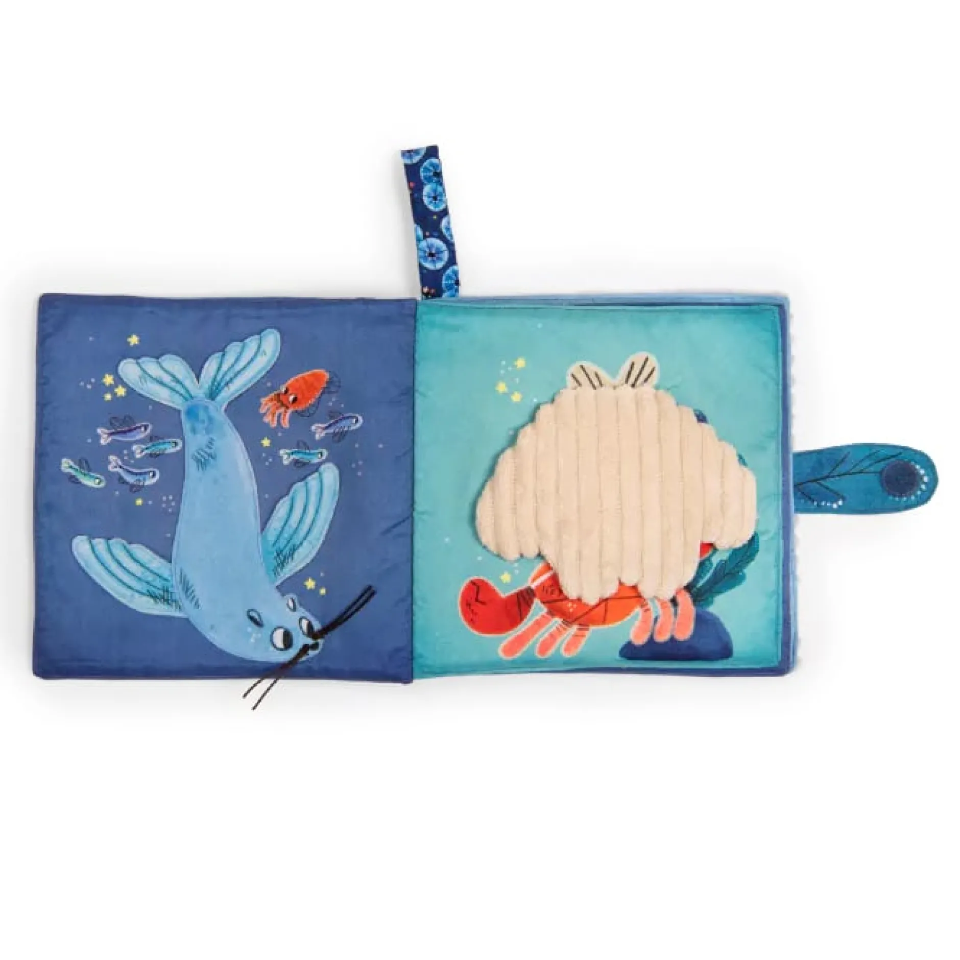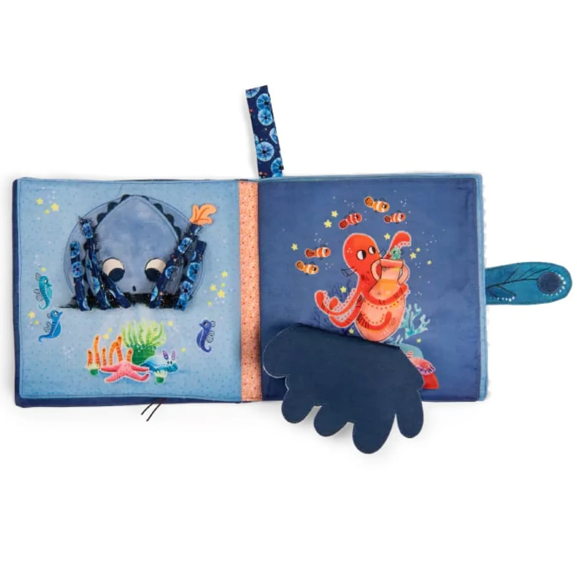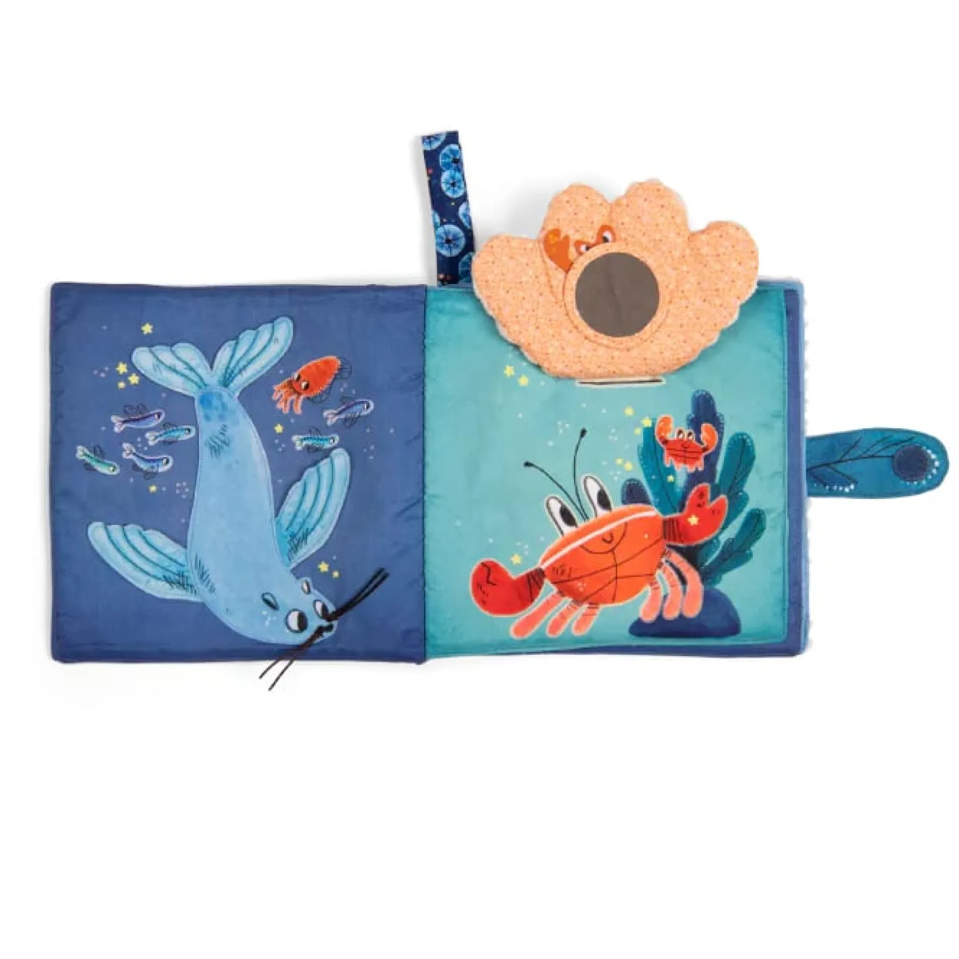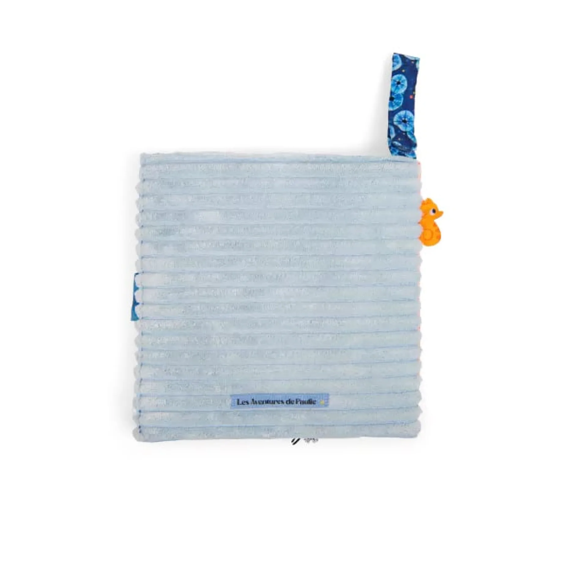 Livre tissu jouant sur les contrastes de matières et activités cache-cache intitulé Possède un système d’accroche