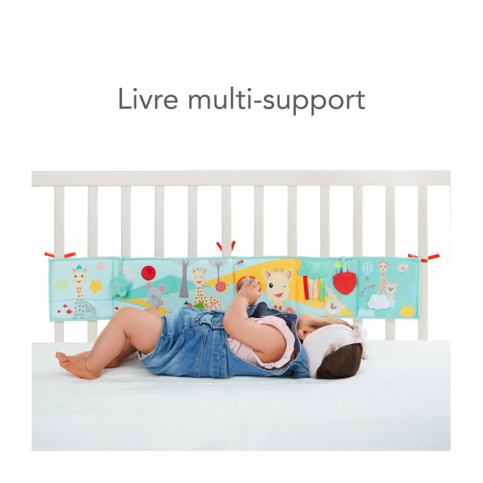 Malin, il peut être posé sur le sol, s’accrocher dans la poussette ou au parc grâce à ses liens à nouer.