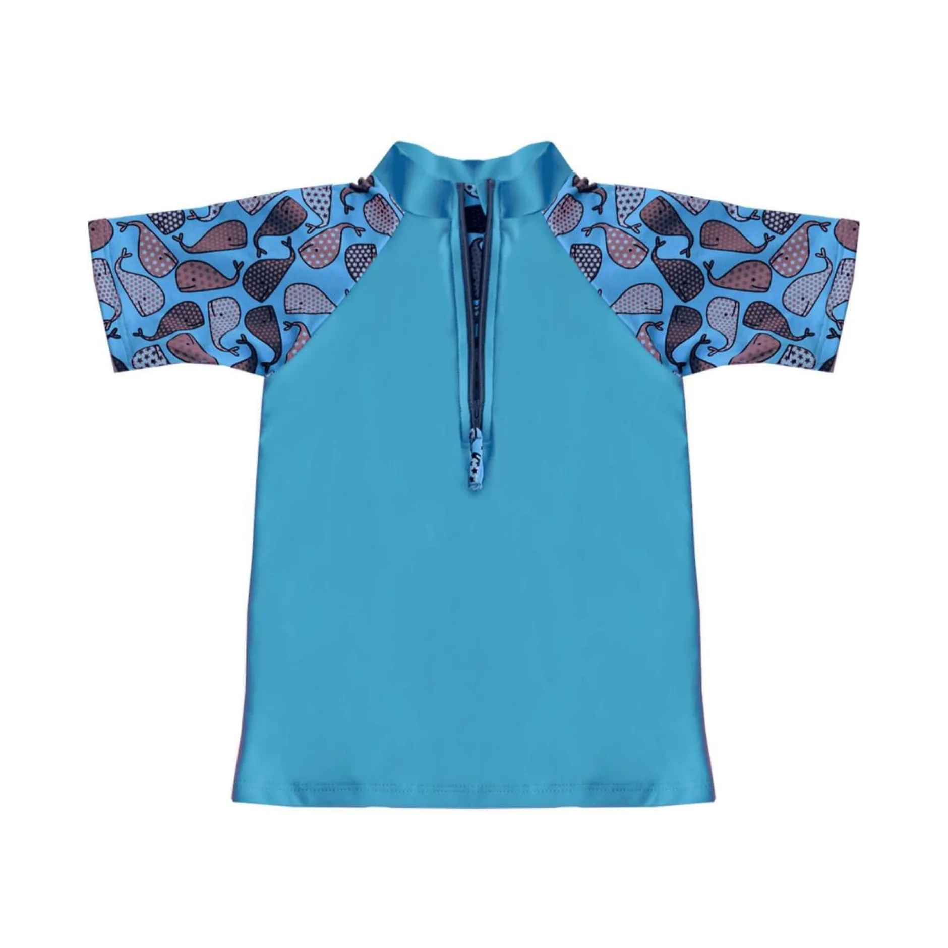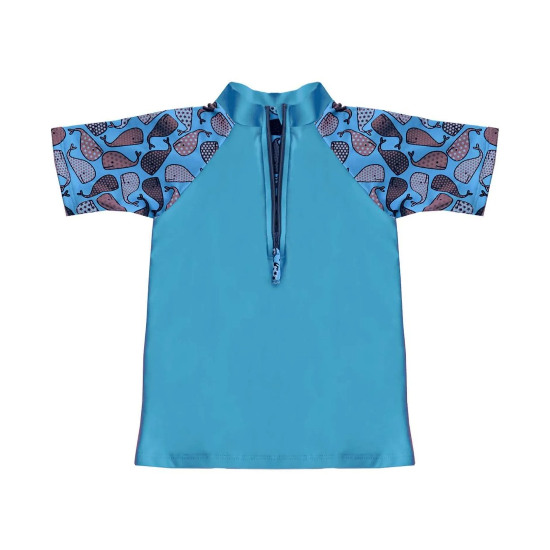 Ce beau t-shirt anti UV bleu à motifs baleines protégera votre enfant avec style ! Son tissu uni est recyclé et écoresponsable. Extensible, léger et qui sèche vite ; ce t-shirt est ultra confortable à porter, idéal pour jouer dans l’eau ou sur le sable. Un zip avant injecté permet un enfilage facile.