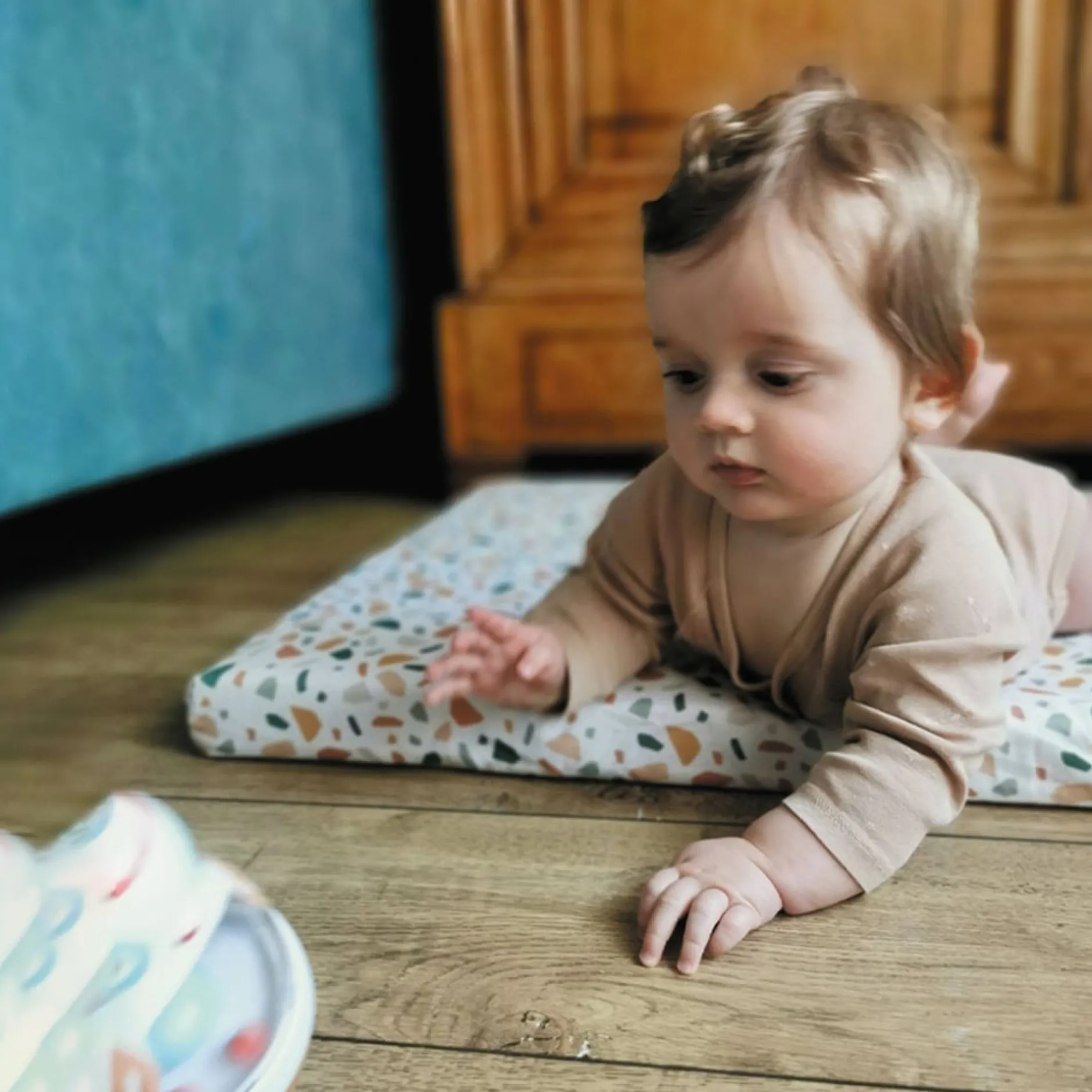 - Posez-le à l’extérieur : Positionné au sol, vous pouvez l’utiliser comme un tapis de jeu pour bébé. Le dessous PVC vous permet de le garder au sec et de le nettoyer en un tour de main. Le PVC a l’avantage de faire barrière entre le froid du sol et bébé.