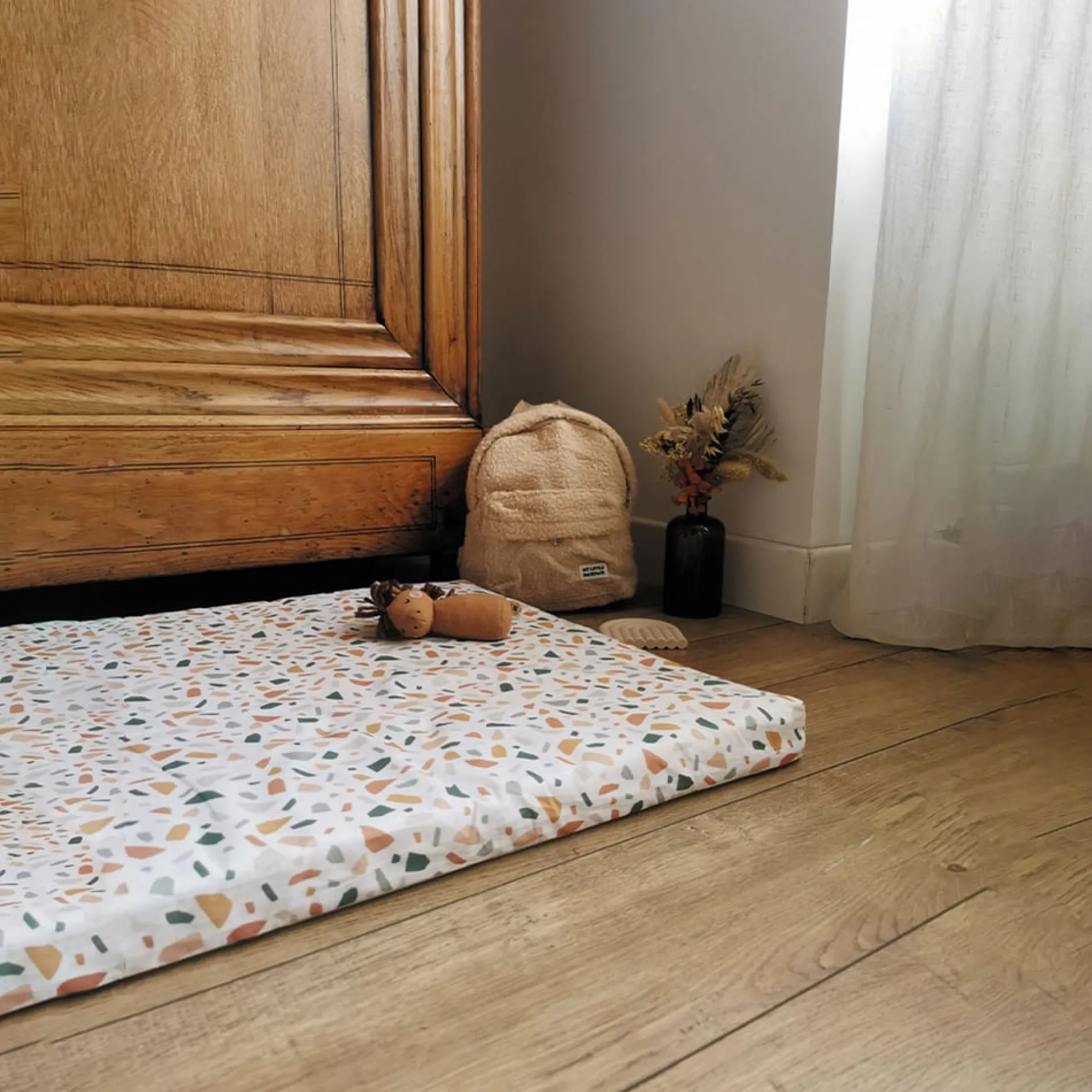 Envie de vous poser dans un jardin ou dans un parc en vacances, avec bébé ? Le matelas de voyage Candide répondra à vos besoins grâce à son dessous PVC imperméable. Vous pourrez facilement nettoyer le dessous du matelas nomade, en un coup d’éponge.