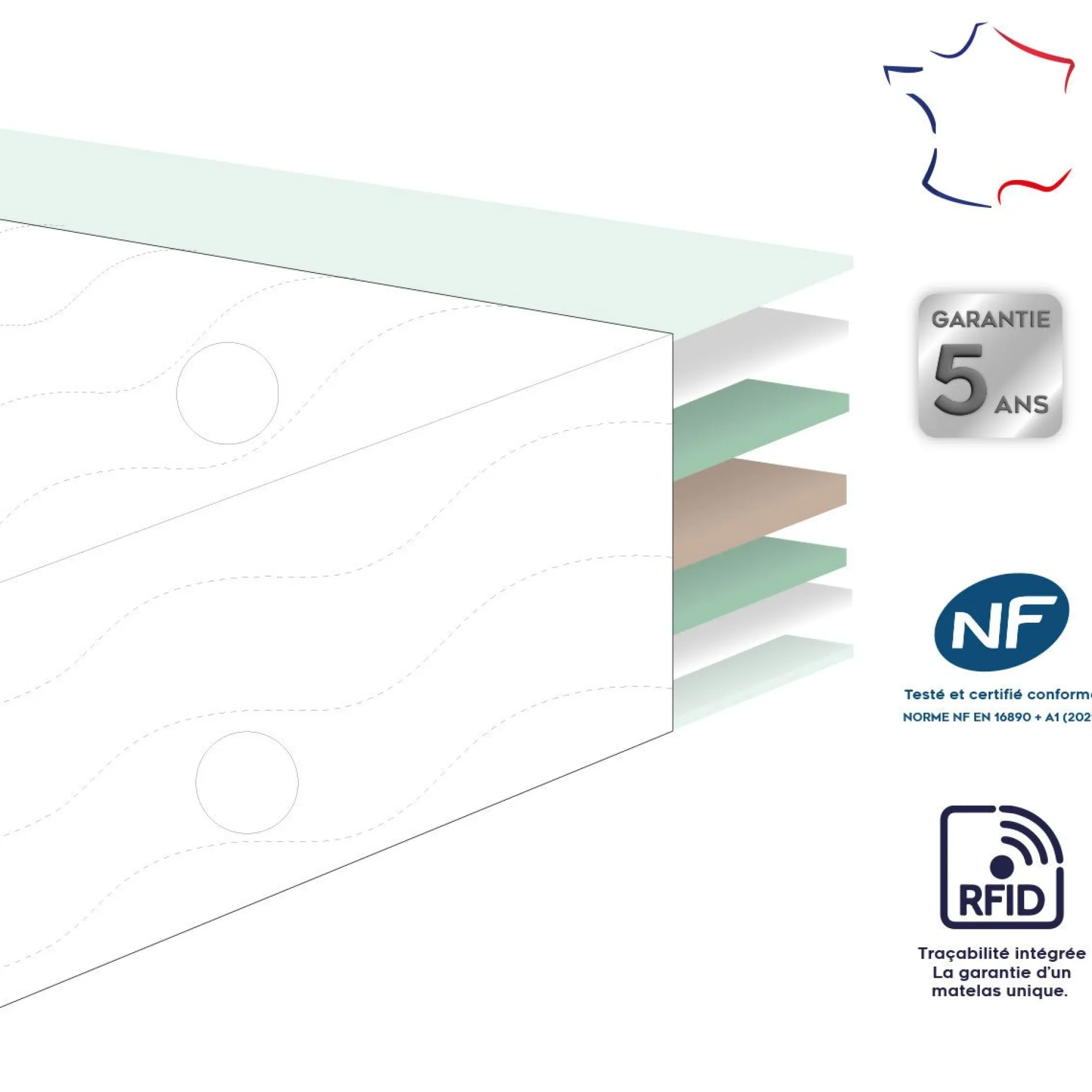 - Matelas pour lit enfant en matière de fibres recyclées et fibres de coco et de latex, ferme, respirant, déhoussable, 25kg/m3