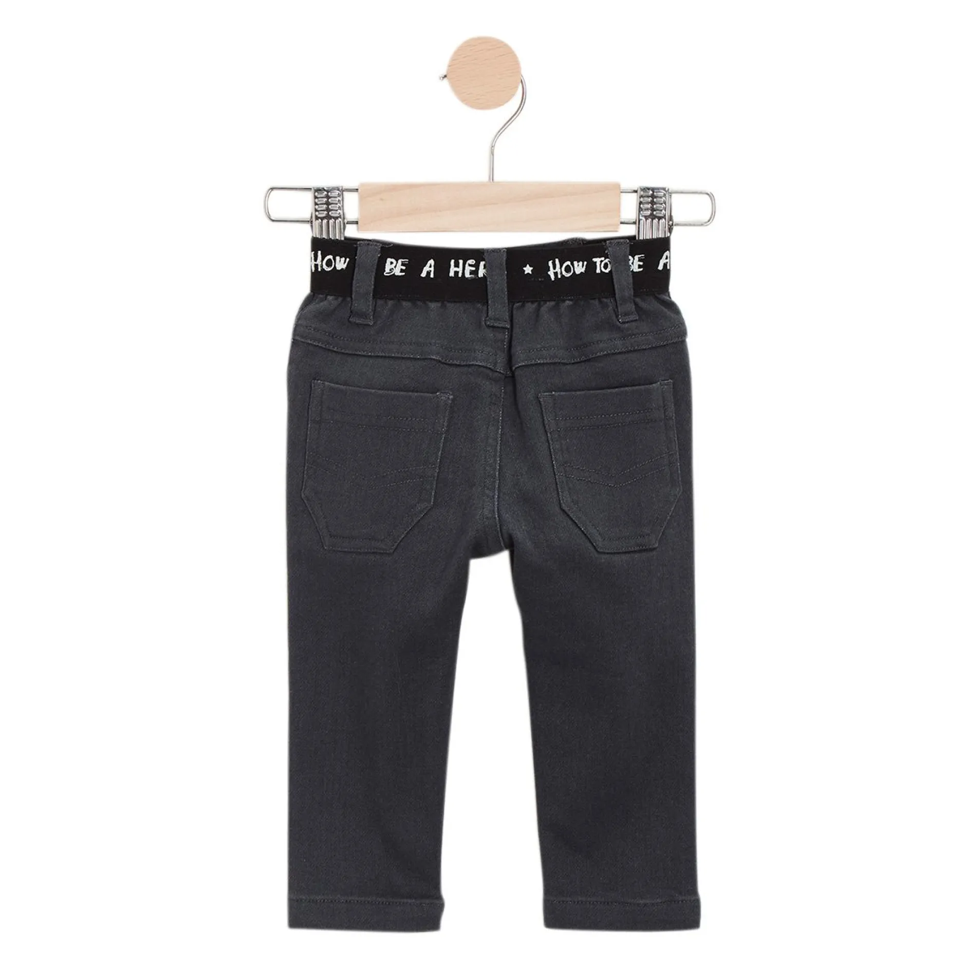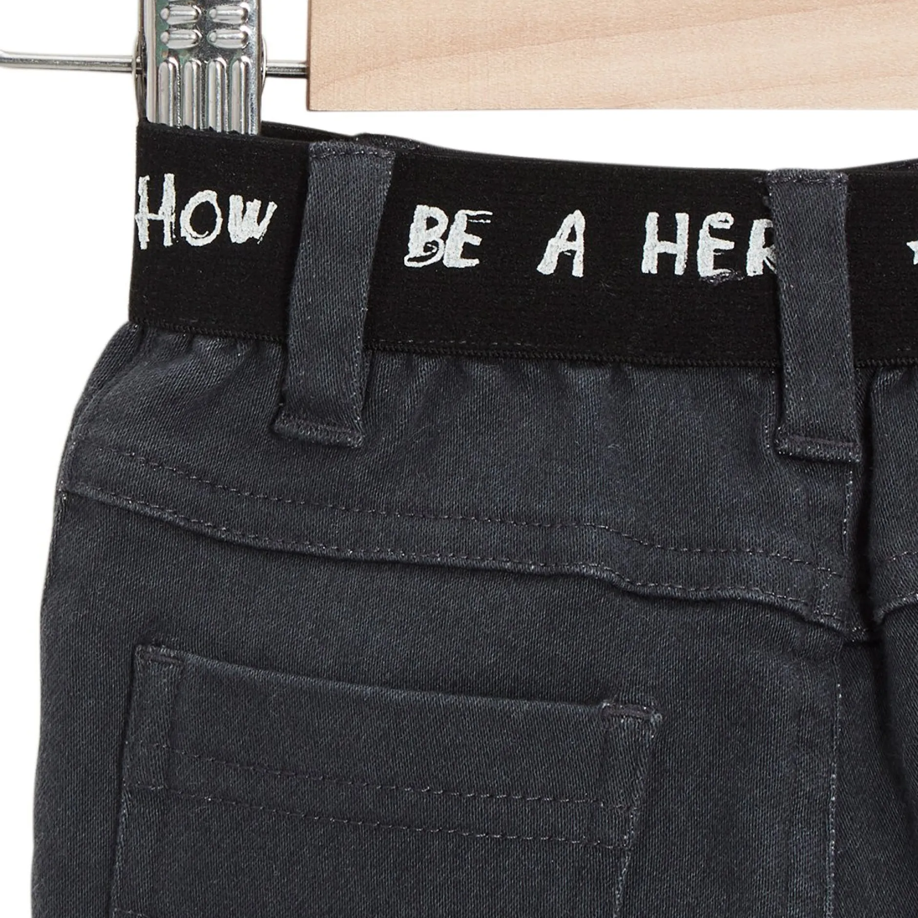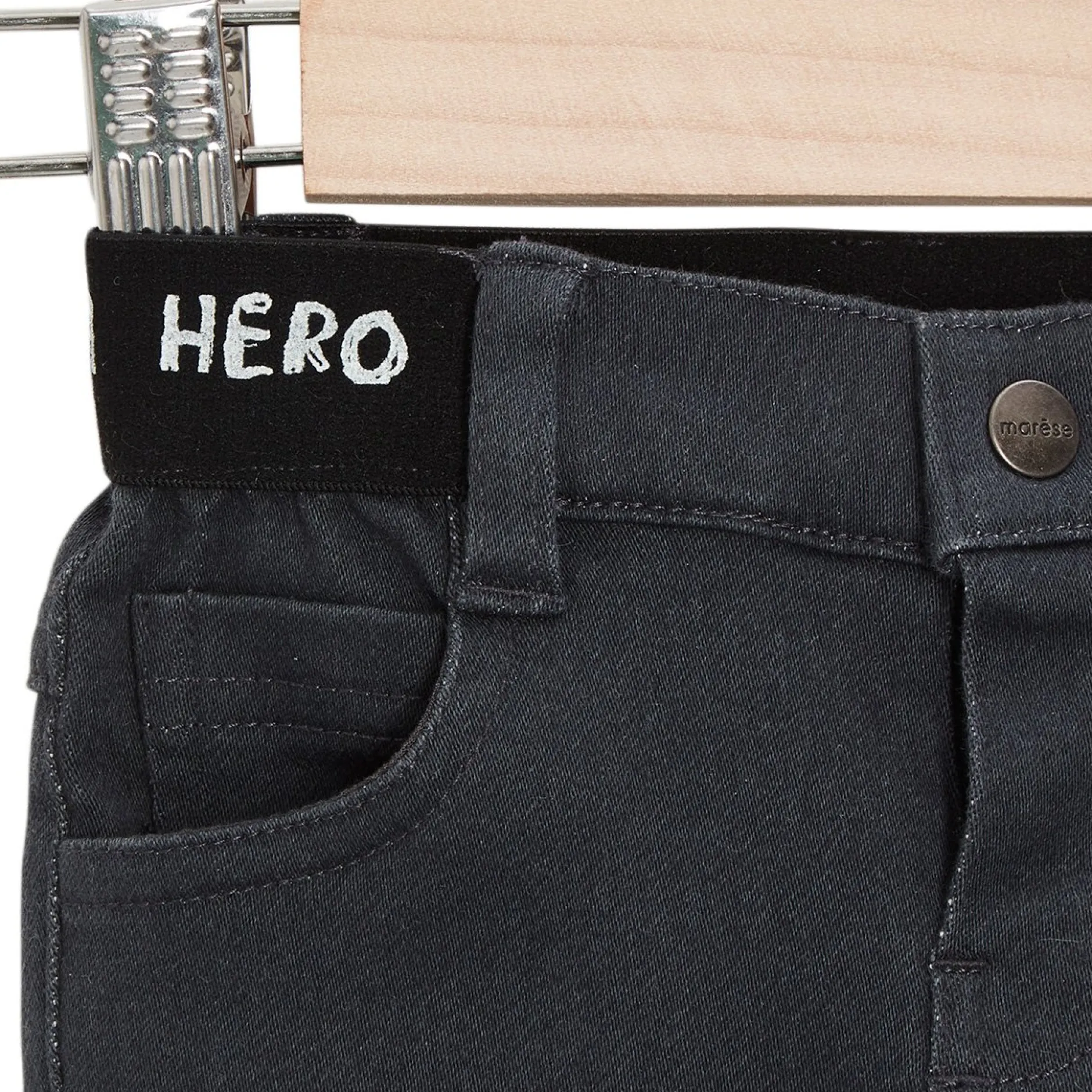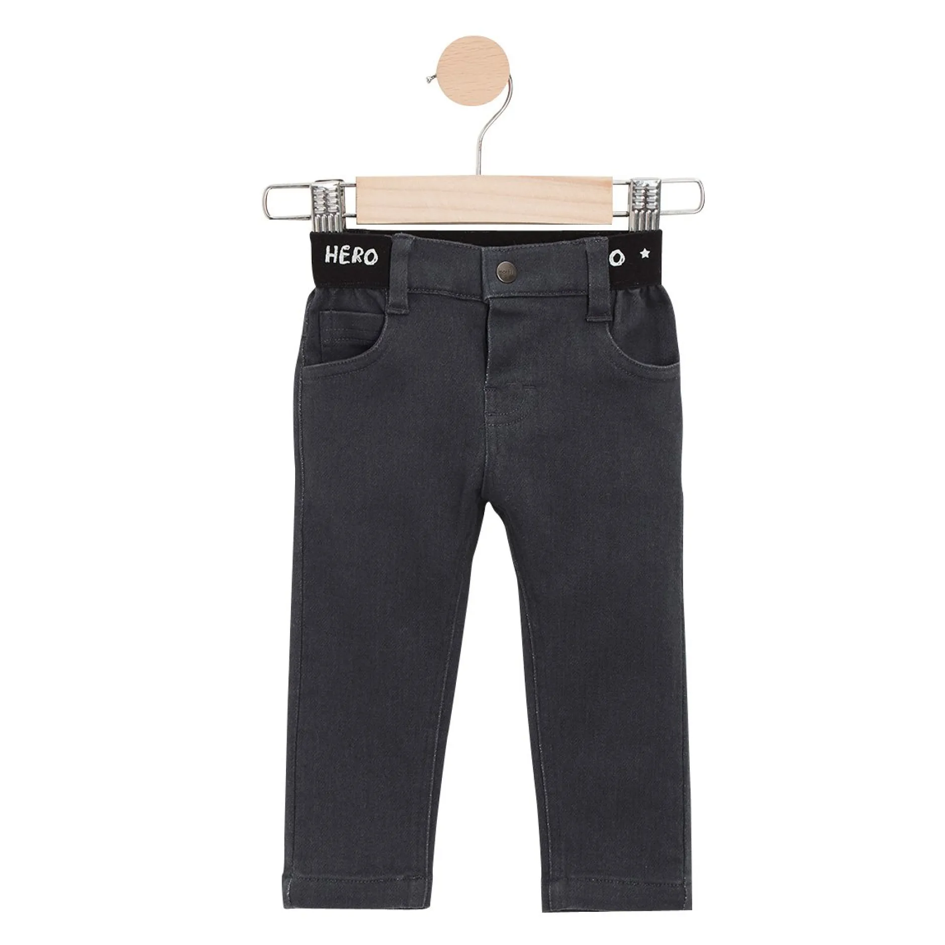 Pantalon Marèse en molleton effet denim noir. Ce pantalon a une matière très confortable pour le petit garçon dynamique jean pour un confort optimal ! Il a des fournitures gravées à la marque telles que boutons gravés « Marèse « . Très fonctionnel avec sa taille élastiquée et réglable par des boutons en intérieur. L’élastique à la taille est mode et tendance avec son impression texte « how to be a hero ». A porter avec un tee shirt dessus proposé dans le thème. C’est le pantalon qui va plaire à tous les petits garçons à la fois rock et actifs ! Lavage conseillé à 30°C.